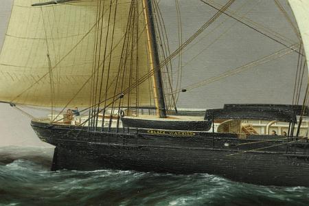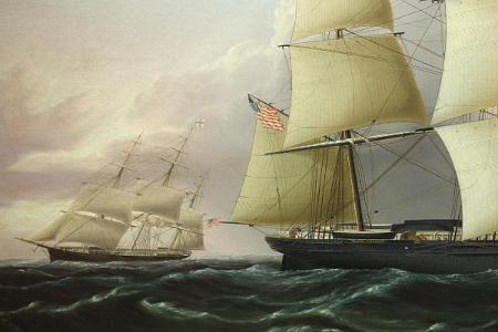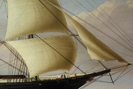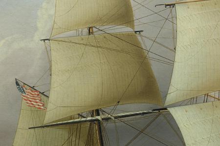 Provenance: The painting has been passed down through a Connecticut family for several generations. Accompanying the painting is a number of letters between members of the family as well as Mystic Seaport Museum and the Peabody Museum. There is also two letters from Rudy Schaefer regarding the painting. Mr. Schaefer was the author of the Buttersworth book listed above. These letters date back as far as January 1956.