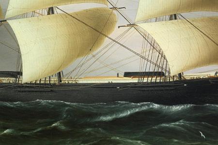 Reference III: Grassby, Richard B., 'Ship, Sea & Sky', New York: Rizzoli, South Street Seaport Museum, 1994. The frontispiece to this book depicts the clipper ship 'WITCHCRAFT'. The coloration and the rendering of the two vessels is extremely similar. On page 66, the Buttersworth painting of the 'DREADNOUGHT', which is in the collection of the Peabody Essex Museum and one of the most published and well known of the Buttersworth clipper ship paintings can not compare to this painting in terms of color, crispness, quality of light and condition.