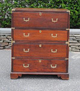 InformationMahogany two part campaign secretary, English, circa 1880. The desk is brass banded and has a flip-out brass carrying handle on both upper and lower surfaces. The secretary section and three drawers have flip-out brass pulls and center brass key escutcheons. The desk retains its original bracket feet. The top section slides forward and flips down exposing a black canvas writing surface. The back of the secretary has three drawers below six pigeon holes and a hinged centered door. The compartment behind the door has two secret wood document pockets. (F-507) Condition: The wood and brass have been cleaned and polished. Dimensions: Width 32 7/8 inches; Depth 14 3/4 inches; Height 40 inches.