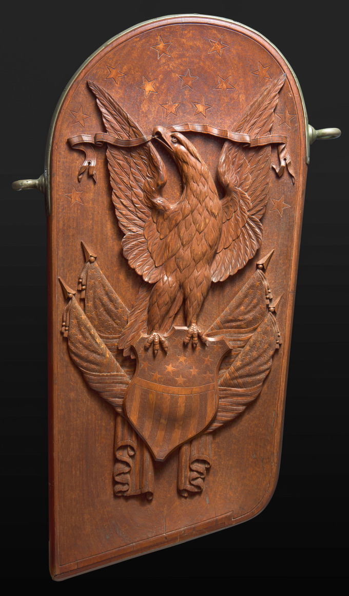Exemplary pair of mahogany carved gangway boards that were probably used on board a vessel of the United States Navy attributed to the master carver, John Hale Bellamy. Gangway boards were large decorative plaques that lined the opposite sides of the ship’s gangway (the walkway providing passage to the ship) located around the middle of the hull. Each of the matching gangway boards has the typical shape with an arched top, lined with brass with applied brass “rope rings” on opposite sides. Each carving is rounded on one bottom corner and straight on the other. One gangway board has a deep raised carved eagle perched on an American shield flanked by two carved American flags, above draped curtains at the bottom. The other has a deep relief carved spread winged eagle with carved wavy ribbons flowing from each talon and a large carved Indian warrior below standing on rocks holding a tomahawk. All the uncarved flat surfaces of the gangway boards have a stipple even surface throughout. This is a method Bellamy used on the the pairs of gangway boards he made for the USS Enterprise and other carvings with flat surfaces. The eagle and shield gangway boards has many distinctive features.