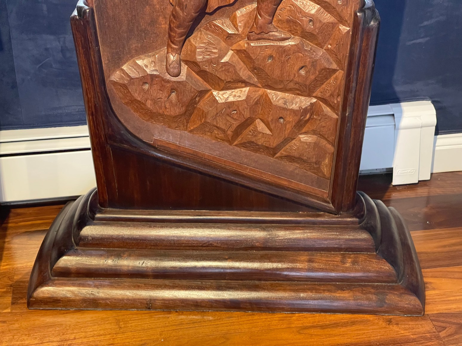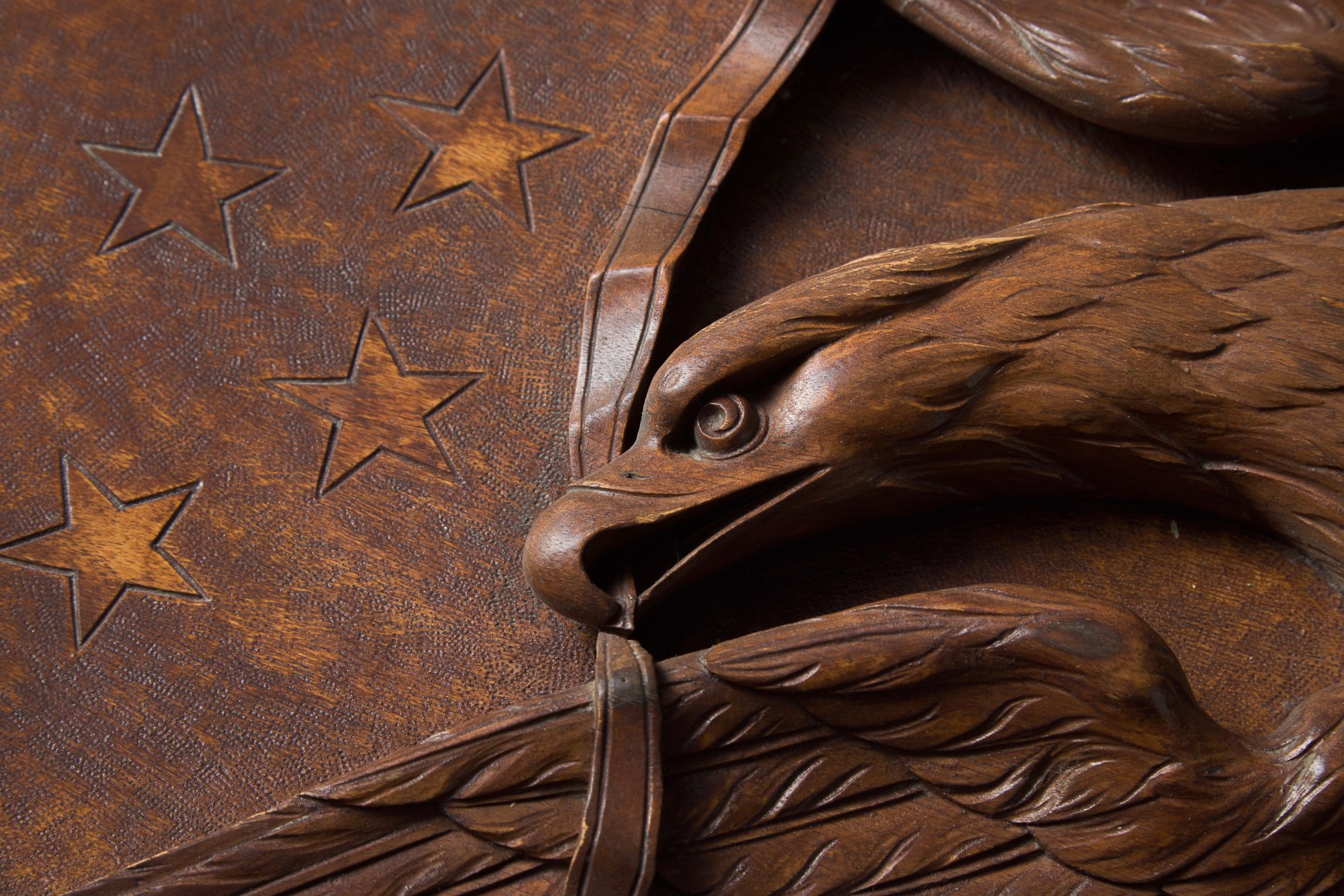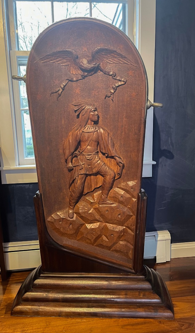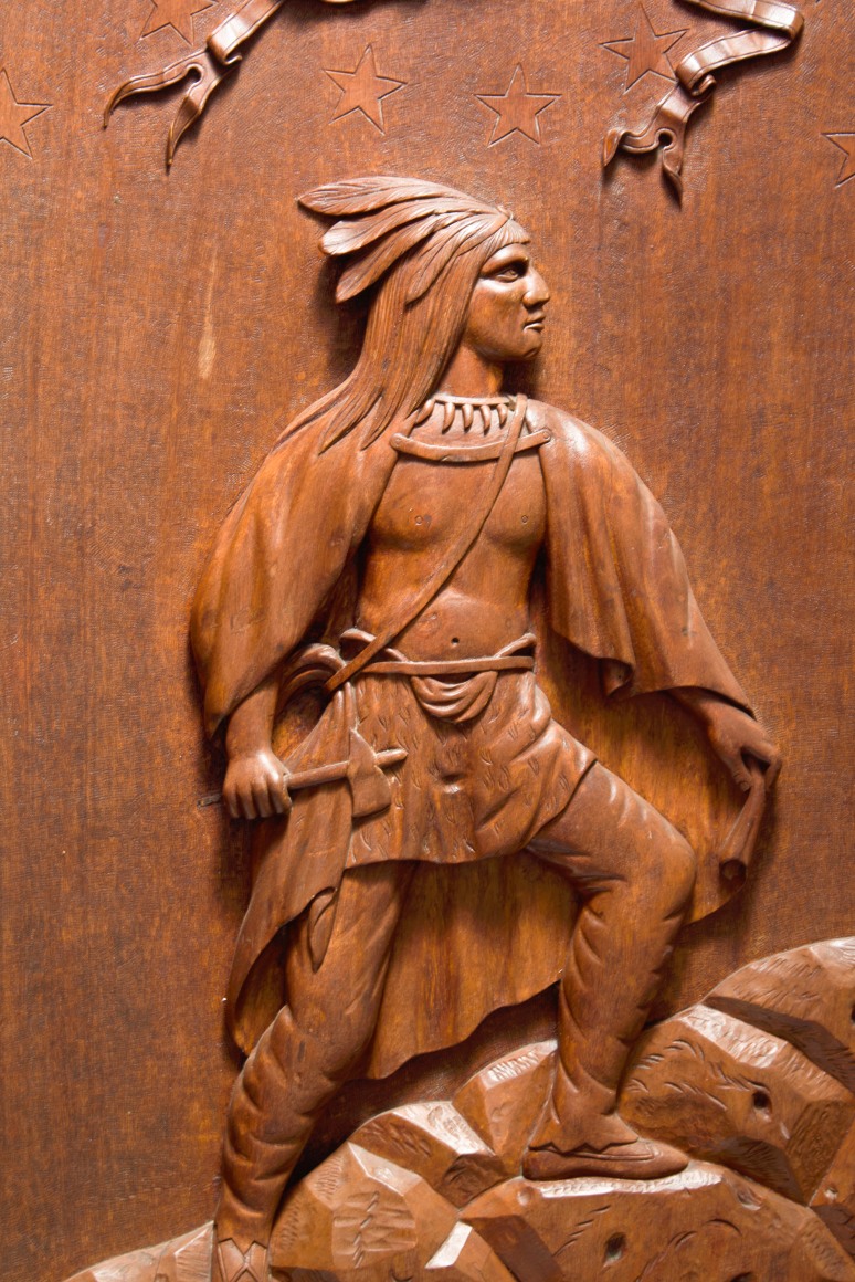 The right facing gangway board features at the top a spread winged eagle with his neck turned facing left. The eagle’s head is well detailed with highbrow with defined eye and beak. The beak is holding a ribbon that flows left and right and then turns down with split ends. Encircling the eagle are 13 incised five-pointed stars similar to the stars on the other gangway board. Below the eagle is a deep relief carved figure of an Indian warrior holding a tomahawk and standing on a hill of carved rocks. The Indian is wearing a detailed bear claw necklace and a feathered headdress.