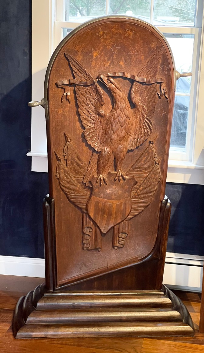 Reference 2: “John Haley Bellamy Carver of Eagles” by Yvonne Brault Smith, published by Portsmouth Marine Society, publication I, 1982, page 36 shows a photograph of Bellamy’s studio. In the photo is a Bellamy eagle with wings up, head turned, and below an American flag and shield. The composition very similar to the eagle on the left flanking gangway board.
