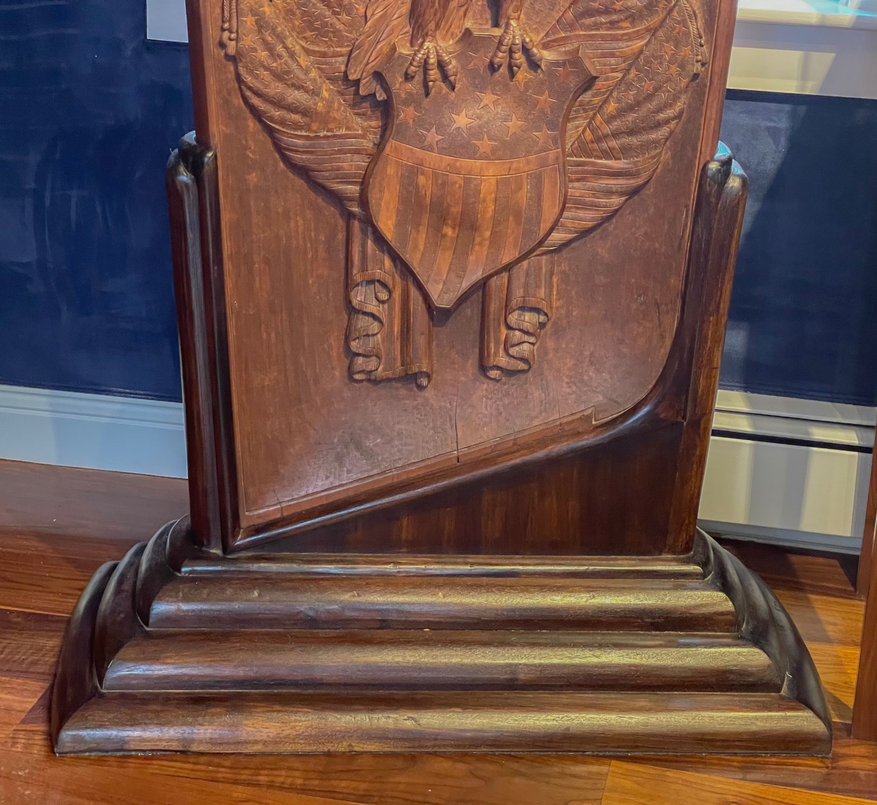 The left facing gangway board features an eagle perched on the shield and has several distinct details. Above the eagle is an array of incised five pointed stars and on the sides below the wing tips are additional stars totaling 13. All the stars internal surfaces are smooth which contrast with the stipple surface surrounding them. The eagle’s left facing raised head is very well articulated with raised detailed eye and pronounced brow that sweeps back from the eye and down the neck with a defined open beak holding a folded ribbon that expands left and right and then turns down and has a split end. The eagle’s wings are raised and the carved feather on the wings is stylistically different in style than the feather carving on the neck and chest. The legs have similar style leg feathers, and the tail feathers are carved at an angle and located behind the right leg. The eagle’s claws and talons are raised clutching the top of the American shield. The shield has a serpentine shaped top and sides that wind around and come to a point at the bottom. The shield is divided into two sections with an incised double band. The top section features 13 smooth five-pointed stars. The lower section has 12 vertical stripes with alternating dark and light stained sections. The surface of the shield has a slight wave like roll to its shape going from top to bottom. Flanking the shield are a pair of American flags set an angle facing out. Each flag has a spear shaped pediment with a draped pair of cords with tassel ends. The canton of each flag has multiple rows of five pointed stars. The flag is folded and the stripes with light and dark adjacent stripes wrap around and terminate along the surface of the shield. Below the shield are a pair of draped and folded raised carved curtains.