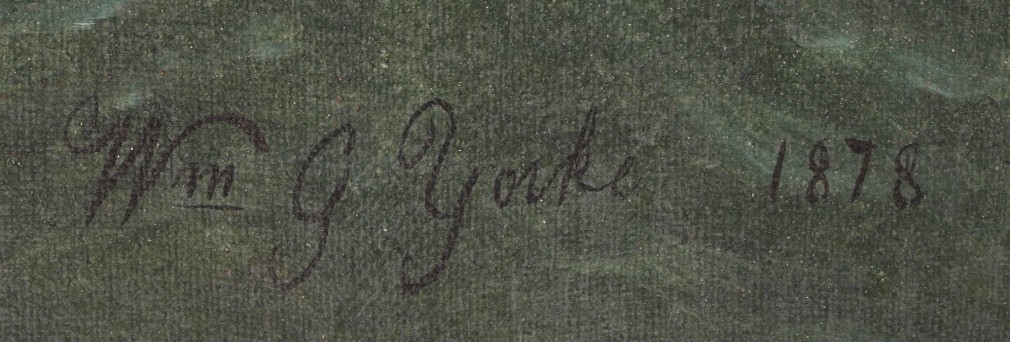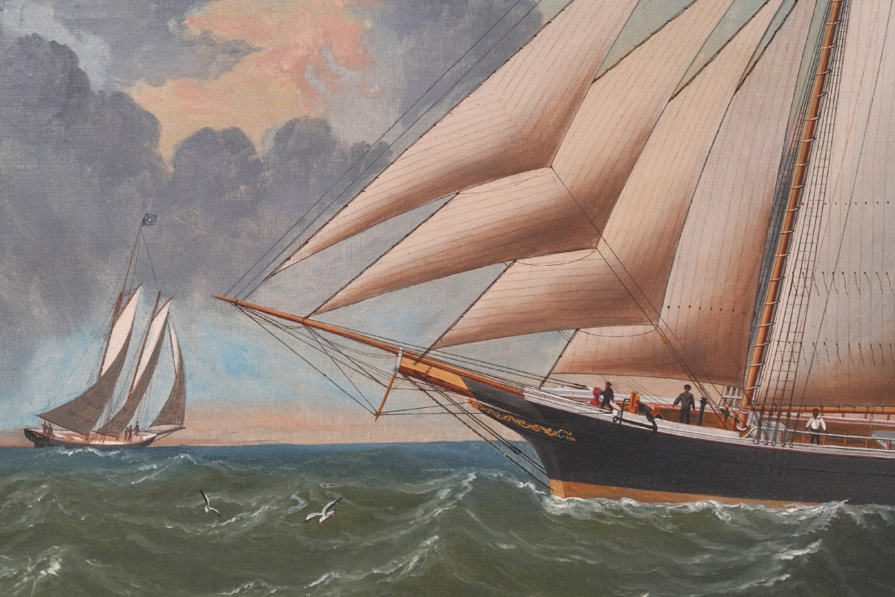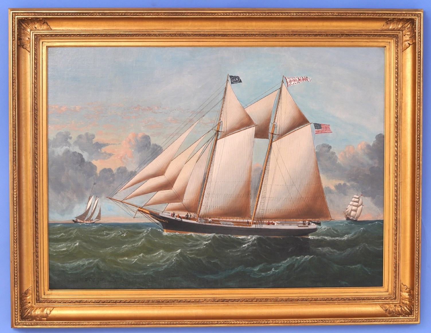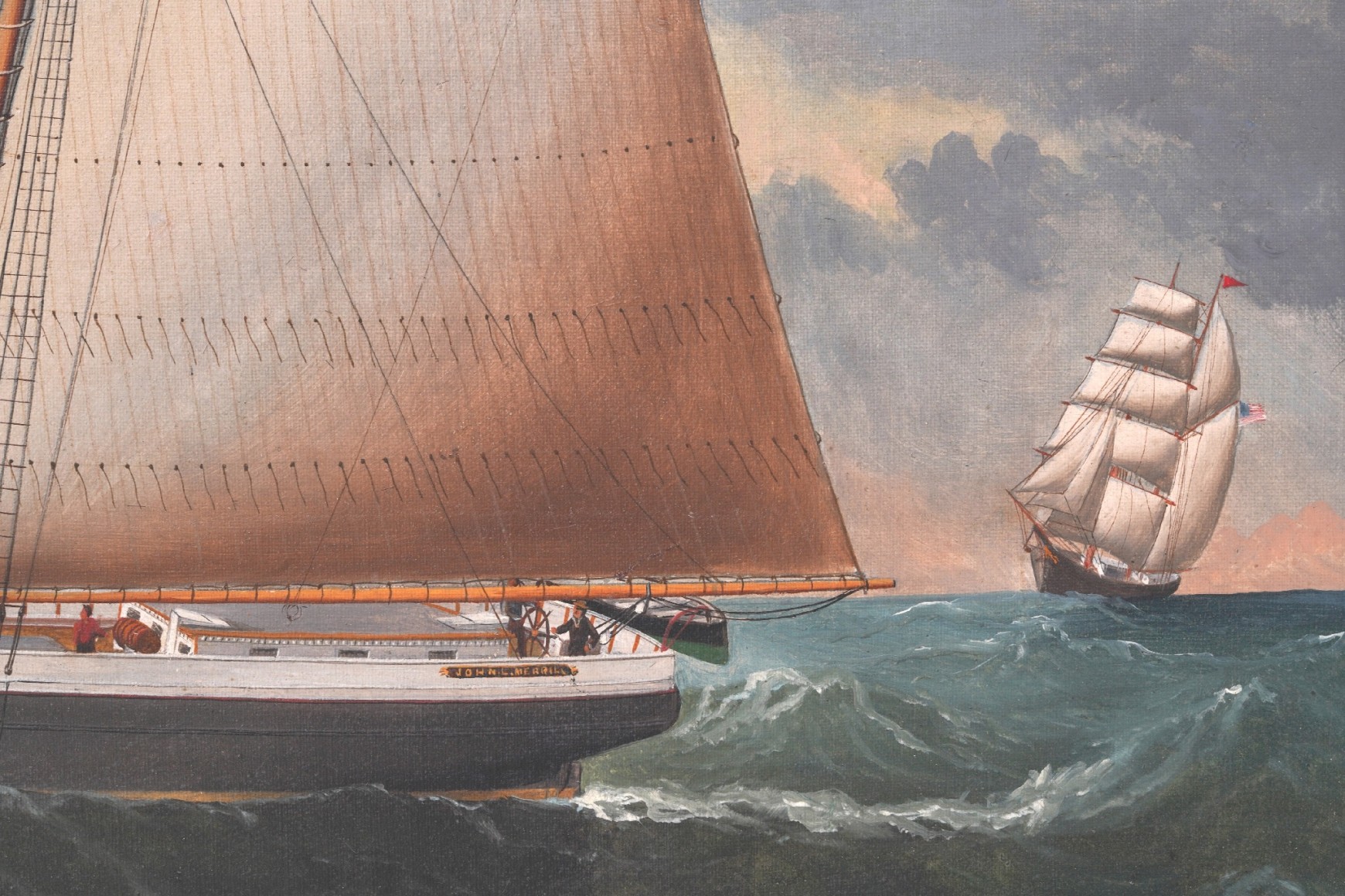 Oil on canvas portrait of ther American two masted Schooner John L. Merrill Signed and dated lower left ""Wm G. Yorke 1878"". The appears to be a bright and sunny day with good breeze filling the bellowing sales. The painting is one of York’s better American works and shows the vessel in excellent detail. The standing and running rigging are very accurately rendered as is the hull and deck. Flying from the top of the fore mast is a blue flag with the vessel’s initials “JLM” From the main mast is a triangular white banner with the name John L. Merrill written out and flying off the gaff is the American flag.