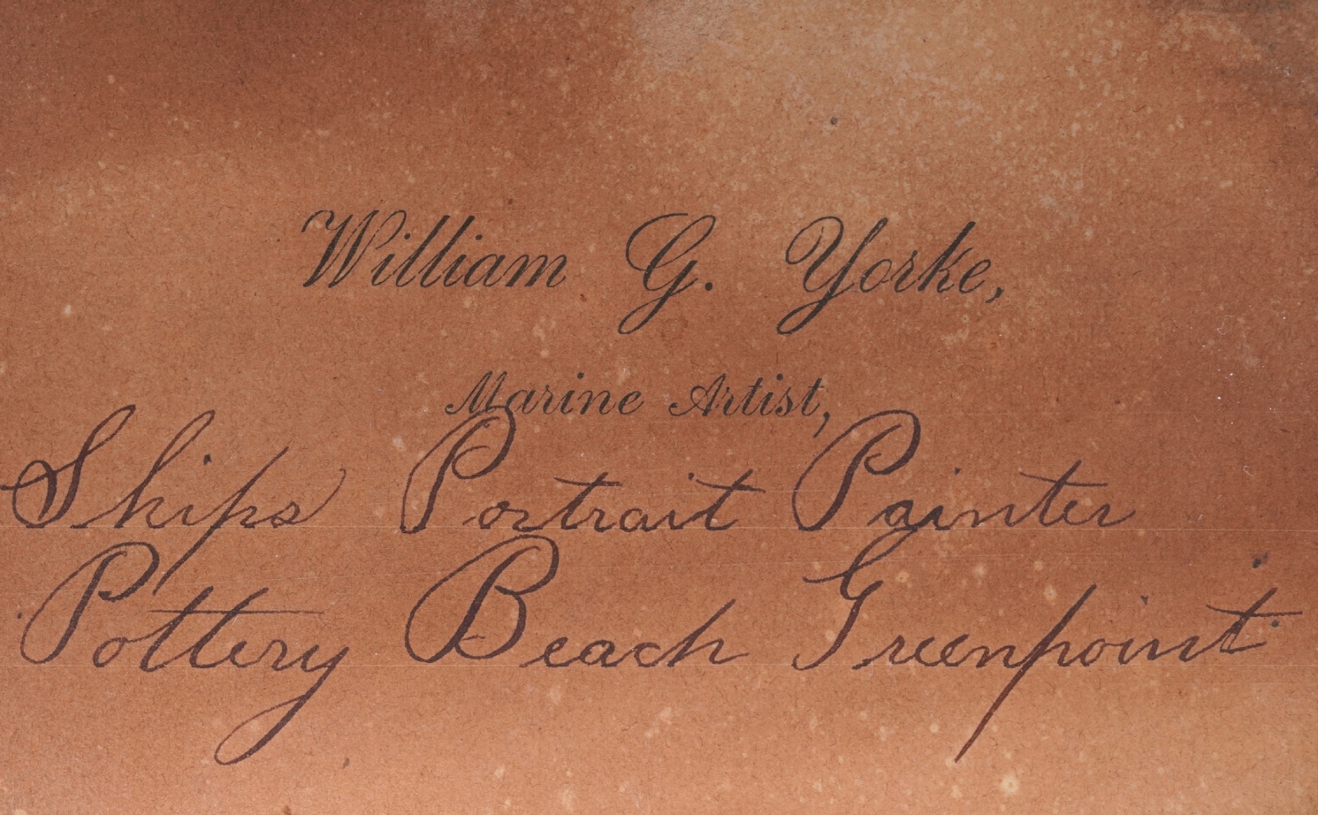 At the horizon to the left is a two masted schooner and to the right sailing toward the viewer a two masted Brigantine. There are six crew members spread around the deck including a black man by the rail just aft of the fore mast. Attached to the back of the frame I William G Yorke’s printed business card with the hand written notation “Ship Portrait painter”