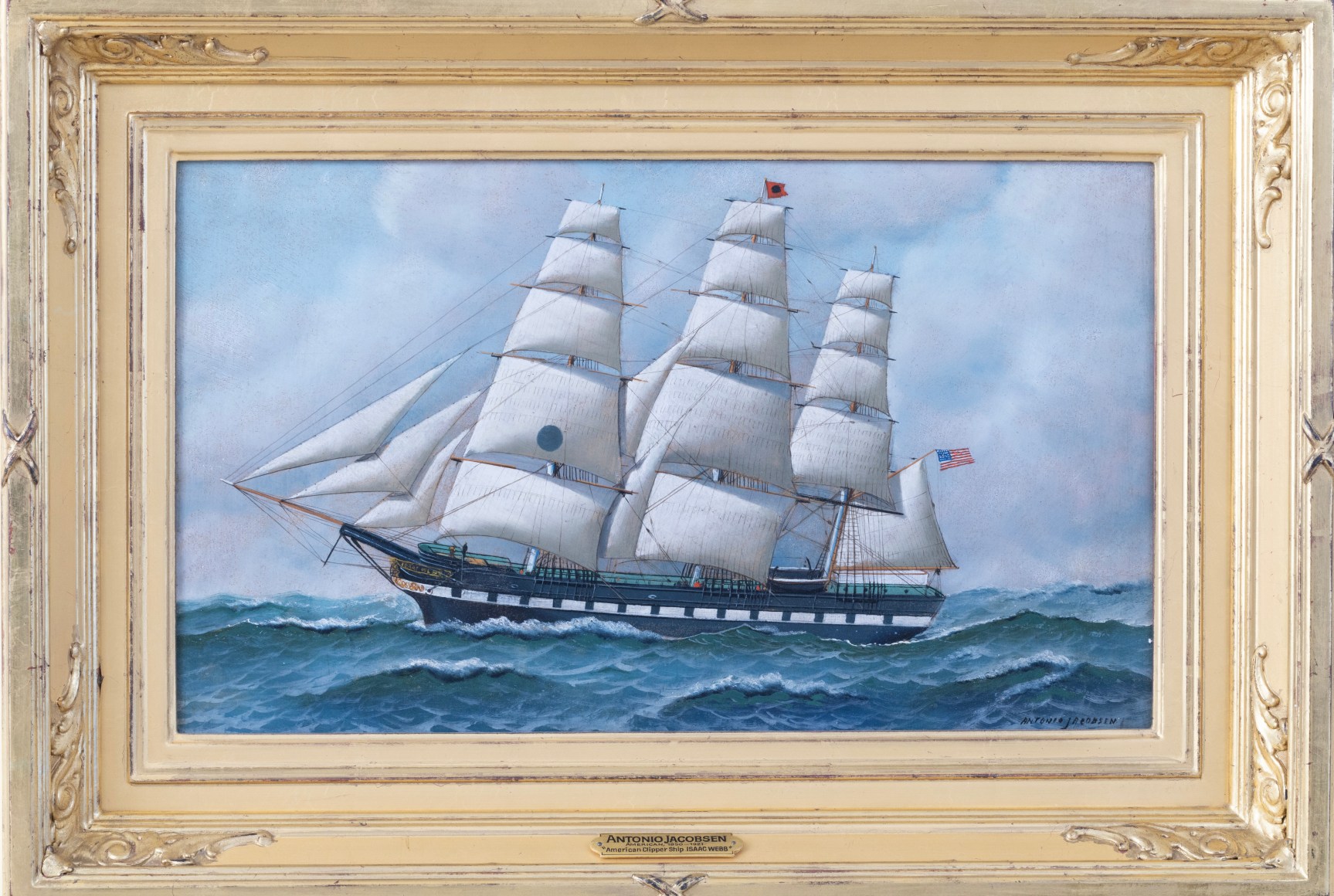 Portrait on board, of the Black Ball Line ship 'Isaac Webb', signed lower right "Antonio Jacobsen" circa 1915. The ship is sailing under full sale and she is flying from the peak of the mainsail the Black Ball Line House flag or the owners the Black Ball Line. She is flying the American flag of the gaff near the stern. It was standard for the ship's of the Black Ball Line to have a large black ball painted on the the second sail up on the fore mast. The bow of the ship has a yellow painted billet head and trial board. Just back from the bow is a quarter board bearing the vessel's name "Isaac Webb".
