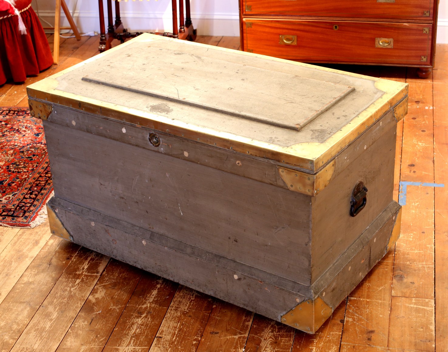 The chest is American last quarter 19th century. The exterior of the chest has the original gray paint. The chest retains its original brass corners and side mounted carrying handles. The interior with mahogany, rosewood and maple marquetry inlay has burlwood panel inlaid on interior of lid. Lid attached with iron hinges. One side of interior has five sliding drawers; the other with lift-top compartment. Brass casters are applied to bottom of the chest. The inlay on the lid as well as the inlay of the sliding-lift-out compartments are exceptional. The chest still has a number of tools of various types in the interior.
