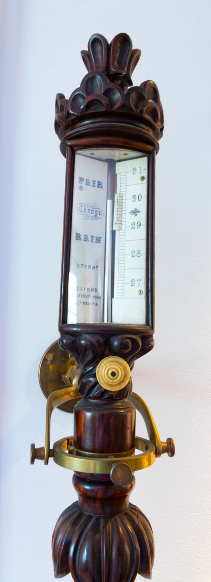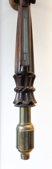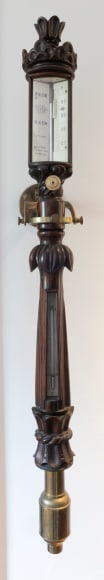 Carved mahogany ship's barometer, signed Cairns, Liverpool, England, circa 1850. The barometer has a carved crown above a carved crown above the ivory scales which are signed Cairns, 13 Waterloo Rd, Liverpool. The glass in front of the scales is bowed. The remainder of the stick is beautifully carved in the form of pedals, triangular flutes, above what looks like a carved napkin with rope carved napkin ring holder, above the brass cistern. Along the shaft is a frame molded thermometer with ivory scale. (I-166) Condition: The barometer is in outstanding condition and has a replaced tube and a later brass gimbal.