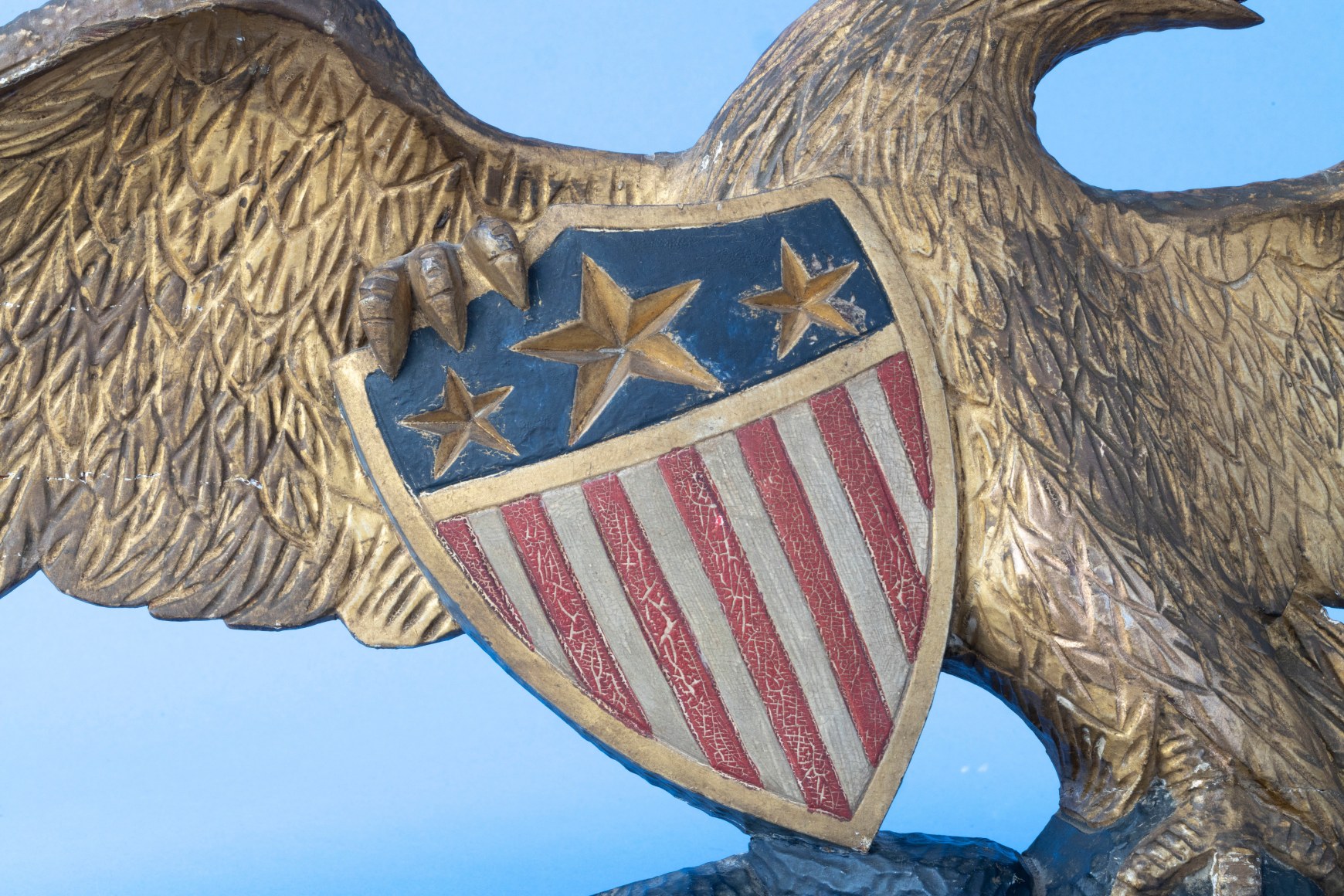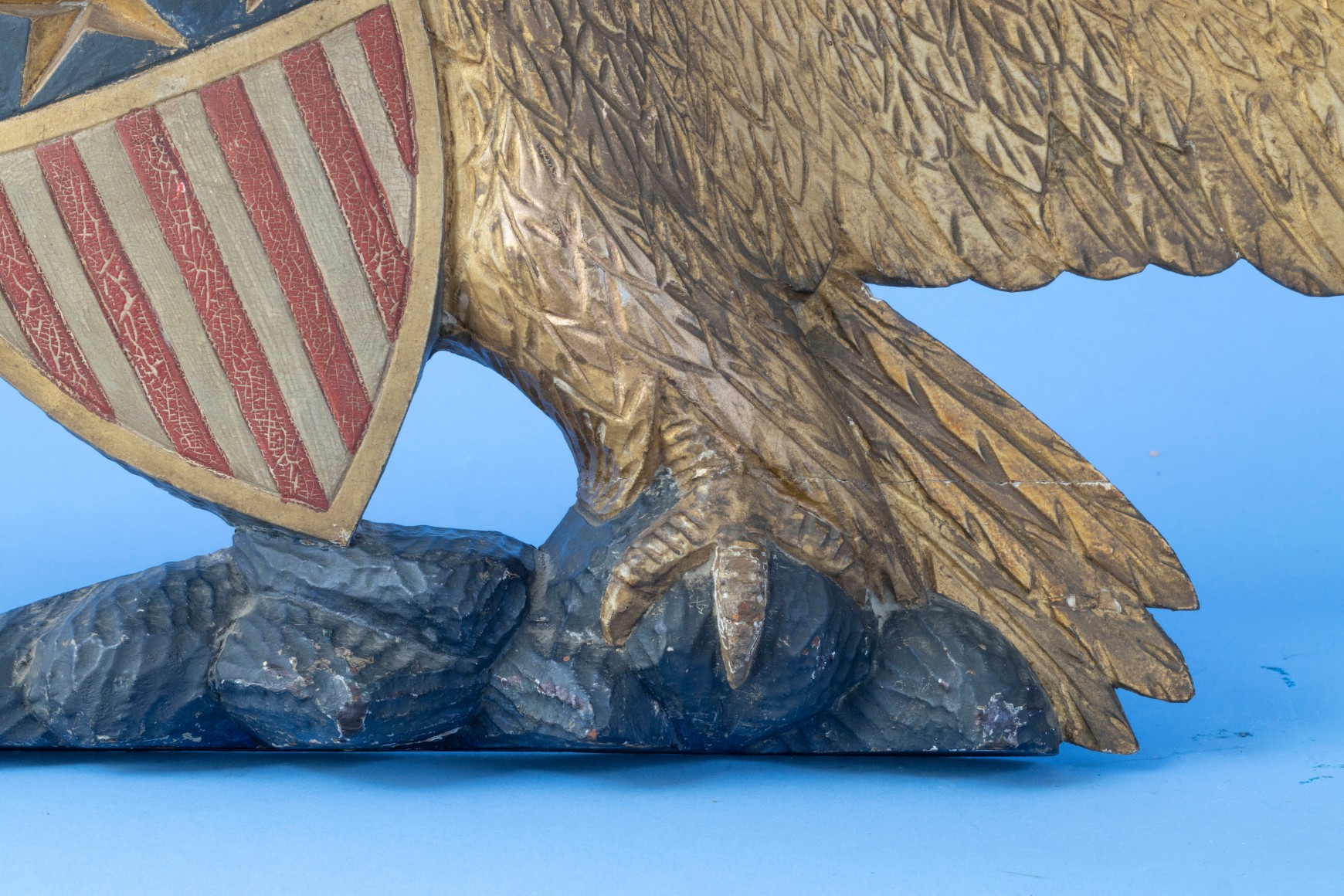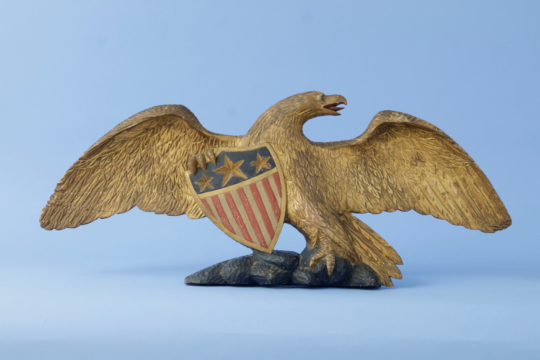 Carved Gilded and Painted Eagle with Caved American Shield Attributed to J. Nabor circa 1870. The eagle is in the form of a typical stern board even though it is much smaller and was created to be a wall plaque similar in size to most Bellamy eagles. The eagle’s head is very well defined and detailed. It is turning to the right and has a realistic brow and eye and the carved beak is also very well-articulated with a red painted tongue visible inside the open beak. The wings are spread and the feathers on the wings and chest are very well articulated. To the left of the chest the right talon is holding a detailed America shield. The shield has a large incised five-pointed star in the center flanked by two similar carved but smaller stars. The shield has a gold leaf border. Below the border are thirteen alternating red and white stripes. The tip of the shield appears to be resting at an angle on the base which is carved to look like a stone base that is painted black. The eagle's left talon is resting on the rocks. Behind the base on the right are long incised gold leaf tail feathers. The back of the figure is finished with a pattern of small gauge marks.  (FA1136)