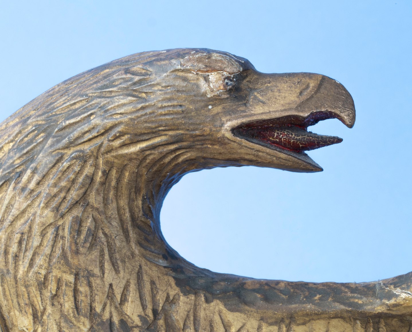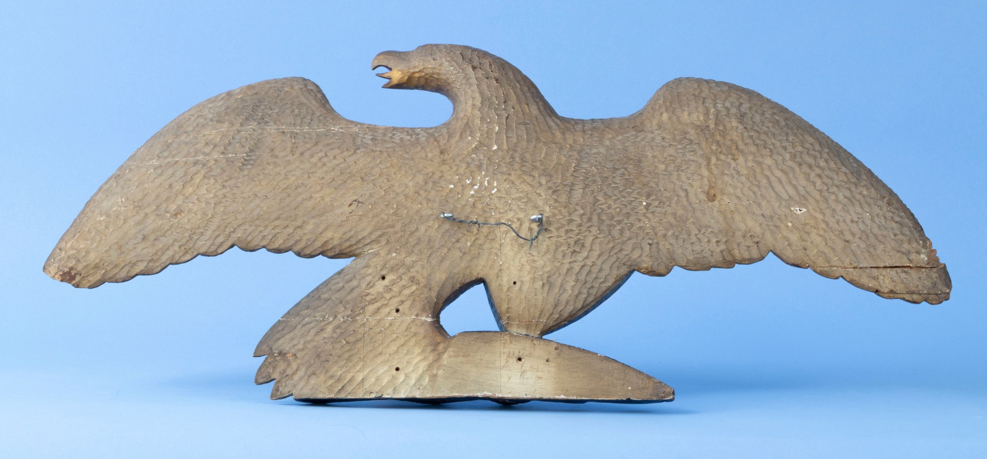 Condition: The Eagle has a wonderful untouched original condition. The gold leaf as a mellow age patina and the painted surface has a gentle craquelure surface. There is a repair to the end of the left facing wing. The tips of the wings have a small wood loss to the edges.