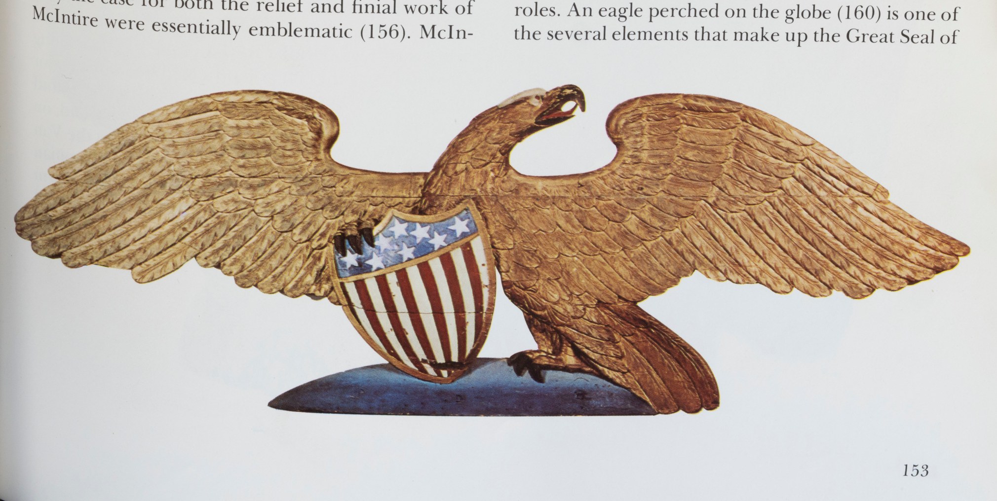 Reference:  Isaacson, Philip M., "The American Eagle Boston, Massachusetts:  New York Graphic Society, 1975, p.153.  An almost identical eagle in form is illustrated on this page. It was attributed to J. Nadar of New Orleans, Louisiana circa 1870.  The caption below the illustration of the eagle states “By the mid-19th Century this form became the standard for larger stern board eagles. There is a marked relationship between the Nadar’s work and that of the New England carvers work in Portsmouth New Hampshire,”