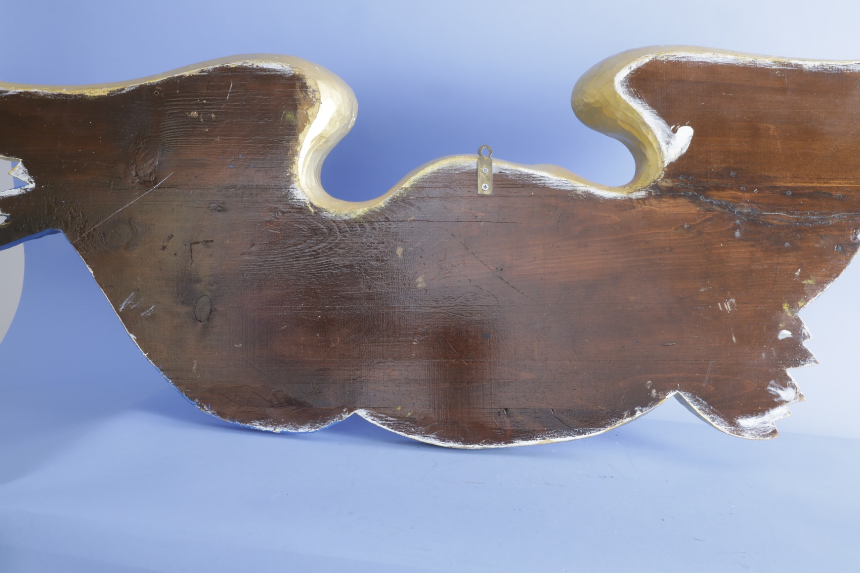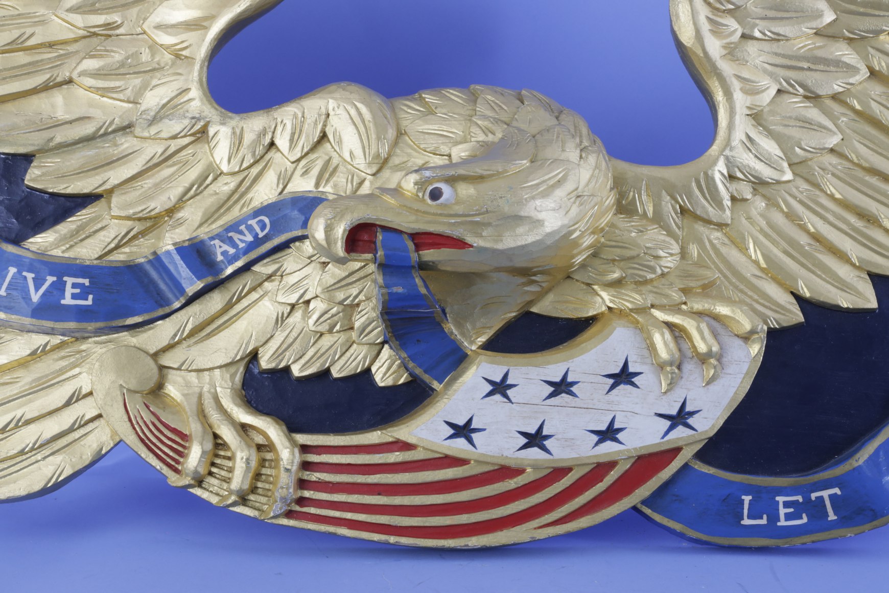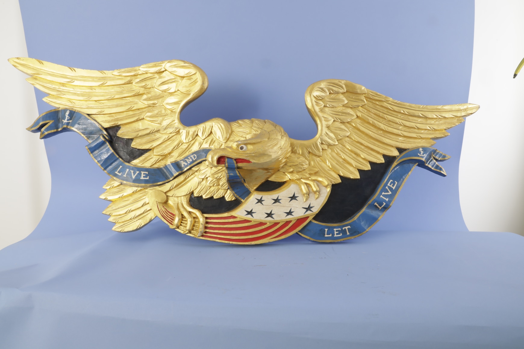 Carved and painted and gilded spread wing eagle by the Artistic Carving Company of New England, American, circa 1950. The eagle has been finely carved in excellent detail. The head is turned and in its beak is a blue banner with the titled caption “Live and Let Live” with an anchor at the beginning and end of the banner. The eagle has large defined claws holding a red, white and blue curved American shield. (FA1148)