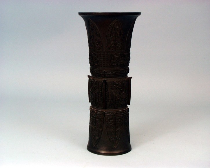 Chinese bronze vase, circa 1880.  The vase has an elaborate pattern with a variety of designs.  It has a slight flare to the base and a dramatic flare to its top.  At the bottom of the vase are several lines of Chinese writing. (Mis-105)