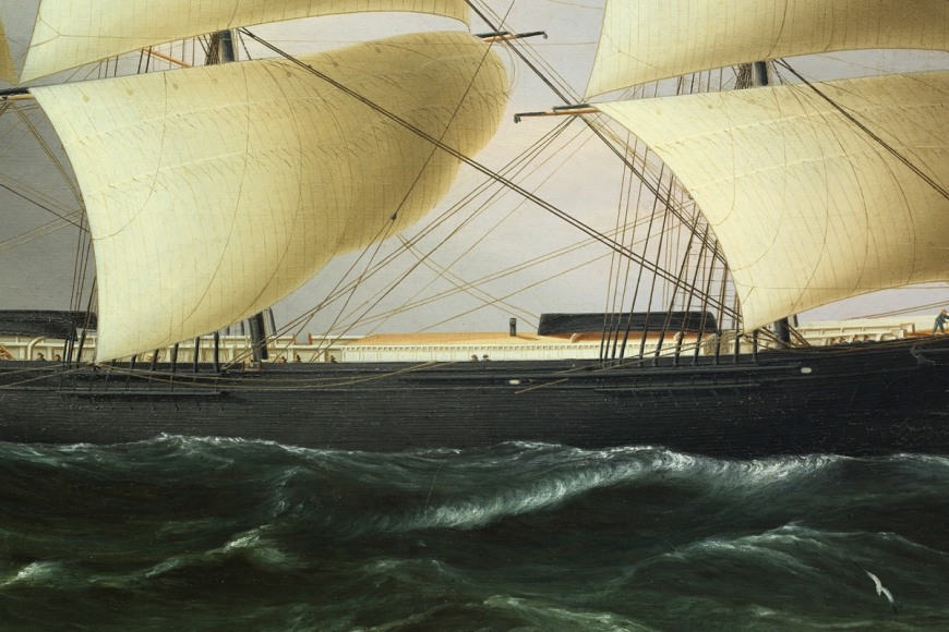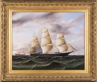 Exceptionally rare and important canvas, depicting the American clipper ship, 'Black Warrior', signed lower right: 'J E Buttersworth', American, circa 1853. This painting is executed in Buttersworth's typical fashion. The hull is beautifully detailed showing each plank. The lighting on the hull is also exceptional in the manner it captures light reflection. The figurehead is very detailed and depicts a woman with outstretched arms. A quarterboard with the name 'Black Warrior' is crisply painted along the bow and in front of the anchor and a second quarterboard is mounted below the lifeboat. The stern decoration is also visible. There are several figures onboard. The deckhouses and lifeboats are very detailed. The sails have outstanding detail and shape. The sail seams and reef points are accurately delineated and are remarkably well preserved. The spars are also beautifully drafted and the stunsails are visible from the lower three yardarms on the front two masts. Flying from the peak of the main mast is a white flag with a red, white and blue American shield. The American flag is flying off the gaff. To the left of the 'Black Warrior' is another clipper ship flying an American flag. This vessel is under shorten sail and is flying a house flag from the peak of the main mast with a white ground and a red cross with a blue dot at the center of the cross. The water is typical of Buttersworth paintings of this period. The rolling waves are painted very accurately with white detailing at the crest of the waves and white detailing along the hull. The sky is also typical with puffy clouds with the pink and purple highlights. The color saturation and brightness of color is exceptional in this painting. Many of the Currier & Ives clipper ship prints painted by James Buttersworth are extremely similar to this painting. (PA-603)