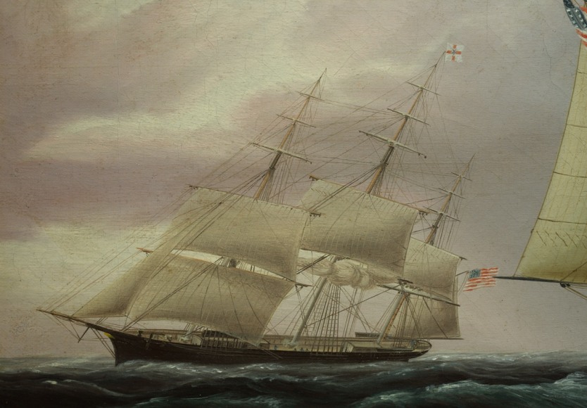 Provenance: The painting has been passed down through a Connecticut family for several generations. Accompanying the painting is a number of letters between members of the family as well as Mystic Seaport Museum and the Peabody Museum. There is also two letters from Rudy Schaefer regarding the painting. Mr. Schaefer was the author of the Buttersworth book listed above. These letters date back as far as January 1956.