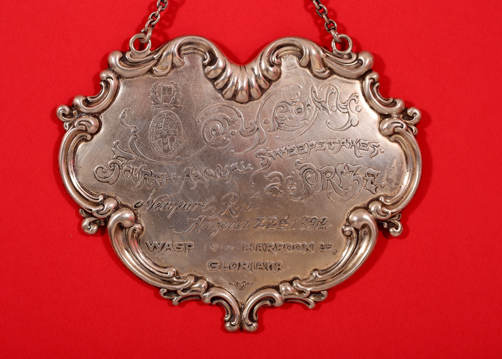 Note 2: All three of the winning yachts were designed by famous yacht designers. Wasp the first-place yacht was a new 46 foot sloop designed by Nathanael Herreshoff for Archibald Rogers. This was the first yacht to be designed with a fully developed bulb keel. Harpoon was designed by Edward Burgess and was sailed by the Adams brothers. Third was Gloriana which was built and designed by Herreshoff the year before Wasp. The first place trophy won by Wasp was designed in the theme of a “Viking Horn” set in a silver base. The top of the horn has a scalloped silver border above a section of elephant ivory with raised lettering of the same font and design as the lettering found on the harpoon trophy’s plaque. The “Viking" trophy was described and illustrated in the Sotheby’s Americana Sale January 21-22, 2011 - lot 128. It is unknown at this time where the third prize is. These prizes must have been made following the race because how else would they have known to make a “Harpoon” shaped trophy till after the race.