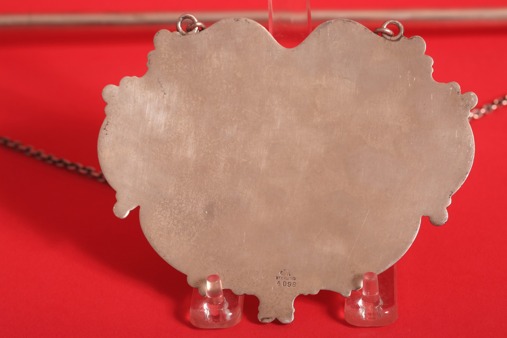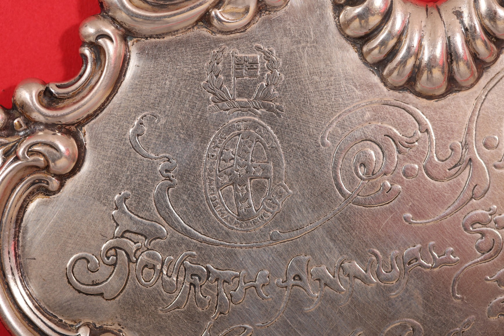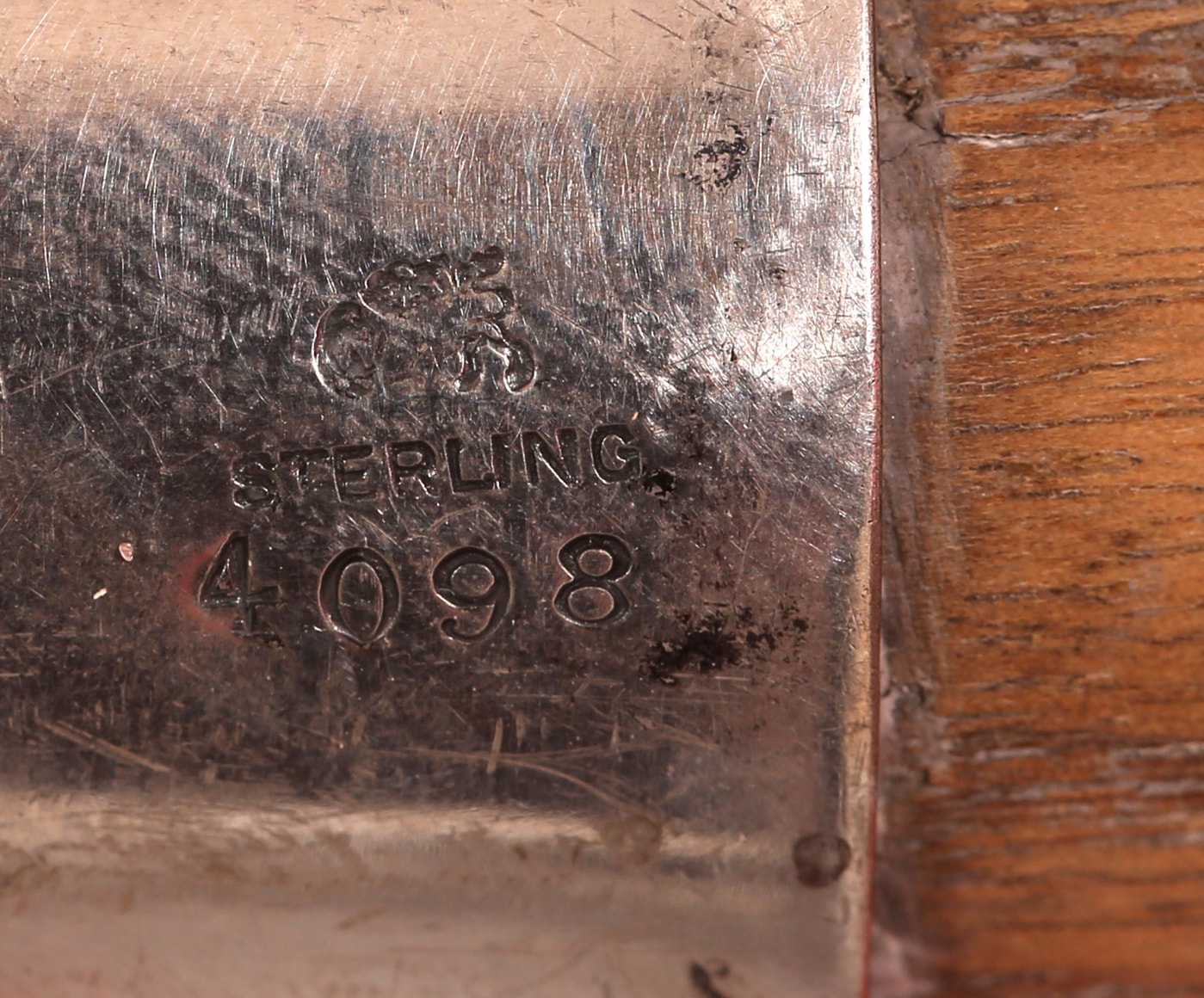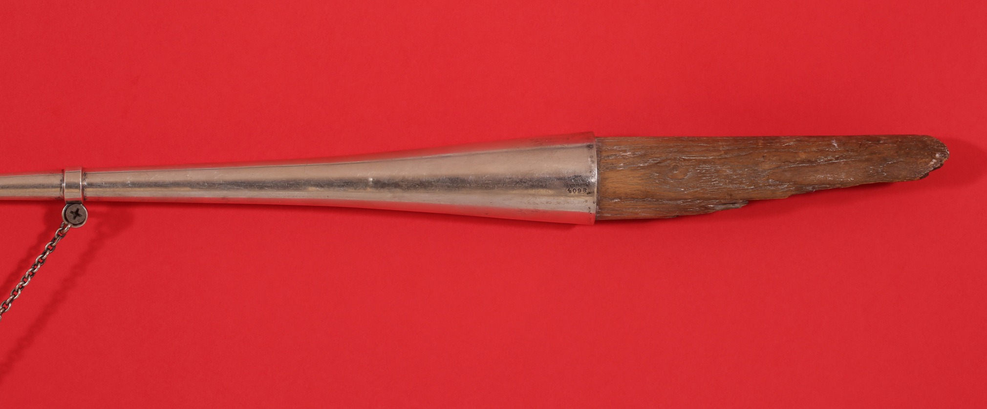 Corinthian Yacht Club silver double fluke harpoon yacht prize manufactured by Whiting Mfg. Co. of New York. At the top of the trophy, there is a silver ring with a pair of silver chains attaching to small rings applied to the top of the harpoon shaft. There are two shorter chains attached to a silver oval like plaque with raised lettering which states “C.Y.C. of N.Y. Fourth Annual Sweepstakes. Newport. R.I. 2nd Prize. August 22d 1892. Wasp 1st – Harpoon 2d. Gloriana." The harpoon is very accurately formed to replicate an authentic double fluke harpoon. There is a broken snub shaft at one end of the harpoon giving the appearance that the harpoon was broken off by the whale. The end of the shaft near the wood is stamped “Sterling 4098." The same silver mark appears on the bottom rear of the raised lettered plaque. (MI-815)