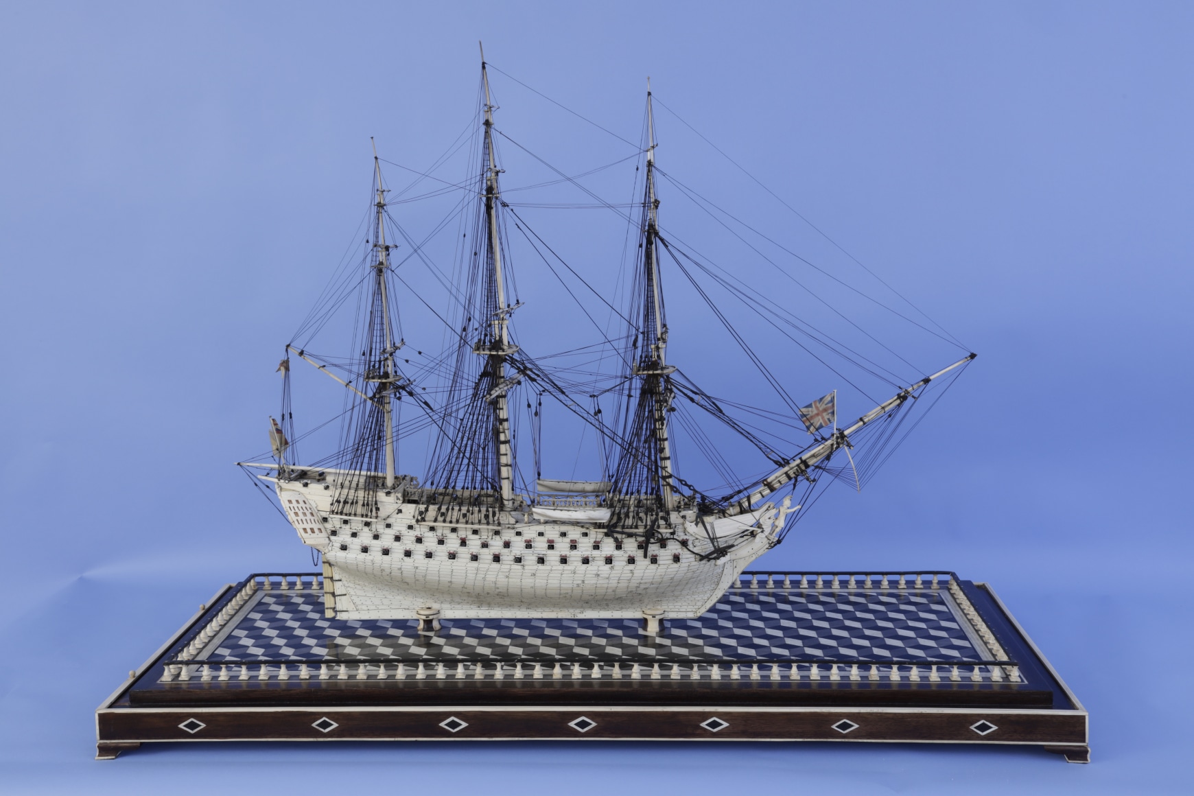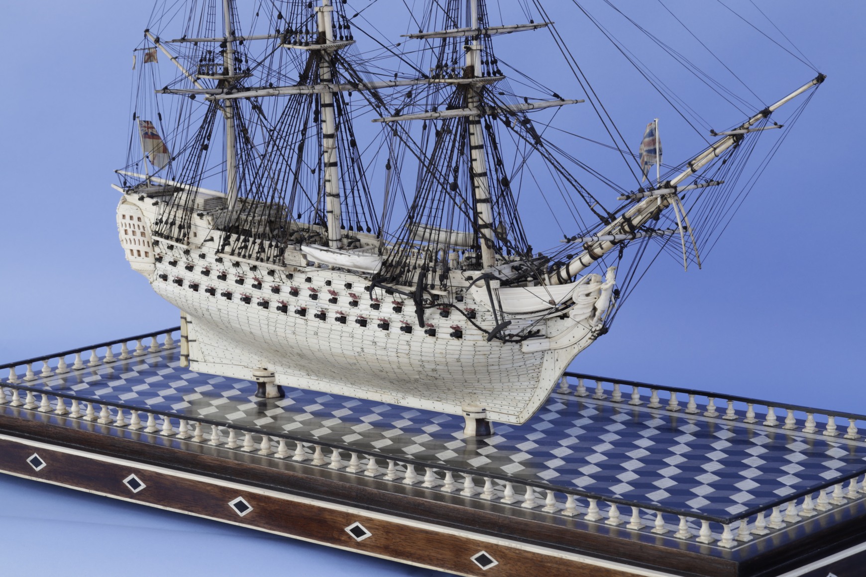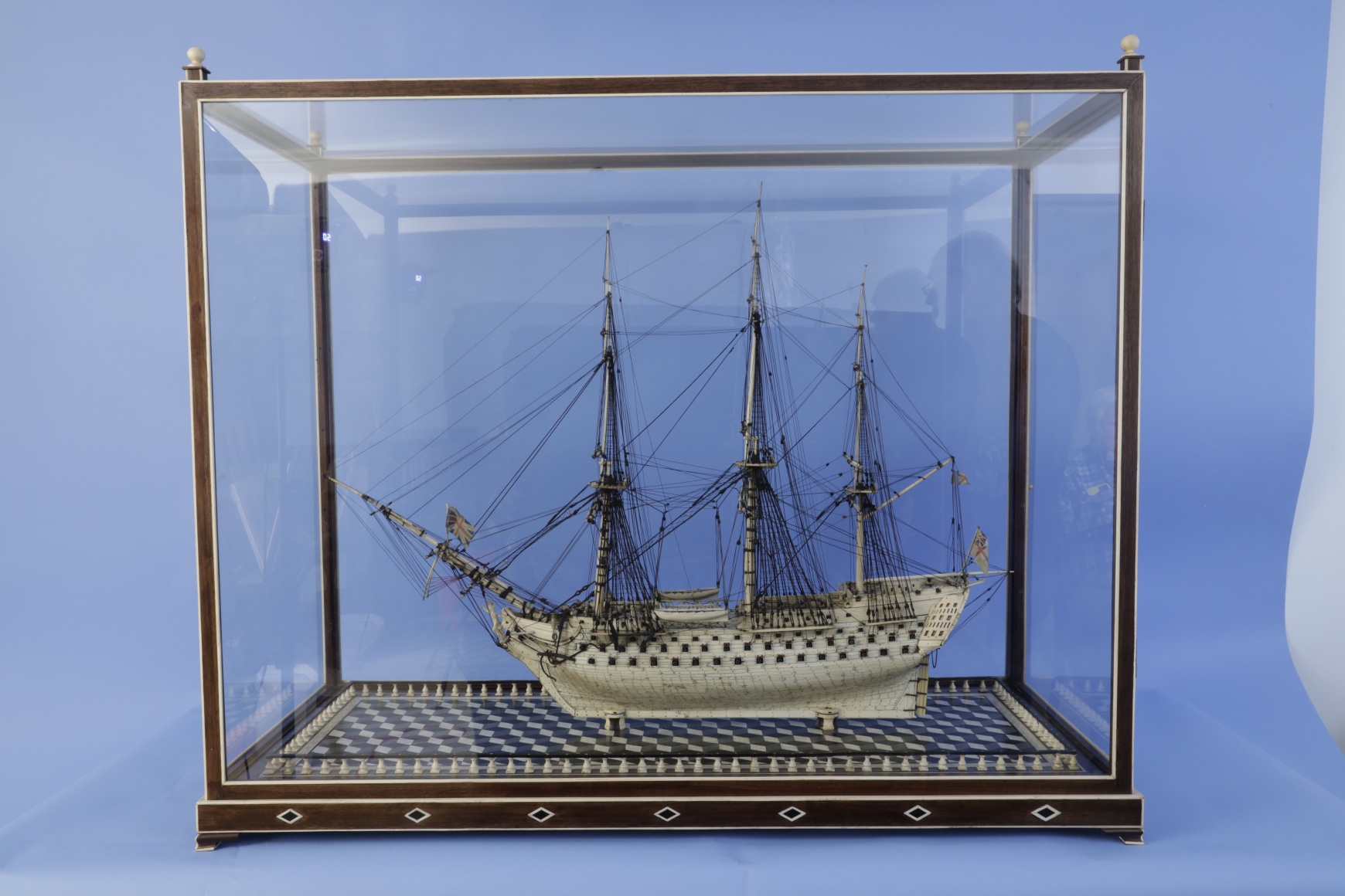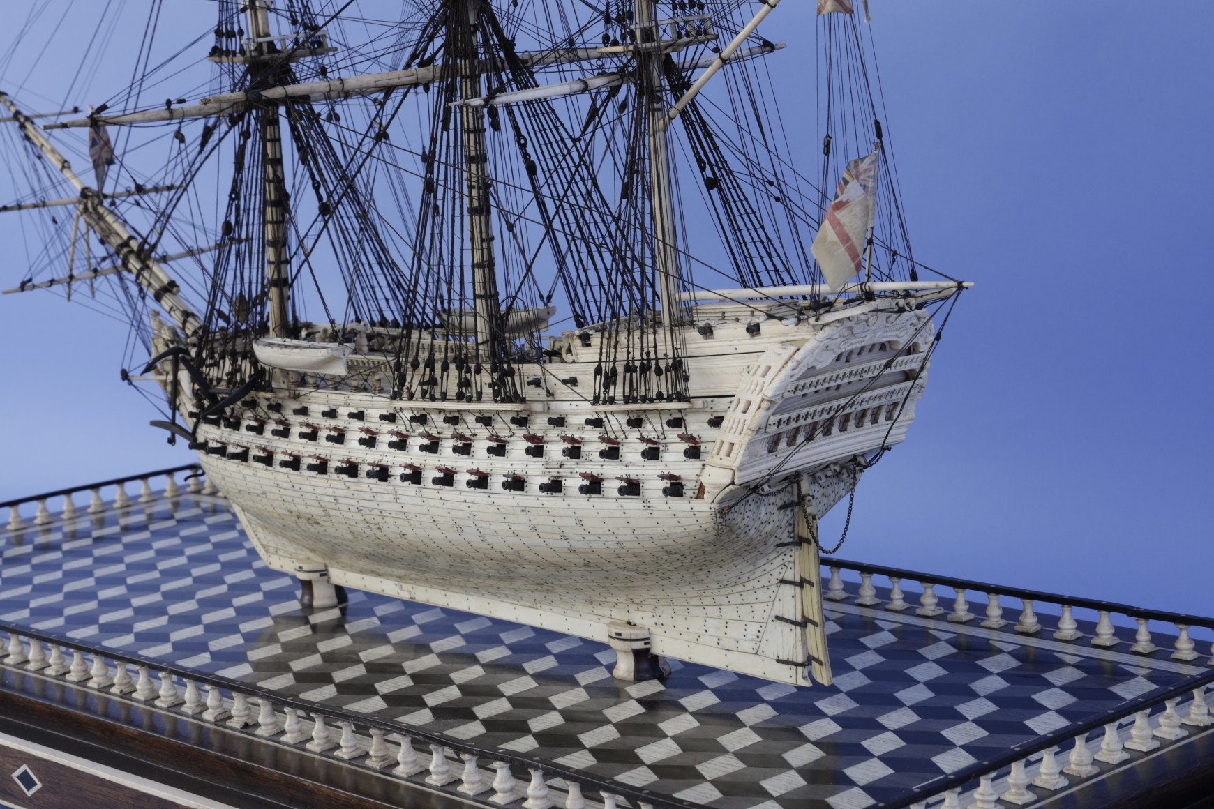 Exceptional detailed and large and important Prisoner of War Model of the British 100 Gun 1st Rate Ship “Royal Sovereign” English/French circa 1790-1810. The core of the hull is wood and planked and pinned in bone from the keel to the topsides. At the bow is a carved figurehead in the form of a Roman warrior, hands at his sides and with a feathered headdress. The figurehead is supported by head rails with carved detail. The quarter galleries and transom are elaborately carved and pierced in bone with banded and rope-twist detail, the windows glazed in mica. The taff-rail, at the top of the transom, is cut and notched with a boom crutch and decorated with the heads of cherubs. Extending from the stern rails is a pair of davits rigged with hoisting lines and hooks. At the top of the transom, carved in relief, is an eagle, lion and dragon above double balconies with carved posts and railings. The lower portion of the transom is carved in relief and is fitted with a rudder with a decorated edge and check chains. The deck is planked and pinned in bone, and detailed with pin and fife rails, anchors hung out on posts, deck rings, cleats, capstan, belfry with turned bone posts and brass bell. The deck is cut out at the waist with carved railings and posts, and decorated with carved swags. On either side of the waist are a pair of boats swung out on hoisting lines. Other details include deck opening, ladders, poop deck with deck house, etc. Rigged with a bowsprit and three masts, each rigged with tops, trees, cross spars and stun' sail booms, all in bone, the standing and running rigging including ratlines running up from bone chain plates and rigged with bone deadeyes, turning blocks and fairleads. Other parts of standing rigging include stays, shrouds, intermediate shrouds, and running backstays. Running rigging includes sheets, halyards, topping lifts, bracing lines, and other rigged details. The Royal Sovereign was launched by the British Navy on September 11, 1786. (SM699)