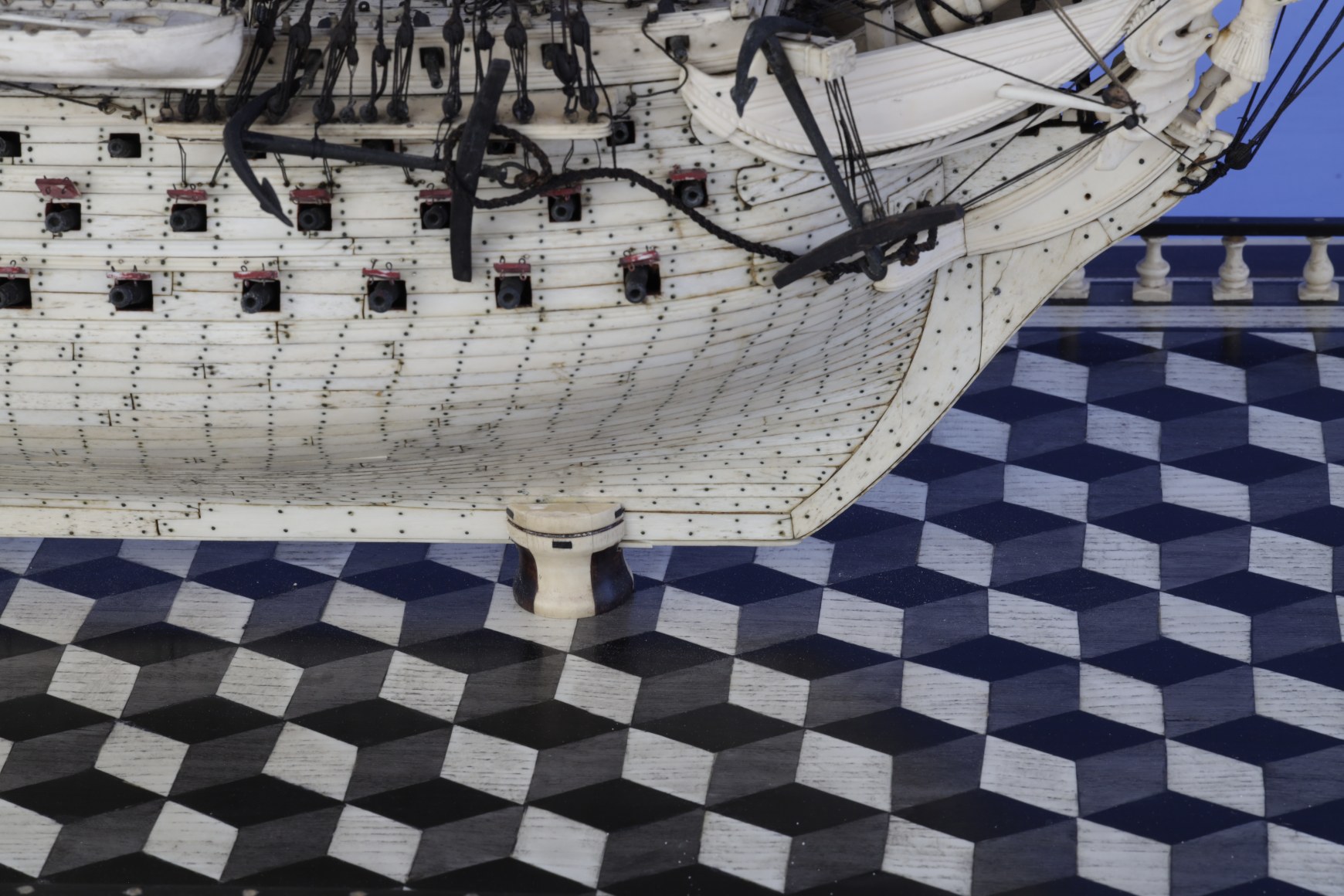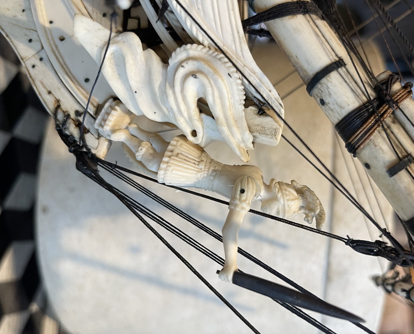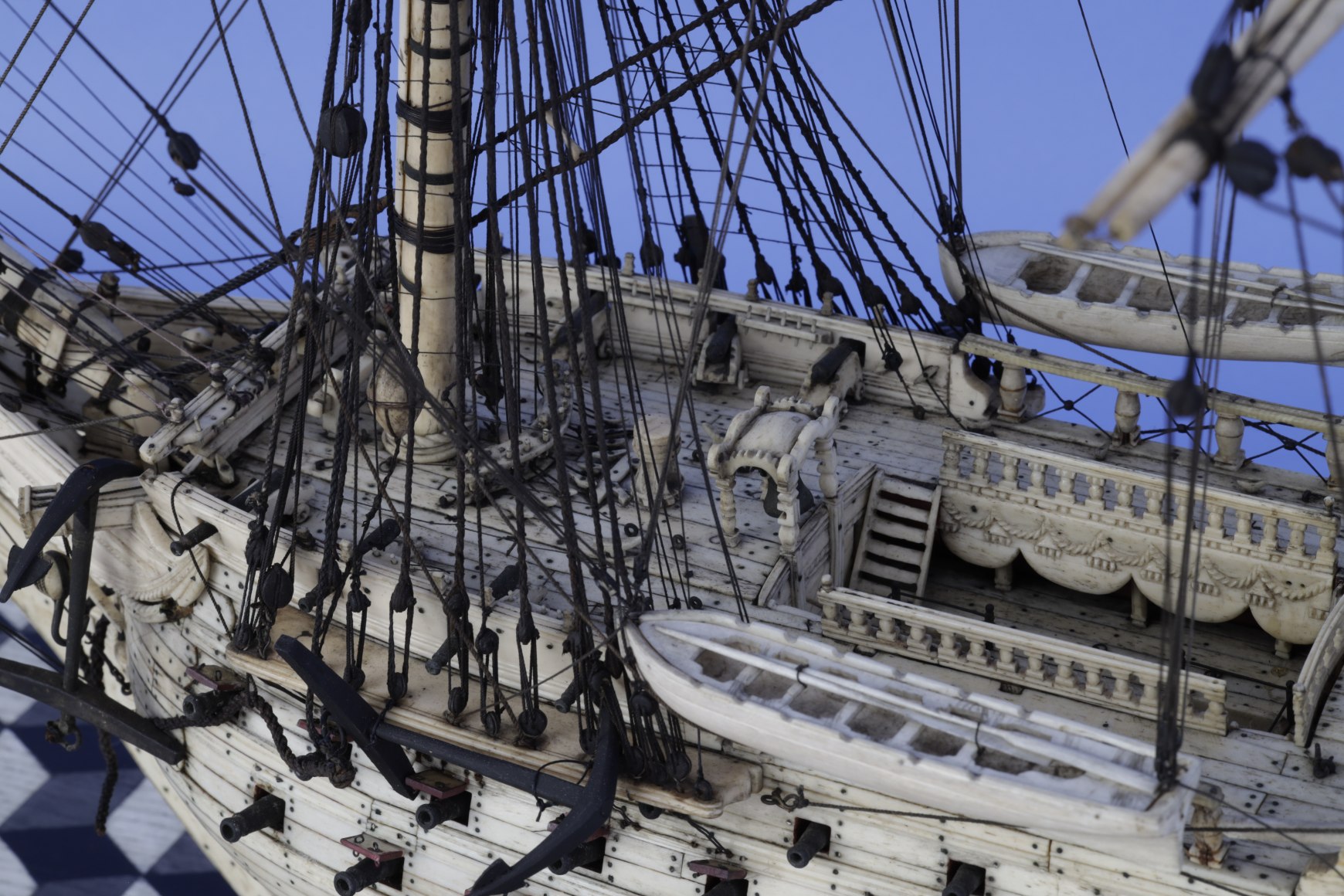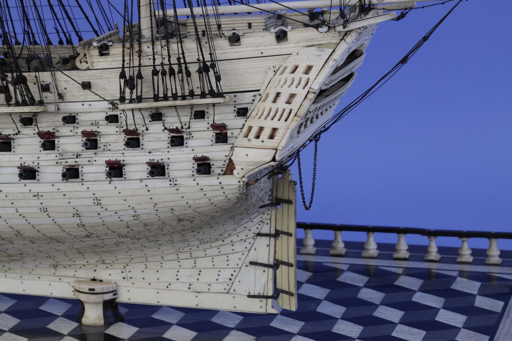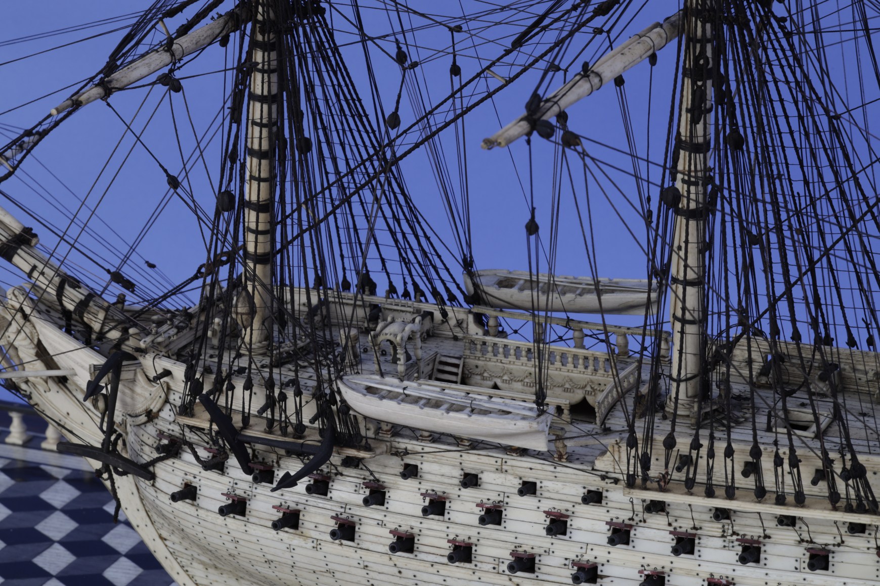 Exceptional detailed and large and important Prisoner of War Model of the British 100 Gun 1st Rate Ship “Royal Sovereign” English/French circa 1790-1810. The core of the hull is wood and planked and pinned in bone from the keel to the topsides. At the bow is a carved figurehead in the form of a Roman warrior, hands at his sides and with a feathered headdress. The figurehead is supported by head rails with carved detail. The quarter galleries and transom are elaborately carved and pierced in bone with banded and rope-twist detail, the windows glazed in mica. The taff-rail, at the top of the transom, is cut and notched with a boom crutch and decorated with the heads of cherubs. Extending from the stern rails is a pair of davits rigged with hoisting lines and hooks. At the top of the transom, carved in relief, is an eagle, lion and dragon above double balconies with carved posts and railings. The lower portion of the transom is carved in relief and is fitted with a rudder with a decorated edge and check chains. The deck is planked and pinned in bone, and detailed with pin and fife rails, anchors hung out on posts, deck rings, cleats, capstan, belfry with turned bone posts and brass bell. The deck is cut out at the waist with carved railings and posts, and decorated with carved swags. On either side of the waist are a pair of boats swung out on hoisting lines. Other details include deck opening, ladders, poop deck with deck house, etc. Rigged with a bowsprit and three masts, each rigged with tops, trees, cross spars and stun' sail booms, all in bone, the standing and running rigging including ratlines running up from bone chain plates and rigged with bone deadeyes, turning blocks and fairleads. Other parts of standing rigging include stays, shrouds, intermediate shrouds, and running backstays. Running rigging includes sheets, halyards, topping lifts, bracing lines, and other rigged details. The Royal Sovereign was launched by the British Navy on September 11, 1786. (SM699)