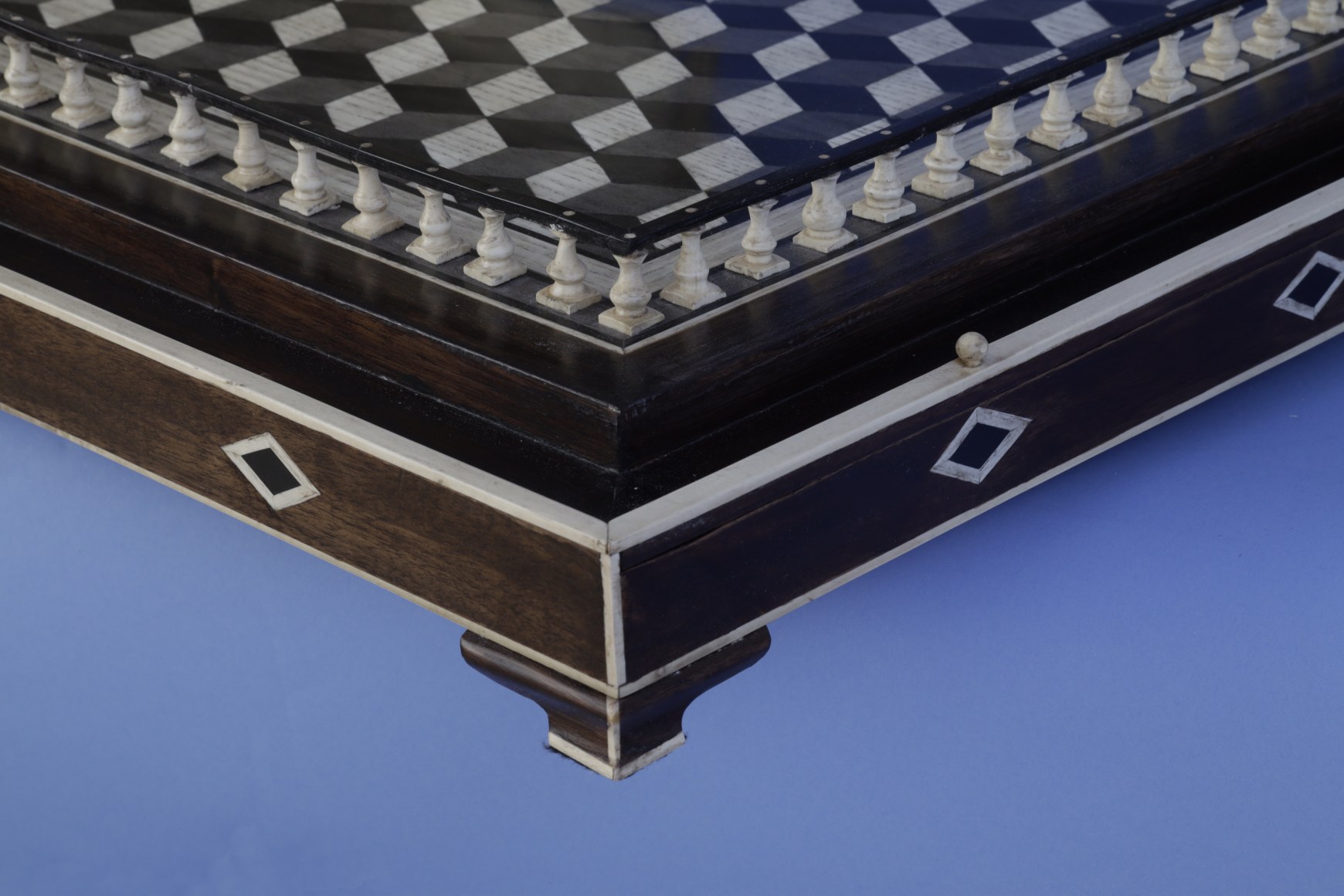The model has a custom built marquetry base with classic geometric design made from multiple hardwoods and trimmed with holly. The perimeter of the base has an elaborate balustrade fence around the perimeter. The base slides in the case through a door and has attractive finial and feet. The base of the case is trimmed to match the model base. A handsome walnut table base sits below the case and has similar inlaid patters.