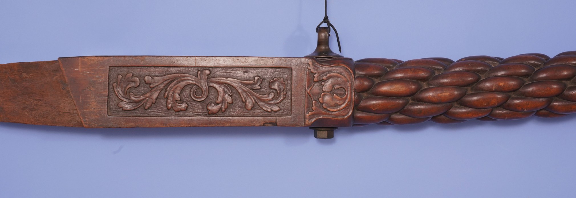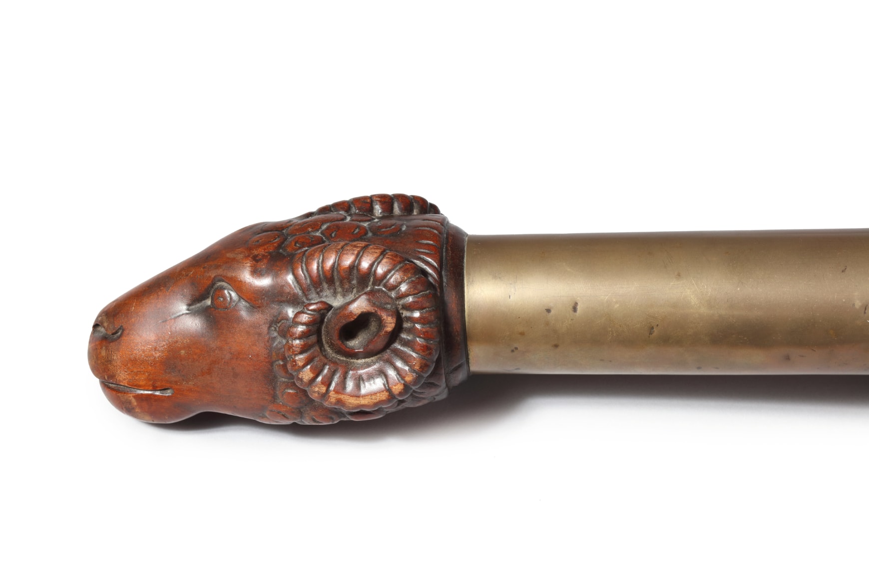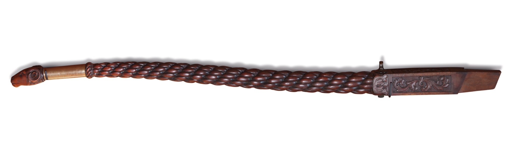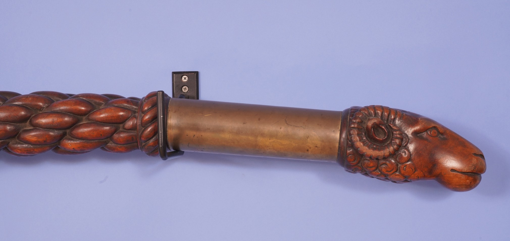Exceptional fine and large mahogany “Sunday” or exhibition tiller with “Ram’s Head” grip English circa 1880. The tiller’s carving quality and design is at the highest level and is amongst the finest yacht tillers in the world. The tiller is carved from a single and massive block of mahogany and has a typical but gentle “s” curved shape. The end of the tiller features a wonderfully carved ram’s head with fine detail and charm. Below the head the tiller shaft is rounded and covered with a brass collar which was probably used to grip the tiller for steering. At the end of the brass is a raised carved “Turks Head” transitional narrow section, followed by a long round carved section which has a carved multi- stranded rope carved section which is narrow at the front as widens as it moves towards the end. The final section of the tiller is rectangular with a finely carved panels on the sides and top. The end of the tiller is shaped so it would fit in firmly into the yacht’s rudder. At the front of the final section is a bronze eye with a through bolt going through the tiller and is threaded into a bolt at the bottom of the tiller. (FA-1093)