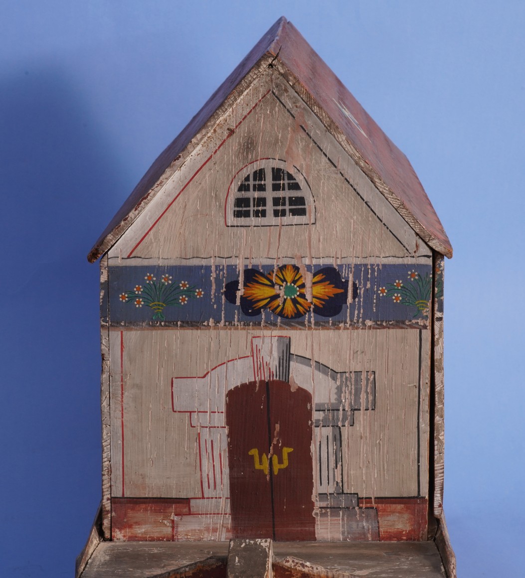 Carved and painted large sized Noah's Ark, made in Germany for the American market, circa 1880.  The ark looks like a barge with a house on top.  On the front and side the house has an elaborately painted blue border beneath the roof.  The windows are on a wood panel which slides allowing access to an empty cavity where the animals and figures were once stored.  The arch has a painted roof simulating shingles and on one side there is a painted bird.  There are 139 carved and painted figures.  Most of the figures are in pairs which include zebras, monkeys, birds, elephants and even insects, etc.  There are four carved and painted figures of people which include Noah and his family.  The ark and figures are displayed on a backboard with shelves and a zigzag ramp displaying the figures as though they are marching towards the ark.  The detail of the ark and the individual figures are of a higher quality and have more decorative elements than many of the Noahs' Arks from the same era. (FA-1095)