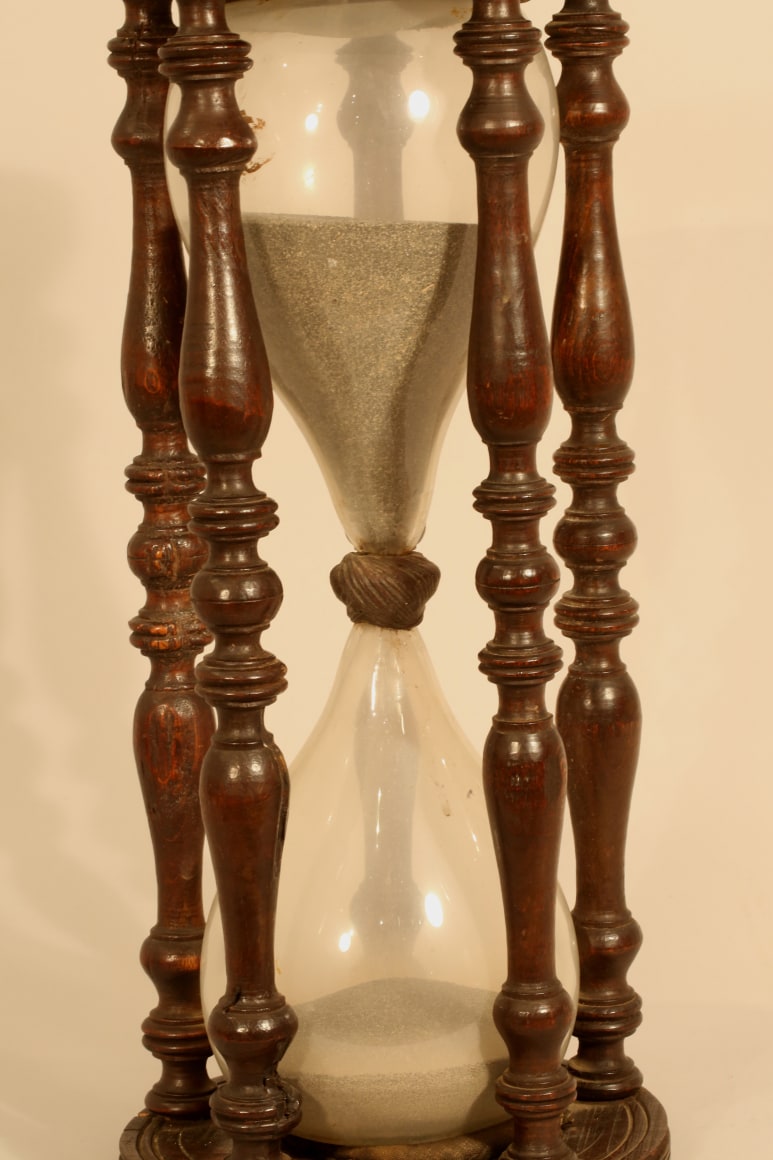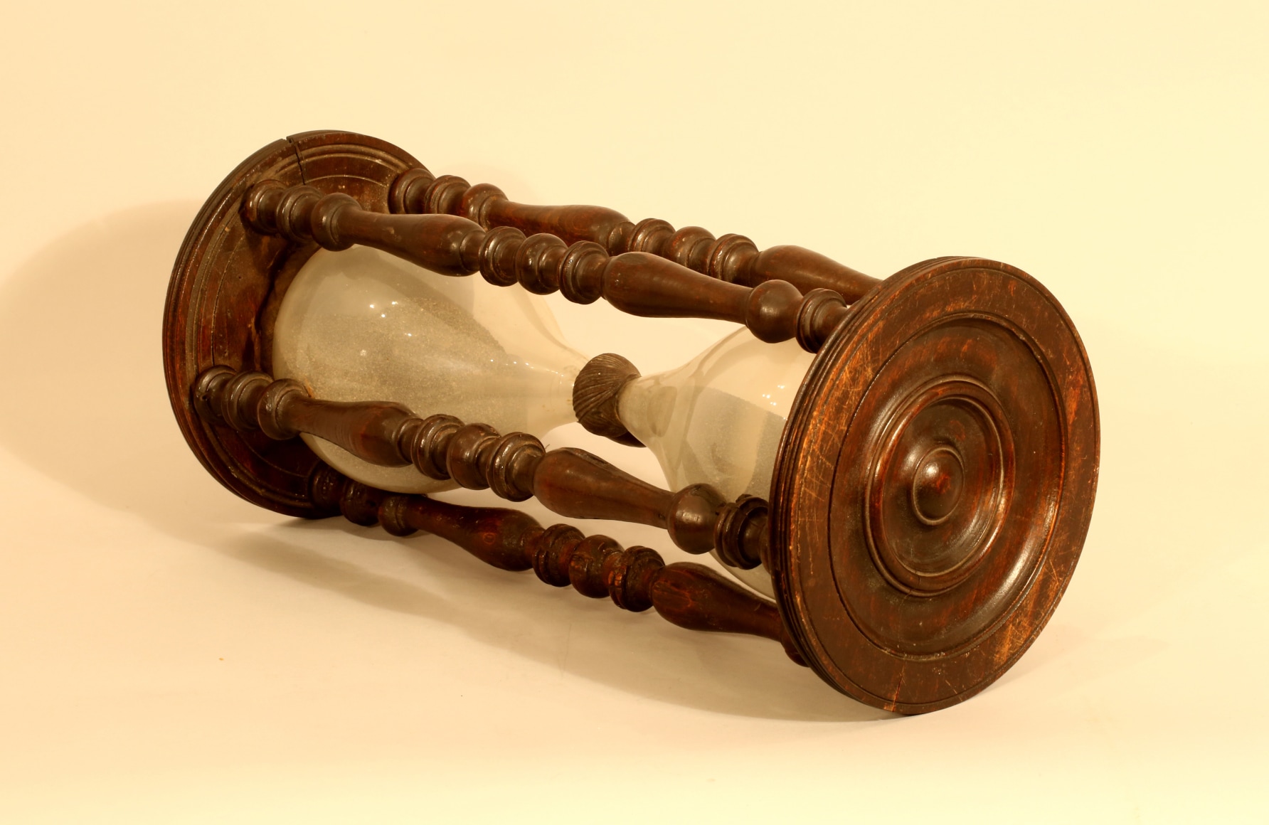Extremely large late 18th century hour glass, probably English and possibly European. The wood frame of the hour glass is probably elm wood. The hour glass sits on a round base and when it is reversed it has an identical round base. The top surface of both bases have turned rings, bands and at the center a raised dome. The bottom side which the glass sits into has turned bands of various widths. Interconnecting the top and bottom are four baluster turned posts which mortise into each of the bases. Holding the sand are opposing blown glass vials that are somewhat pear-shaped and the narrow ends meet at the center with a woven sting connector. The base of each of the glass vials has a round brown cloth padded pillow that protects the glass. (I-904)