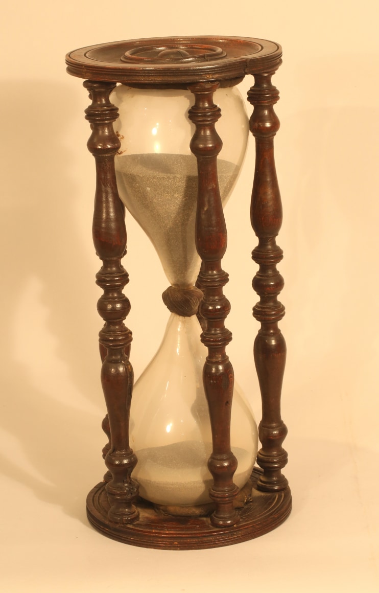 Condition: Each of the round turned discs on opposite sides of the instrument have typical shrink cracks. The sand flows thru for a short time and then stops. The instrument is structurally sound and has an old, mellow patina. Two of the balusters show some wear.