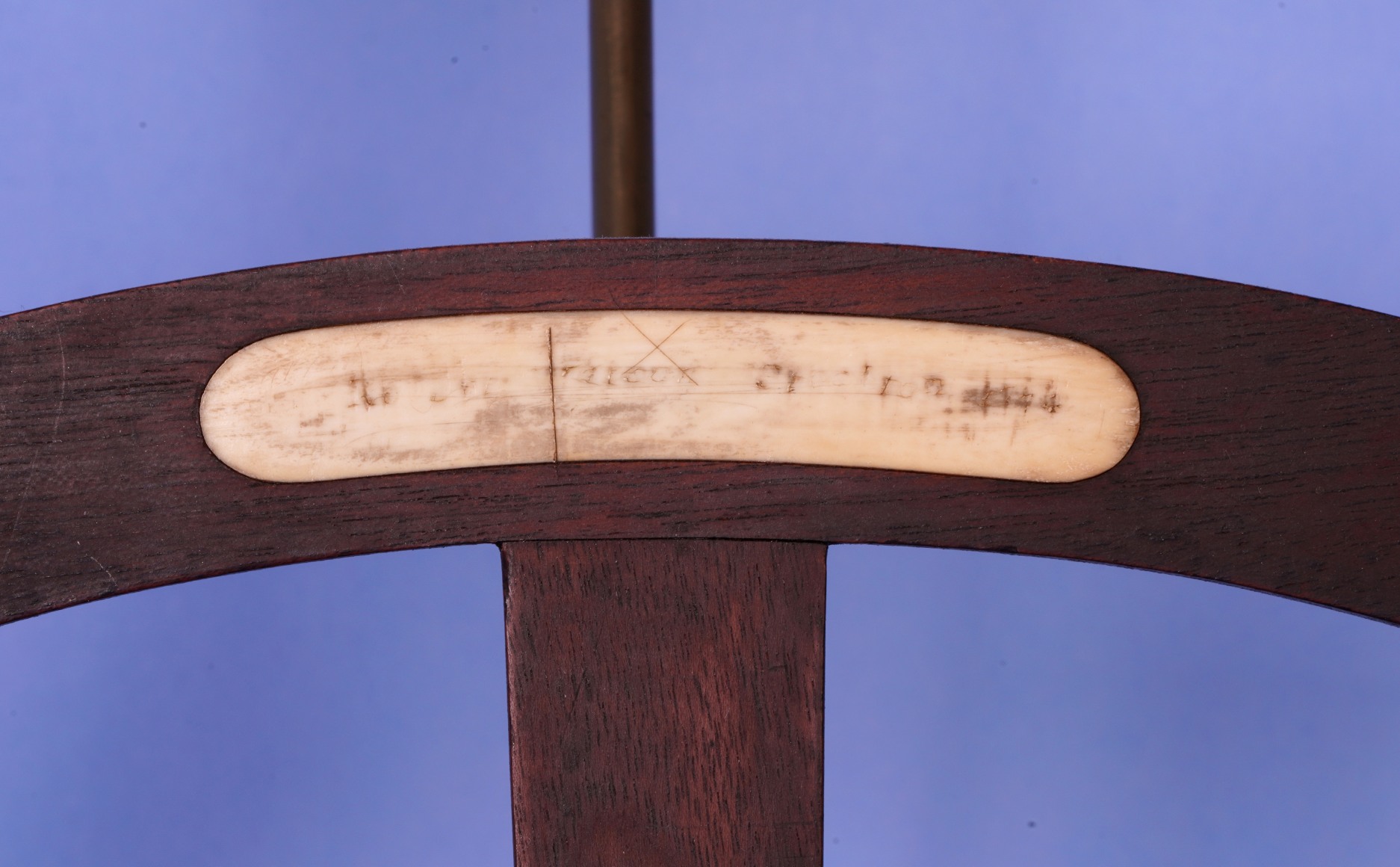 Extremely rare mahogany Hadley quadrant, signed on the boxwood scale: 'Goater No.141 Wapping, LONDON', dated on the ivory: '1774'. The large quadrant has a mahogany frame with a hand engraved mahogany scale. The instrument retains its original, ivory, owner's plaque which is indistinctly engraved. The instrument retains its original brass peep sights, index mirrors and color filters. The radius arm has a standard lobster claw end, typical of the instruments of this period and retains the original ivory index. (I-482)