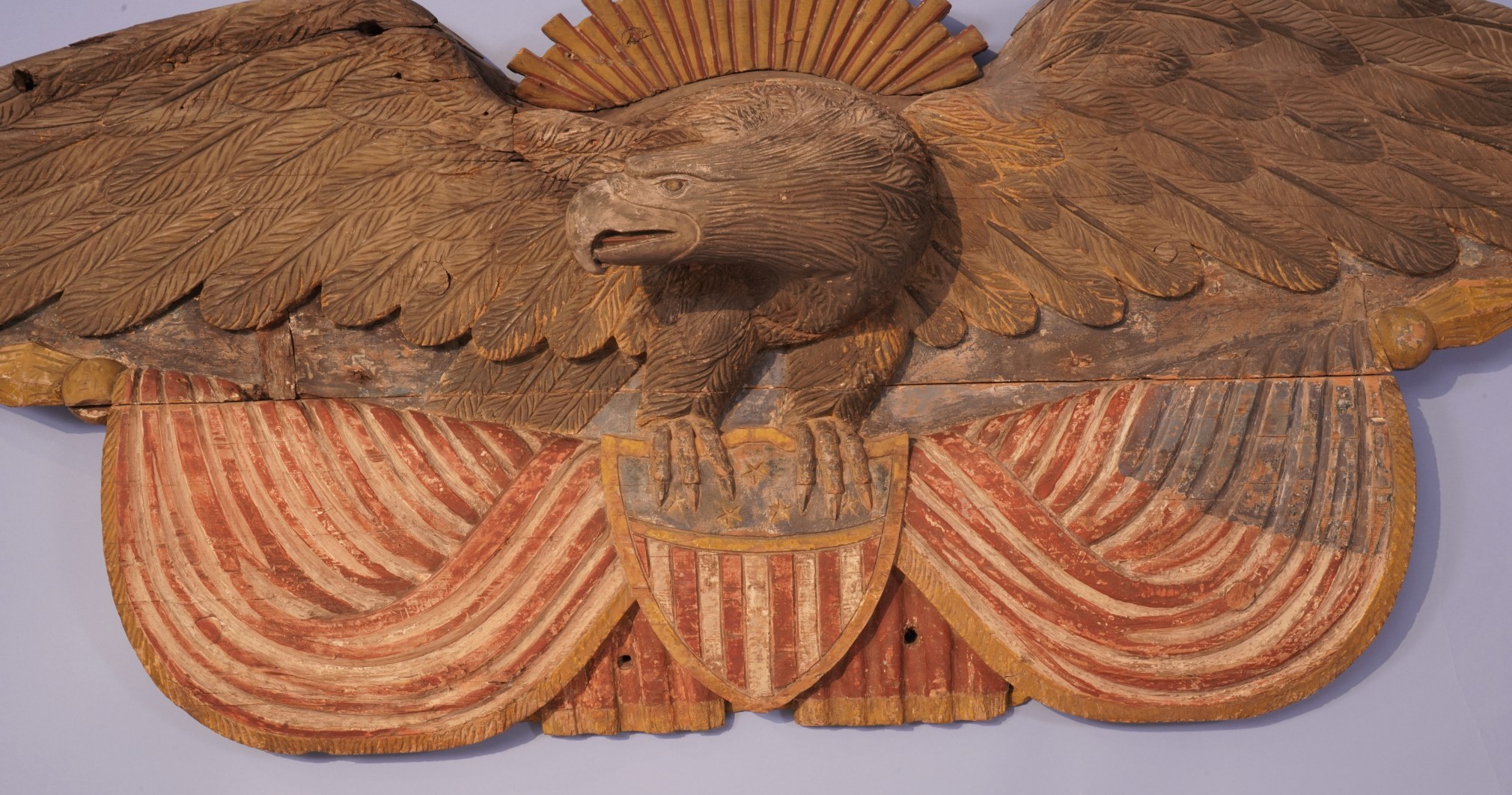 Important 19th century carved and painted American patriotic Civil War period stern board carving, circa 1860. The stern board is made from 5 pieces of pine laminated together. At the top of the wings the wood is about six inches thick and tapers as it goes down the wings. At the top center is a curved piece of pine carved and painted yellow-gold in the form of a sub-burst. Flanking the sunburst are two narrow pieces of pine which form the top of the wings which are applied to a full length and wide piece of pine which spans the wings tip to tip. The bottom section of pine is quite wide and has the carved polychrome red, white and blue polychrome draped American flags with shield in the middle. On opposite ends of the flag pole are spade like carved flag pole finials and centered on the polychrome shield are pair of the eagle’s talons. The eagles head is turned facing right with a well developed brow and beak. The tongue is articulated and is painted red.