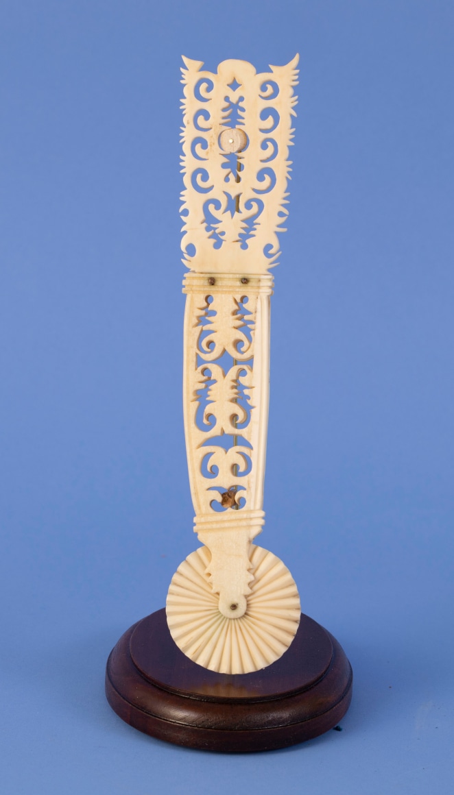 Exceptional and large pierced scrimshaw whale and walrus ivory crimper America third quarter 19th century. The top section of the crimper has an elaborate pierced carved design. It is set into and brass pinned to the lower section which has been hollowed out so that it is in two pieces and joins at the bottom section where it supports the wheel. The lower section has an elaborate pierced carved design consistent with the carved design above. One side of the lower section is whale ivory and the opposite side is walrus ivory. The crimper has a carved whale ivory wheel. (SC-1222)
