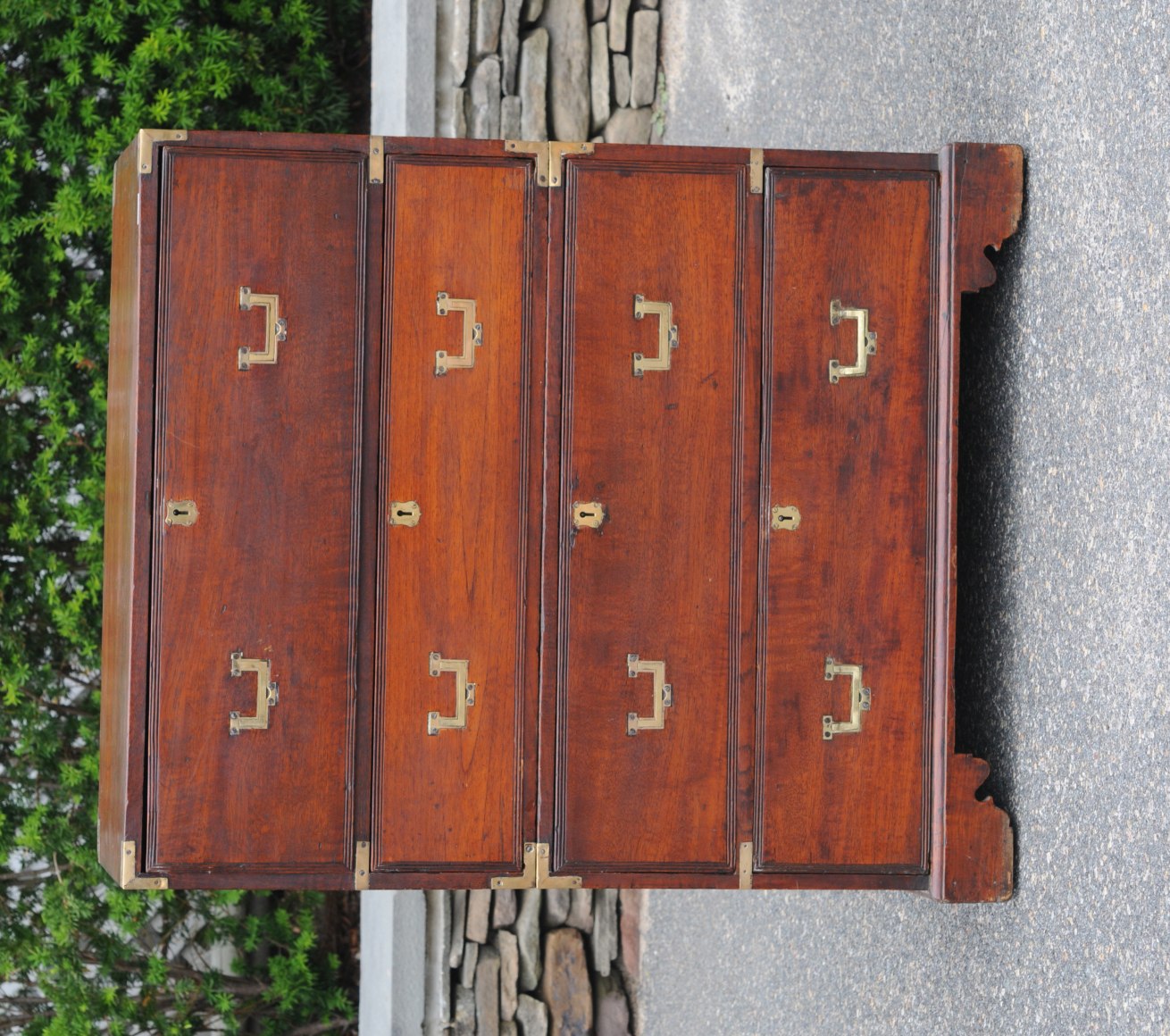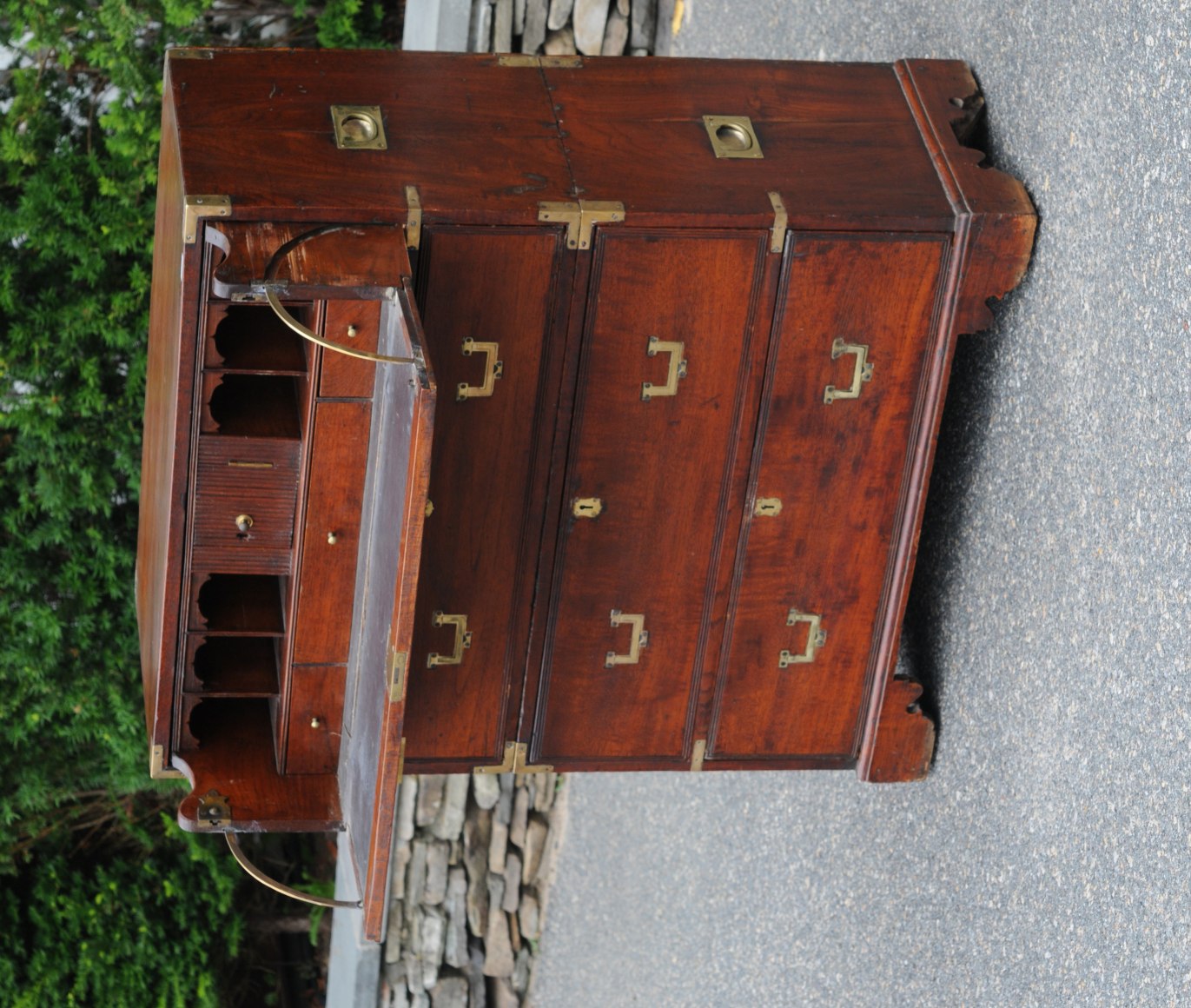 Mahogany two part campaign secretary, English, circa 1880. The desk is brass banded and has a flip-out brass carrying handle on both upper and lower surfaces. The secretary section and three drawers have flip-out brass pulls and center brass key escutcheons. The desk retains its original bracket feet. The top section slides forward and flips down exposing a black canvas writing surface. The back of the secretary has three drawers below six pigeon holes and a hinged centered door. The compartment behind the door has two secret wood document pockets. (F-507)