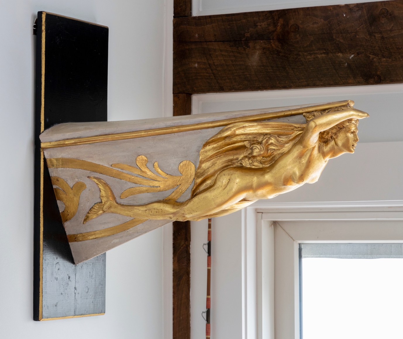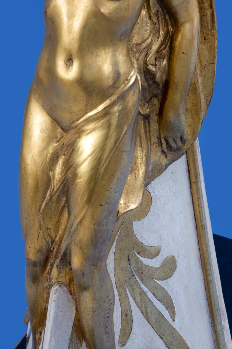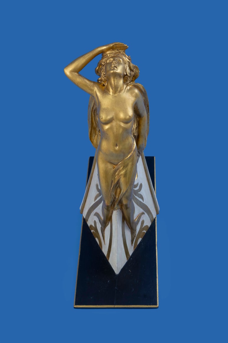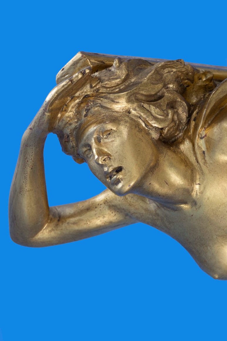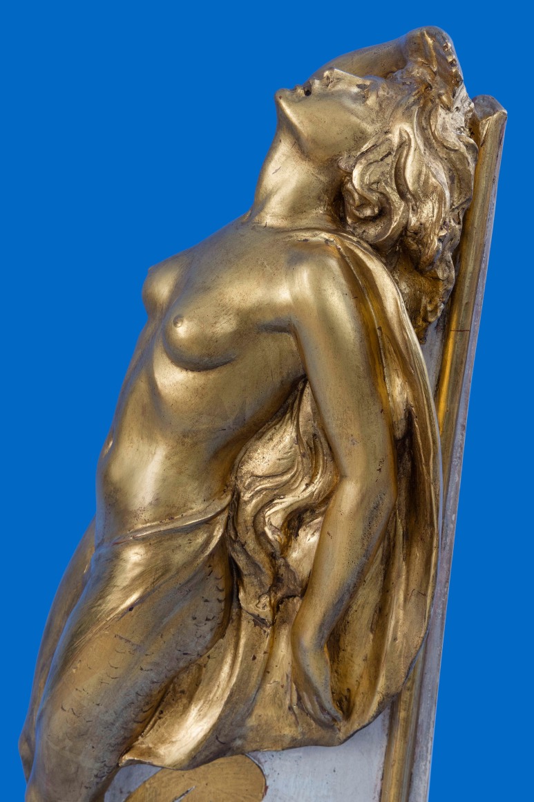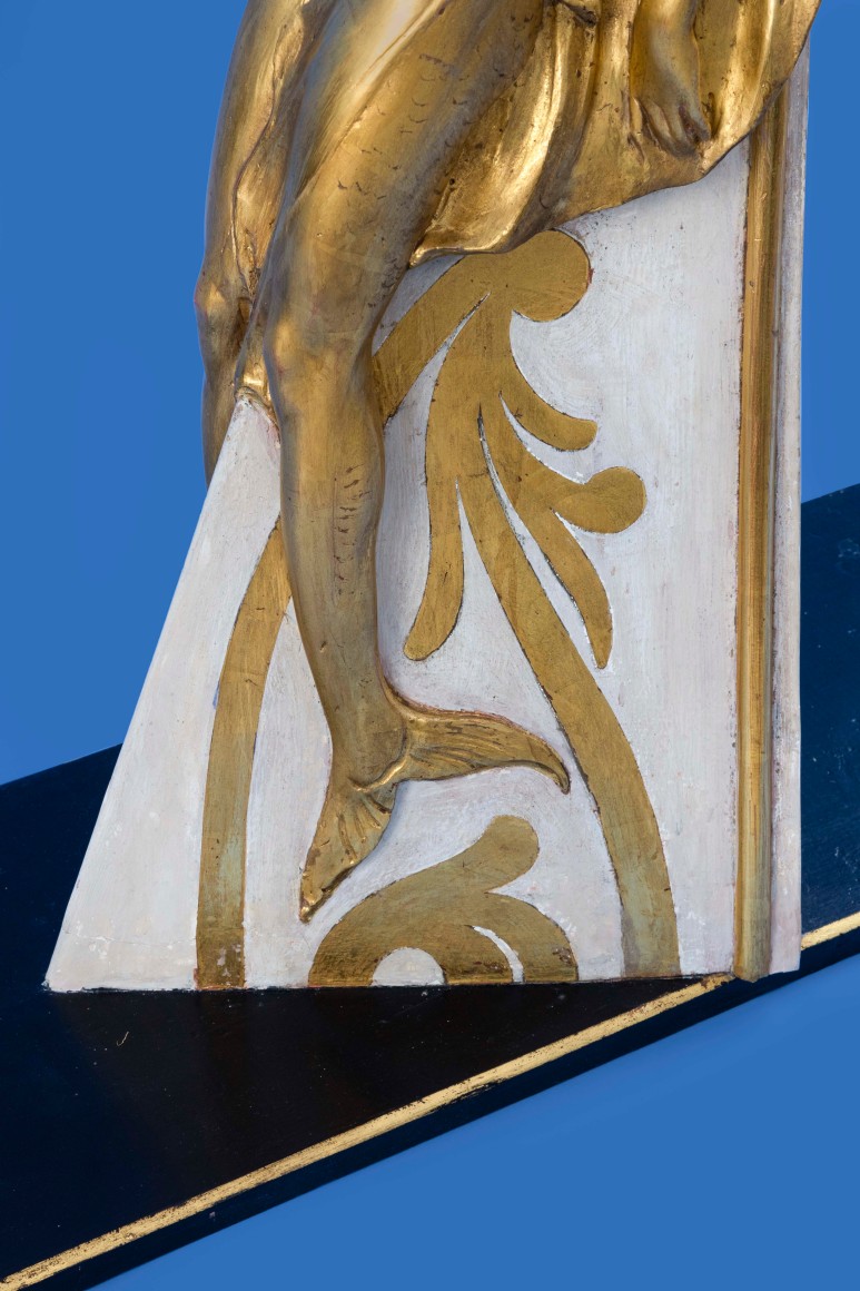 The literal definition of a maquette is a sculptors small preliminary model or sketch, produced in the artist’s studio for a larger piece of artwork or sculpture, created in order to visualise how the finished item might look, maquettes where also created as a three-dimensional template to help scale up to a much larger finished work of art, maquettes of ships Figureheads are unusual, a number of Naval examples survive in major collections around the World, usually produced by the carver to be presented to the Sovereign for approval, once this was given the maquette would be presented to a favoured official or retained by the commissioning admiralty, merchant examples are extremely rare, in the case of the HI-ESMARO maquette we are looking at a piece created not as a presentation piece to show a prospective client, but as a working model created out of plaster on a wooden frame, HI-ESMARO was built for the American magnate Hiram Manville, proprietor of the Johns-Manville Company, at the Bath Iron works in Bath Maine, with a length of 267 feet and 1,333 tons, work began in 1928, she was launched on the 7th June 1929, with critical acclaim, being described as one of the most beautiful yachts afloat at that time, with an original price estimation of $769,000 she would in the end cost a staggering $900,000, equivalent to just over $12 million our time, as a proud owner Hiram Manville would have taken great interest in all aspects of the vessels design and layout ,not least in the style and subject of the vessels figurehead, an essential and aesthetically important element of the overall appearance of the vessel, the name HI-ESMARO has no obvious subject, being formed by the first syllables of his Christian name HI followed by ES the first two syllables of his daughter name Estelle, then part of his surname MA and finally his wife Romaine, a number of designs would have been produced in sketch form, once a design was settled to Mr Manville’s approval , in the case of the HI-ESMARO a young female mermaid semi-nude with a scaled fishtails, her left arm razed shielding her eyes as she scans the distant horizon, a scaled template of the bow would be produced by the carpentry department of the yard, and on this a three-dimensional model of the Figurehead would be produced, from this surviving maquette a full sized figurehead would have been produced again in plaster, to allow the carving to be cast in bronze, ready to be fitted on the bow, during the casting process this full sized representation may well have been lost, or destroyed during the process leaving the original small scale model, when it was no longer needed this fascinating survivor was given to the family of Hiram Manville and remained with them until its recent sale.