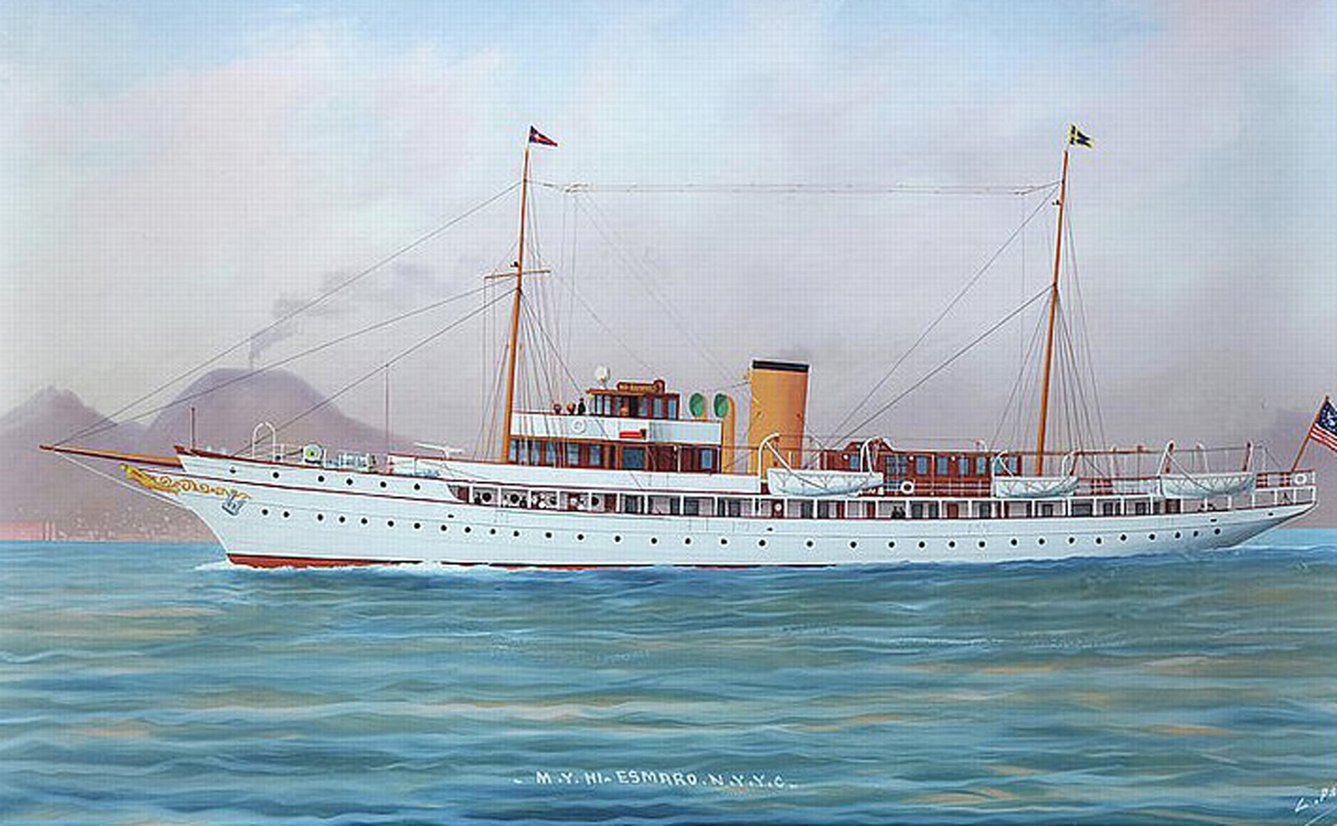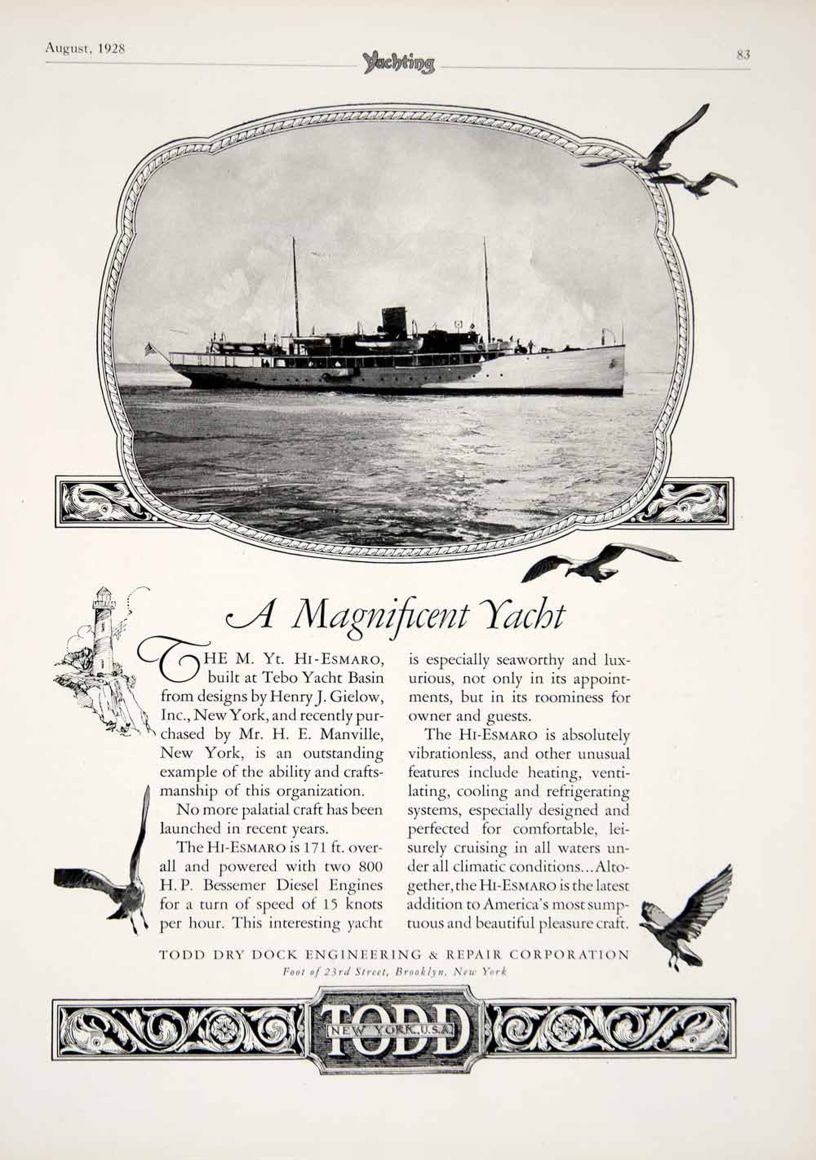 During its working life under the ownership of the Manville family HI-ESMORO was well documented and photographed on numerous occasions, the natural focus point being the Figurehead, in several surviving views this can be seen quite clearly and matches perfectly the figurehead we see in this remarkable maquette, right down to the delicate and sinuous flow of her hair, the August 1931 issue of the Fortune magazine carried a full page advertisement for the Bath Iron Works Corporation under the heading “Bath always builds good ships” featuring two large views of the HI-ESMORO from the bow and stern, indicating its pride in the vessel, the Manville family used HI-ESMORO for several voyages during the 1930’s , mindful of world events at the end of the 30’s the American government purchased her in October 1940, converted for use by the Navy as a coastal minelayer, operating in the Caribbean and Pacific waters she had known well before the War, with this change of owners and role, she was given the name USS Niagara and stationed at Noumea, New Caledonia, within a short time she was again reclassified as a patrol gunboat with the identification PG-52, sadly her service in the Navy was sort lived, on the 23rd May 1943 while en route to New