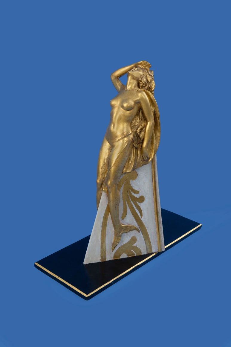 Maquette Model Of the Gold Mermaid Figurehead for the Yacht Hi Esmaro was Built at Bath Iron Works in 1928 for Mr. Hiram Manville. She was 267 feet in length and was one of the super yachts built by Bath Iron Works in Maine. They also built the Famous Yacht Corsair for JP Morgan. As I mentioned the maquette descended in the Manville family and went from the family to me. I will have a letter from a family member testifying to these facts. There is a link to the auction information about the carving including several photos. None of the photos of the face do her justice so I have attached 2 photo of the face so you can get a better idea. I also have included a link that provides information about the Hi-Esmoro including several photos of the yacht including bow shots which clearly show the figurehead on the yacht looking just like the model. The is a large model of the Yacht at the New York Yacht Club at their Newport club house which shows the figurehead which was given to the club by Manville because he was a member and it was customary for owners to give professional quality models to the club of the more major vessels. (FA-1101)