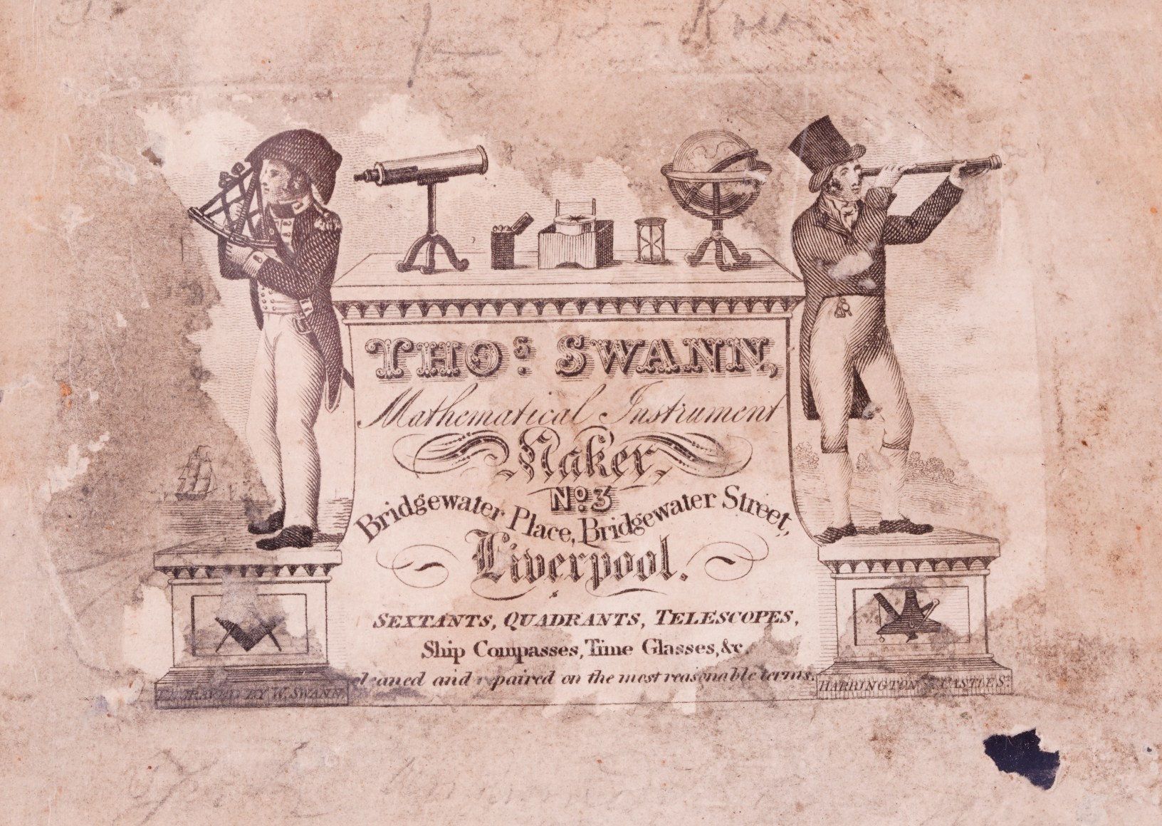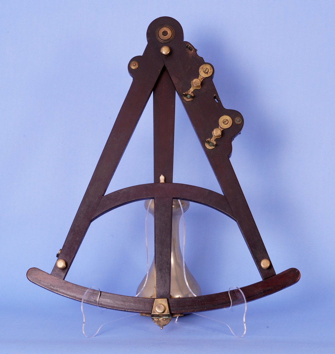 Rare 20 inch Mahgany, brass and ivory quadrant unsigned English, circa 1790. The instrument has an all wood frame and sliding mahogany radius arm with a stepped brass fitting at the end with an ivory vernier scale. The bottom arc of the instument has an inlaid ivory engraved scale with marking 0-90 degrees. Near the center of the instrument is a curved stretcher with a blank ivory maker's label below the turned bone pencil holder. The instrument is compleate with index mirrors, pair of color filters, 2 peep sights and three brass feet. The instrument retains the original pie shaped step up box with the owner's name 'B ARCHER' stenclied on the top of the raised section of the lid. The inside of the lid bears the orginal makers label which is engraved 'Thos. Swann Mathamatical Instument... Maker No. 3 Liverpool'. (I-898)