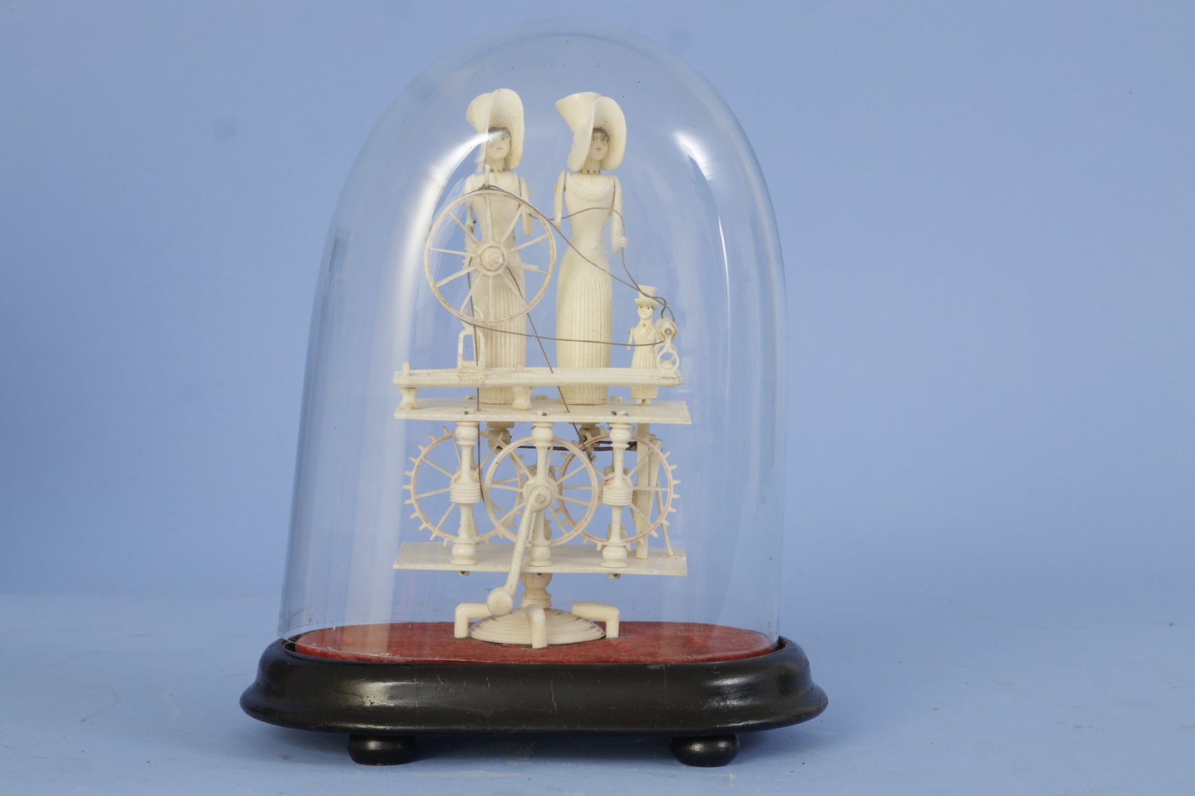 Napoleonic Prisoner - OF -War carved bone Spinning Jenny with two female figures and a child and a spinning wheel on the upper level. The lower platform has another wheel, two round gears and a crank handle. The figures have a natural bone color and the figures have nice facial details and are wearing Large Bonnets.. The eyes, lips ans and cheeks and hair are well painted details. The spinning jenny sits on its original bone round base pedestal. The Jenny sits in a round glass dome with wood base. (SC1314)