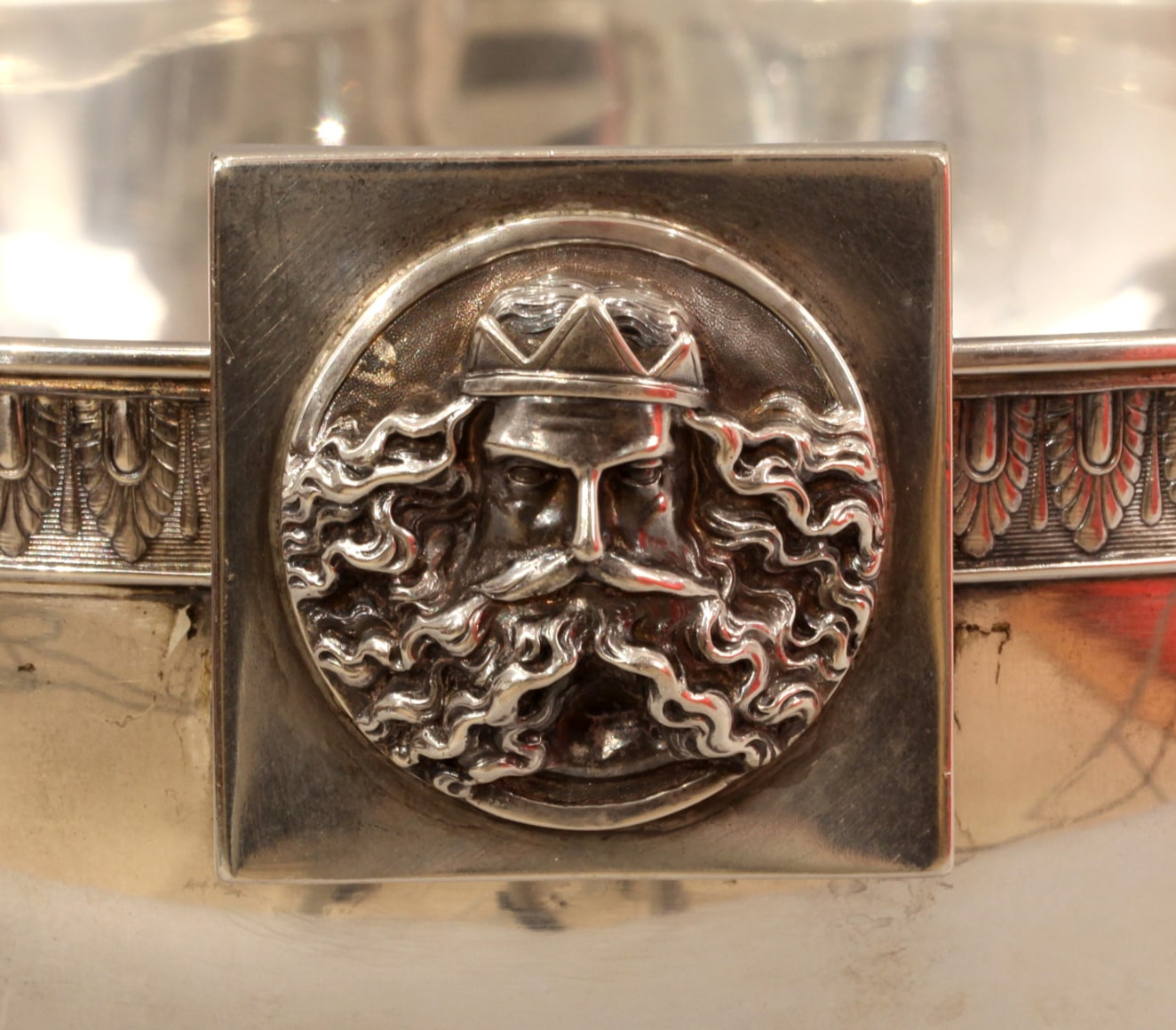 Extremely rare and importan sterling presentation silver puch bowl signed on the bottom 'Tiffany & Co., above 1970, above QUALITY 925.1000 and flanked by a pair of 'M', above the numeral 5950 above Union Square' and dated on the inscription August 11th and 12th 1876. The round bowl is shaped like a hemi-sphere with a beautifully engraved border above a turned bulbus shaped base with ropework border. On oppisite sides of center of the bowl are applied sterling round with square backed castings depicting Neptune's Face with large beard. Mounted on opposite sides 90 degrees from the Neptune castings are life-like shaped and detailed large sterling anchors which are attached to the bowl with square mounting plates with decorative knotted rope work. Applied to the base on opposite ends are exotic shapes sterling cast dolphins. The nautical themes created for this bowl are most appropriate given the fact that this important presentation bowl bears the fancy engraved descrition below. (Does not show proper spacing)