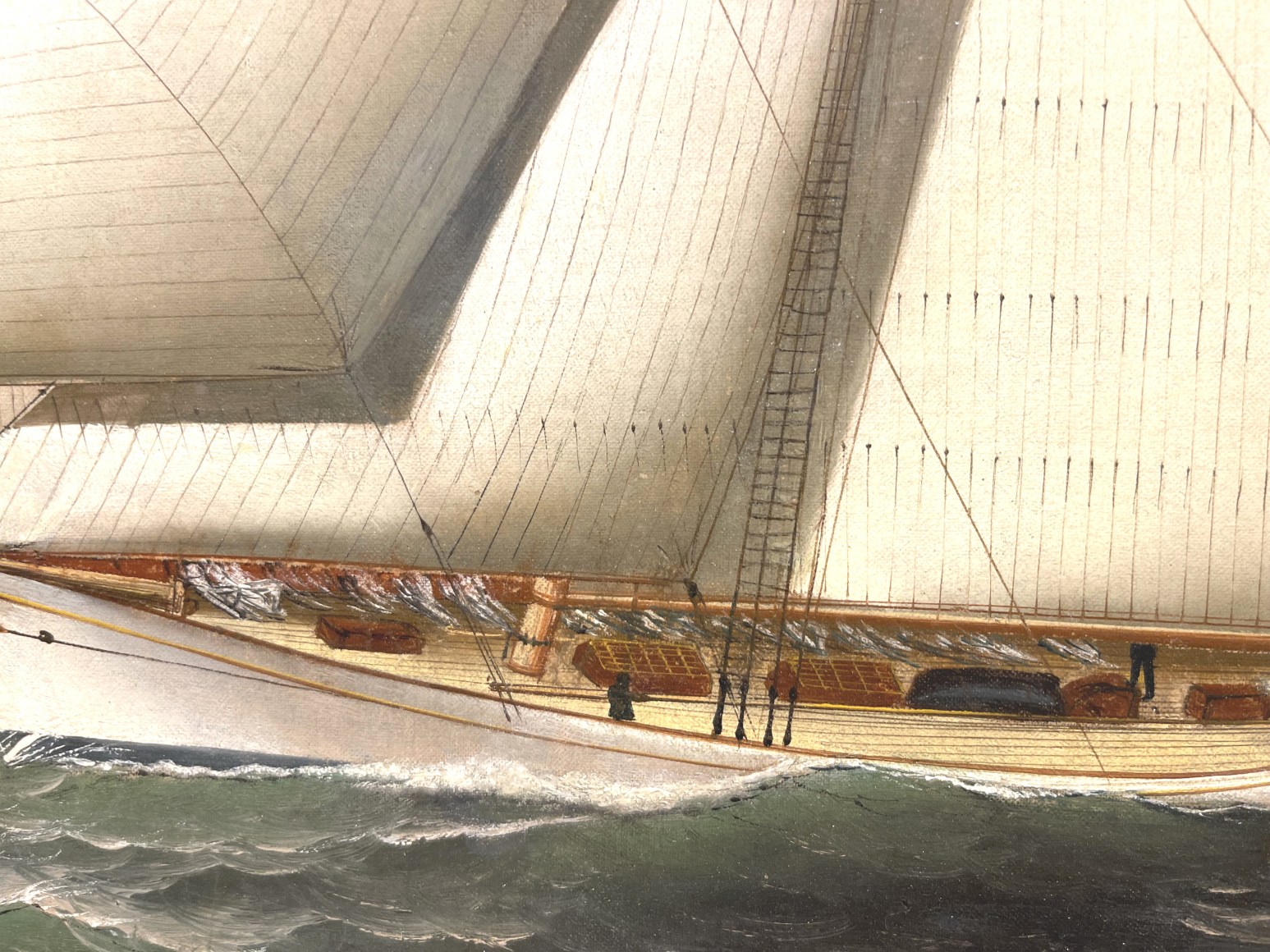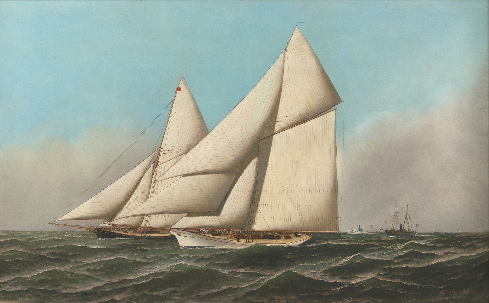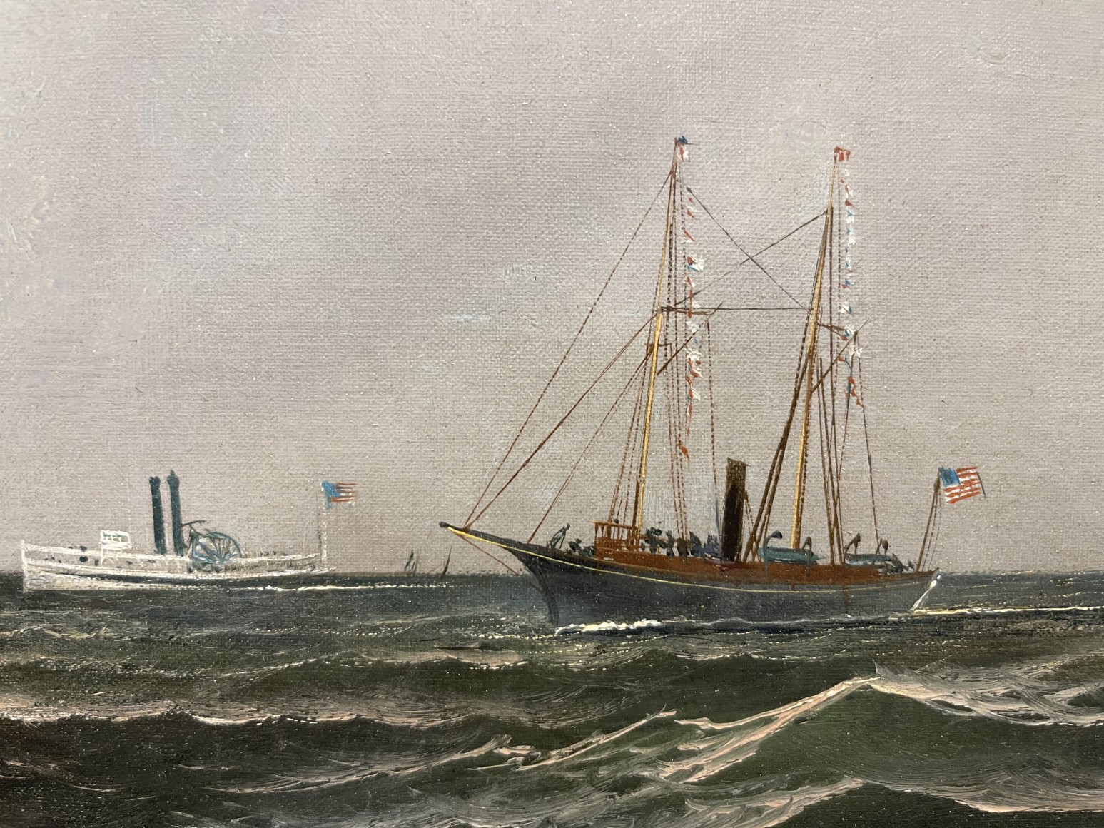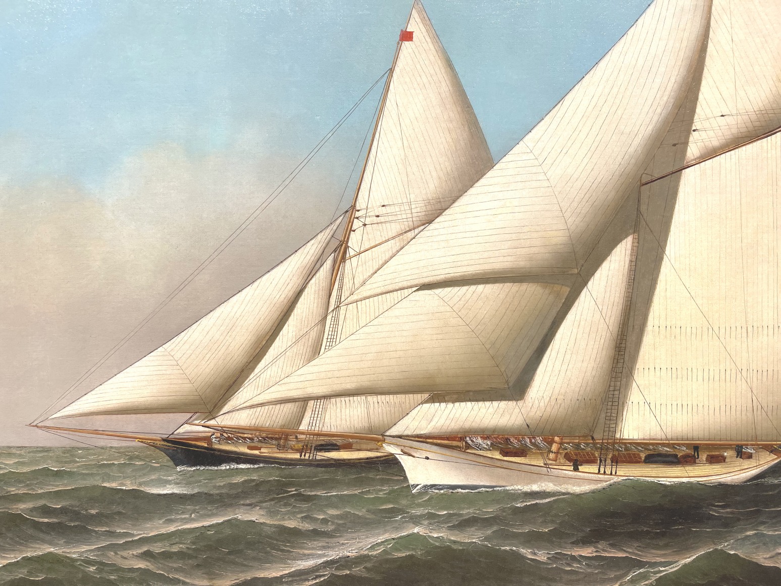 Oil on Canvas signed and dated lower right “A Jacobsen 1887”. The painting shows the black hulled “Thistle” the English Challenger neck and neck leading the American defender with the white hull Volunteer. Both vessels are painted with excellent detail and you can see a row of crew lining the port rail. The sail seams and reef points are in fine original condition. To the right of the racing yachts in the distance is the Steam Yacht Electra and a white hulled paddle wheel stammer spectating the race. The water and sky are typical of Jacobsen’s paintings of the 1880’s which is his best period for color and detail. Jacobsen’s yachting paintings are amongst his rarest subject and amongst his most sought-after subject for collectors. Jacobsen’s America’s Cup paintings are very rare and are the most desirable of his paintings. (PA1031)