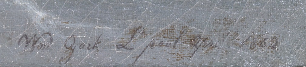 Condition: The painting looks like it is in perfect condition and was lined when it was restored a few years.. There is some scattered paint in the sky. The painting retains its original fancy corners and a gold leaf mat with arched corners.