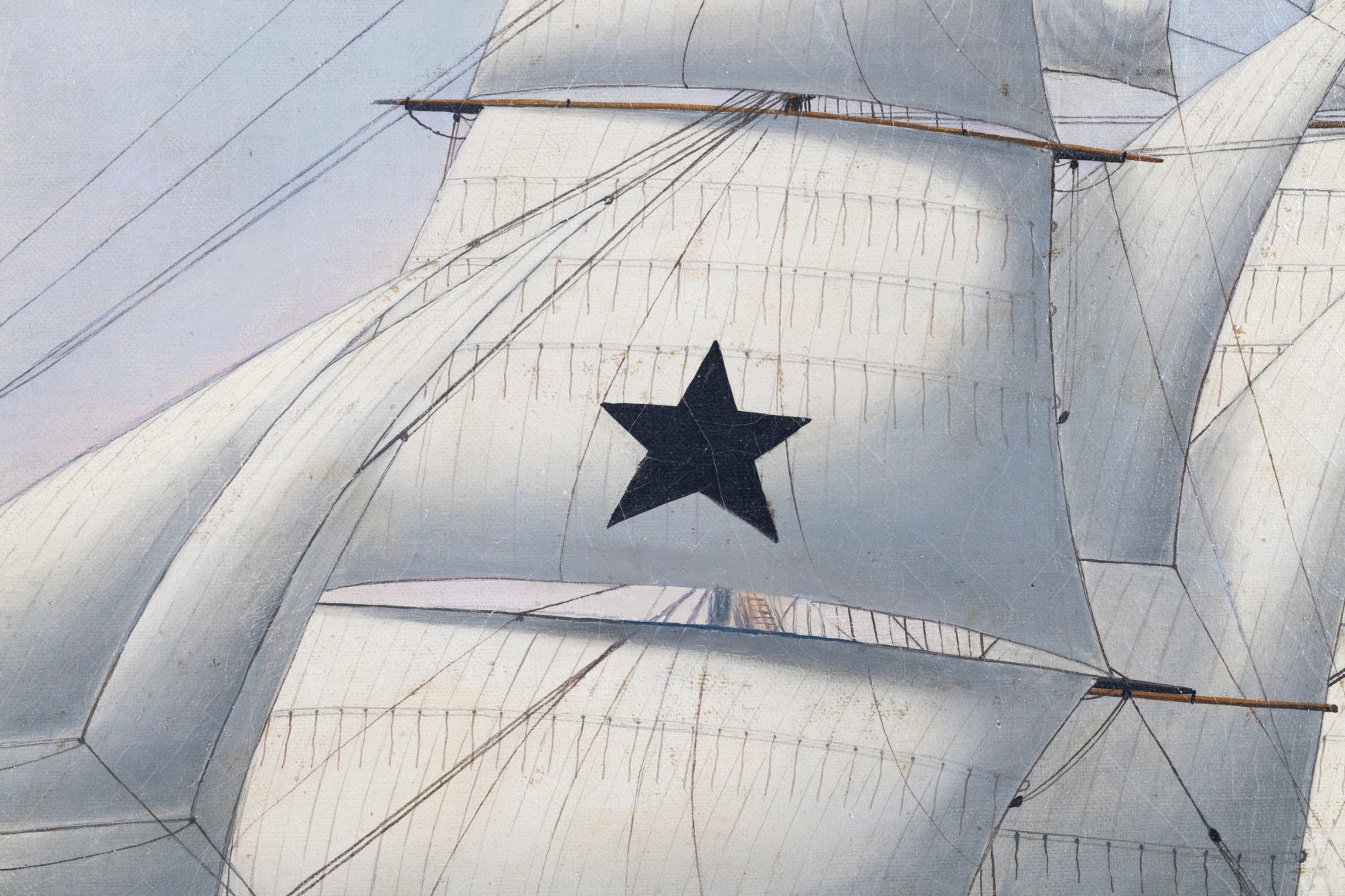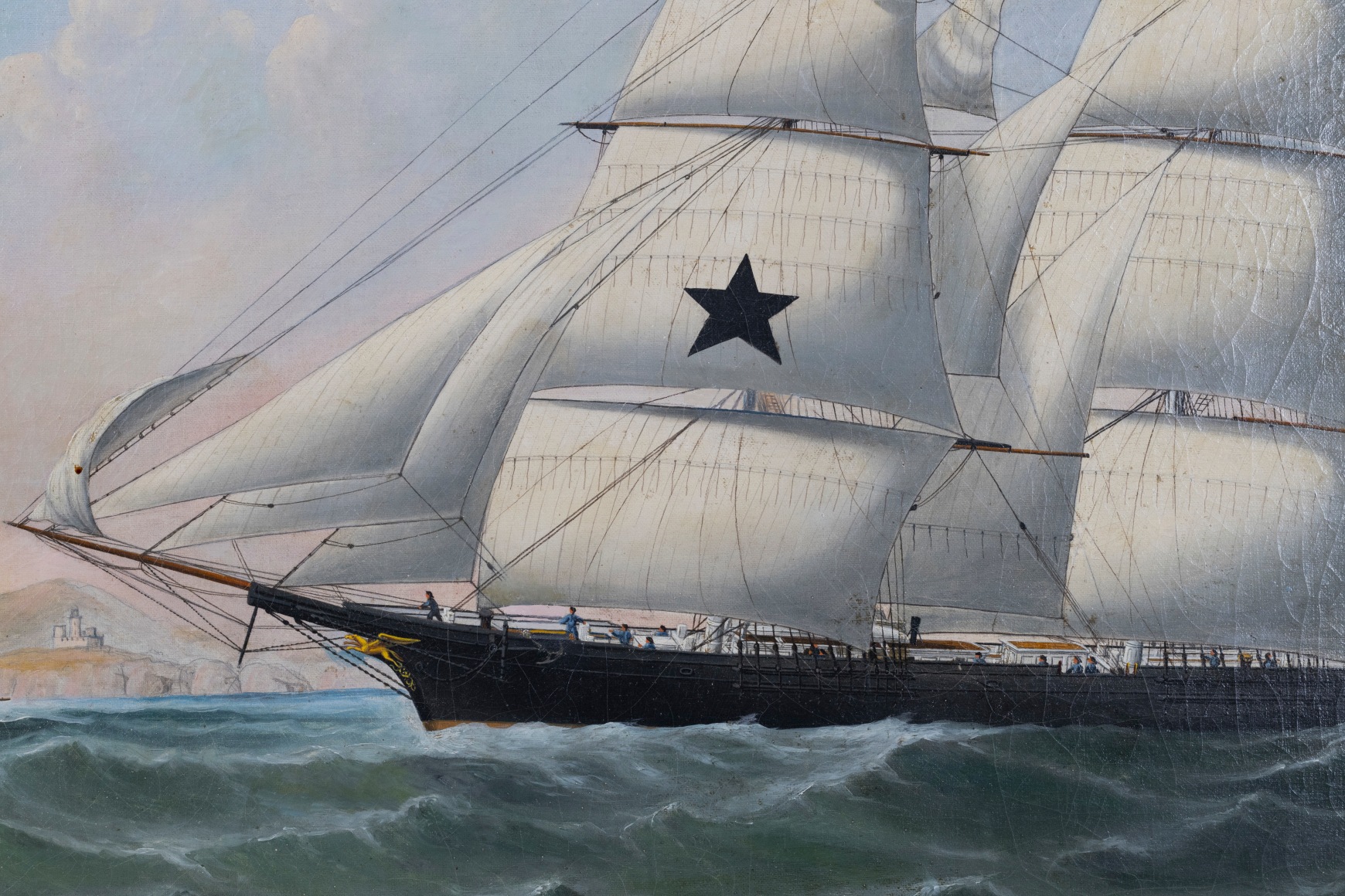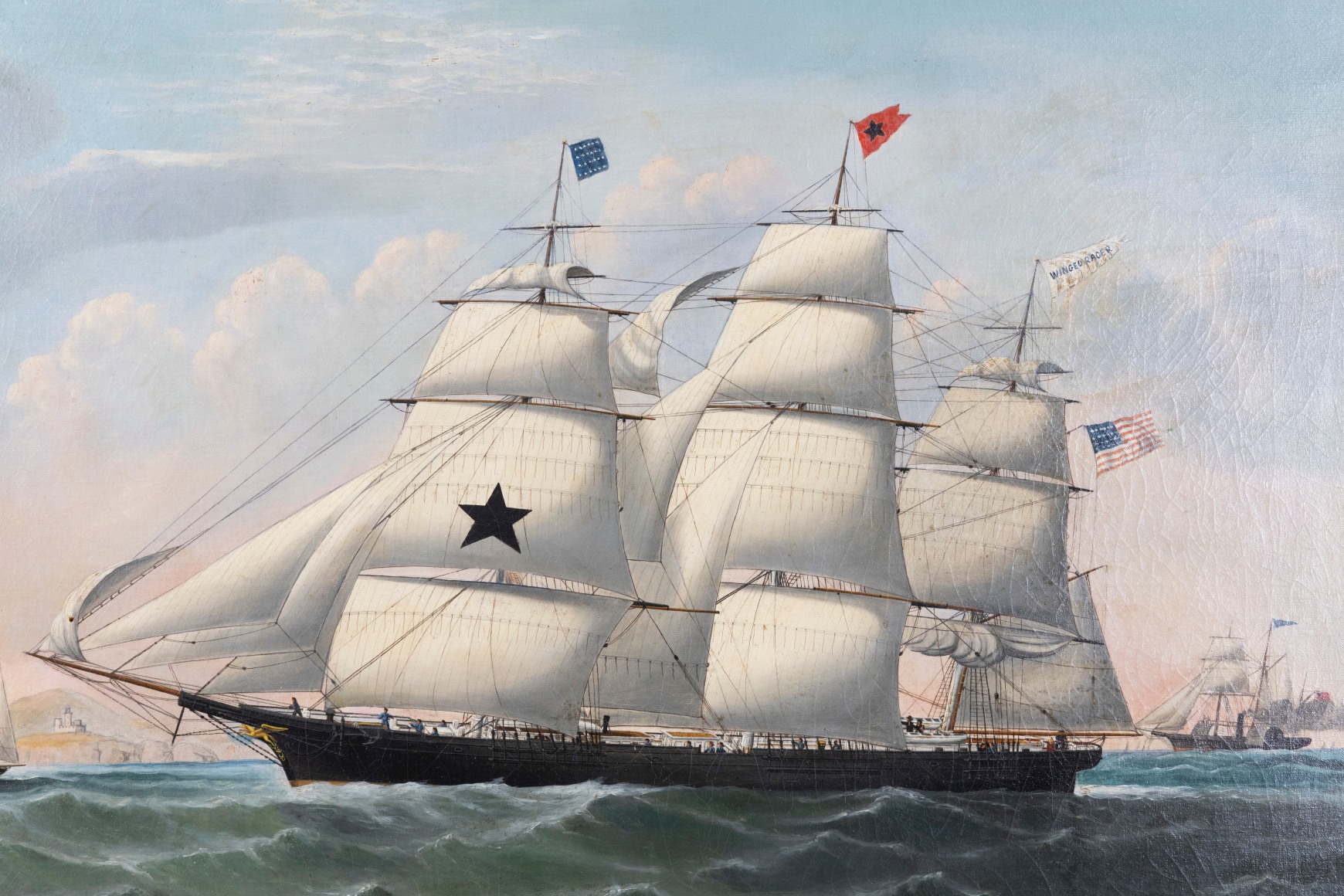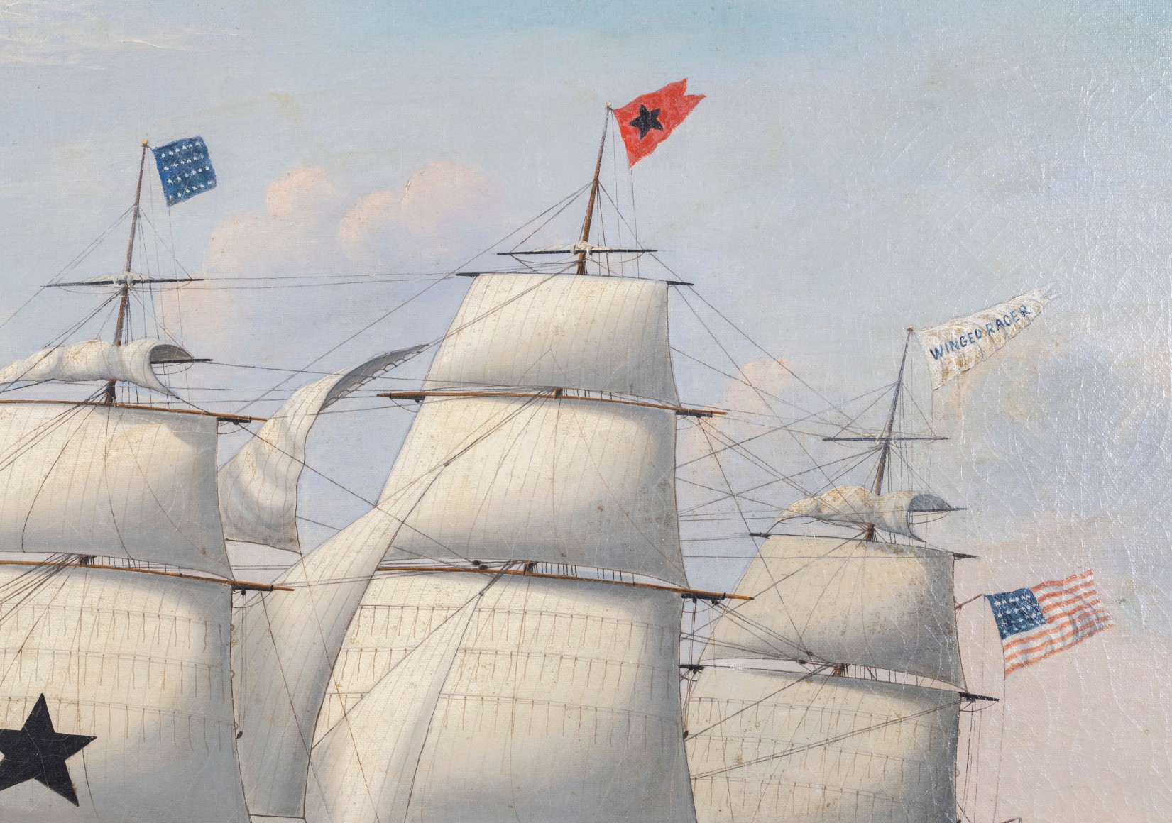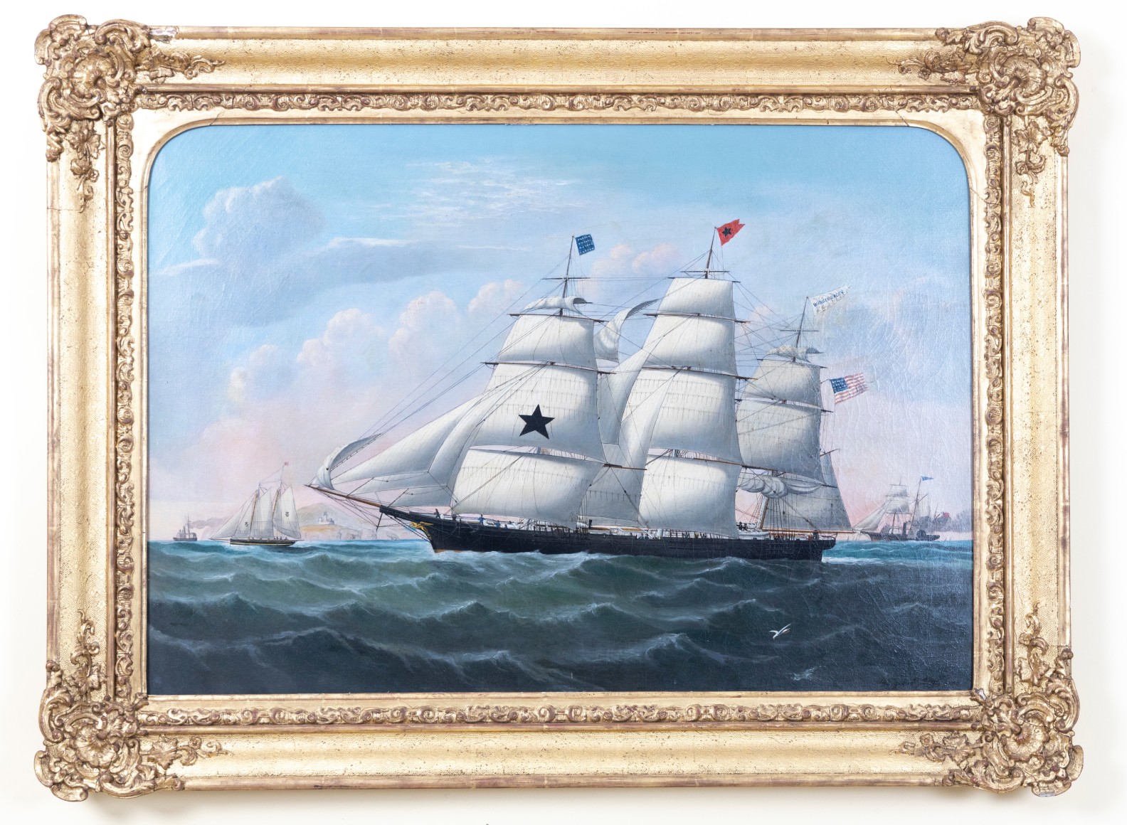 Oil on canvas painting of the American ship "Winged Racer" coming into Liverpool signed and dated "William G. York LPoll 1862". The painting is a fine example of  a York painting of an American Clipper Ship. The painting depicts a port view of the ship "Winged Racer" which is passing Holyhead on the route to Liverpool. The ship is under full sale and there is a large black 5-pointed star painted on the second from the bottom sail on the fore mast.  On the peak of the fore mast is a blue flag which is the American merchant flag. On the main mast is a red flag with a black five-pointed star which is the house flag for the Black Star Line. Flying off the gaff is the American flag. To the right is a steam sail ship and to the left are 2 sailing ships. The painting is a fine example of a William York painting.