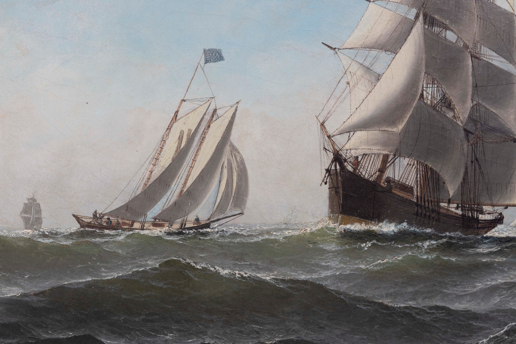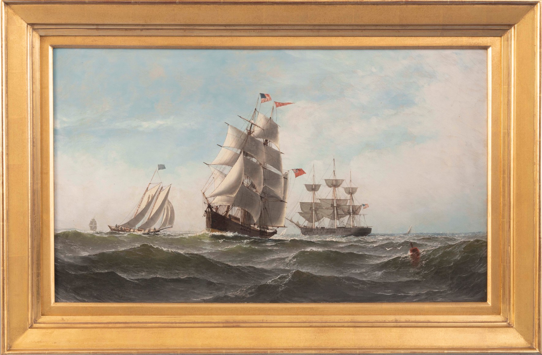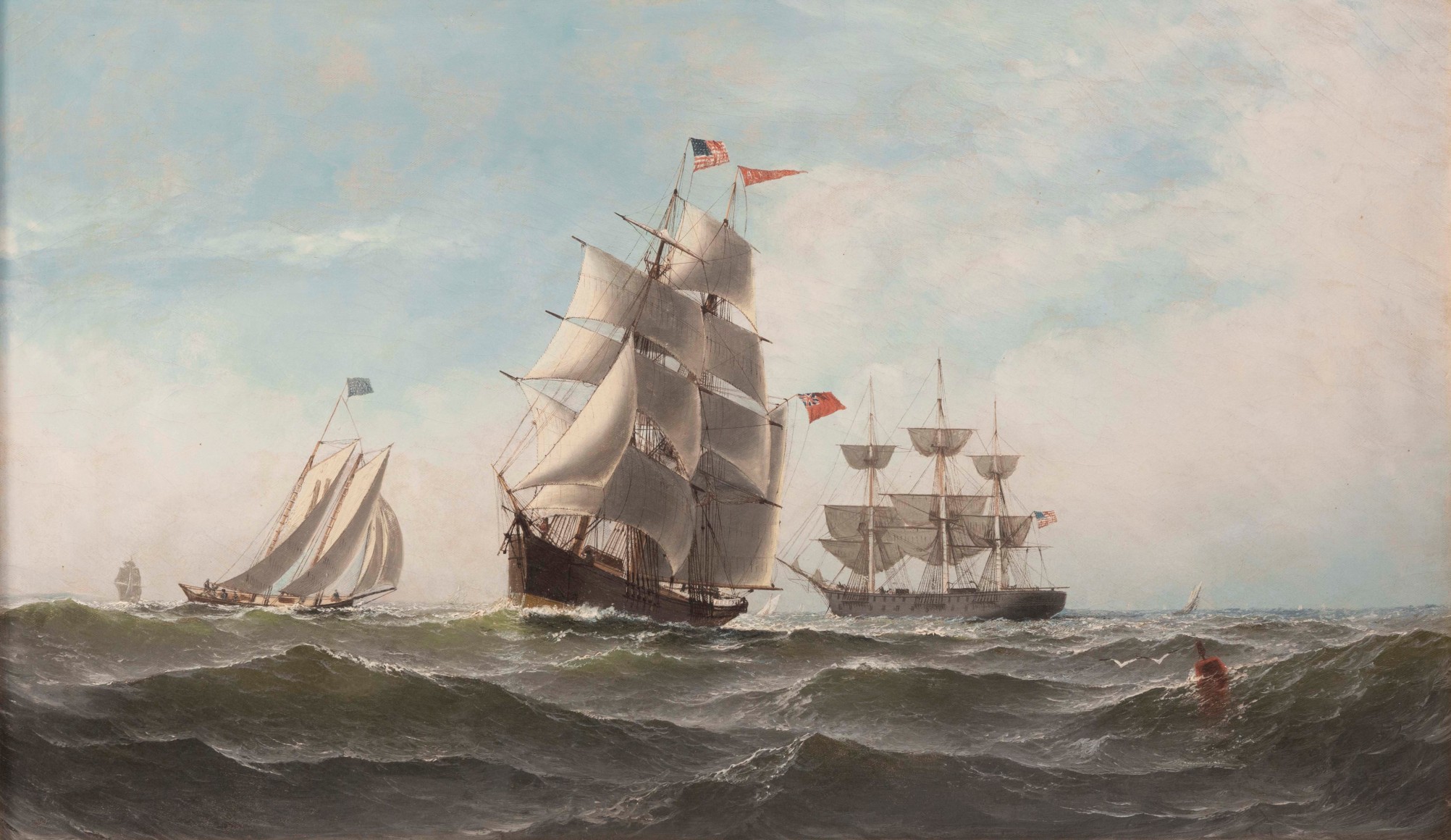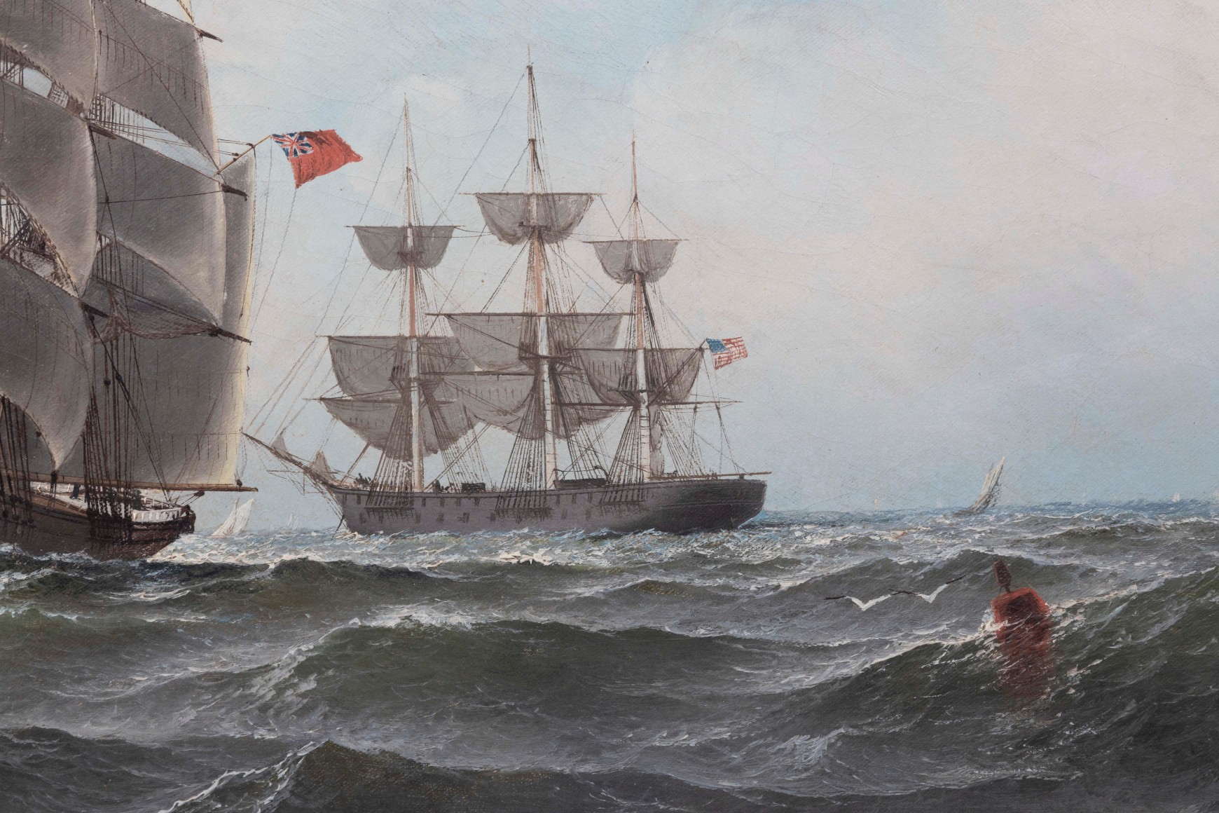 Oil on canvas depicting the ship "Albania" with pilot boat 11 off New York Harbor. The painting is a rare subject featuring three primary vessels, circa 1878. The “Albania is flying an American flag from her fore mast and a red pennant with the vessel's name from her main mast and an English flag from her gaff. To her left is a pilot schooner with the somewhat obscure number “11” on her main sail. She is flying the Union Jack from her main mast. To the right is a naval vessel at anchor flying an American flag. In the right foreground is a red buoy.  The water is beautifully painted and is similar to the type of water Jacobsen painted in the late 1870's. The sky is a bright robin’s egg blue with scattered white clouds. This is one of the more artistic paintings we have examined by Jacobsen with the boats sailing in different angles and directions rather than a typical profile. (PA1026)