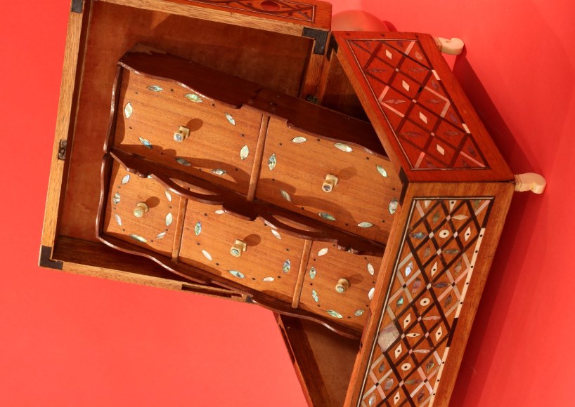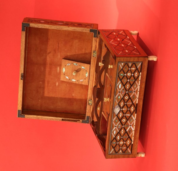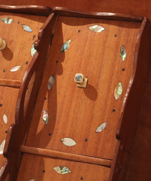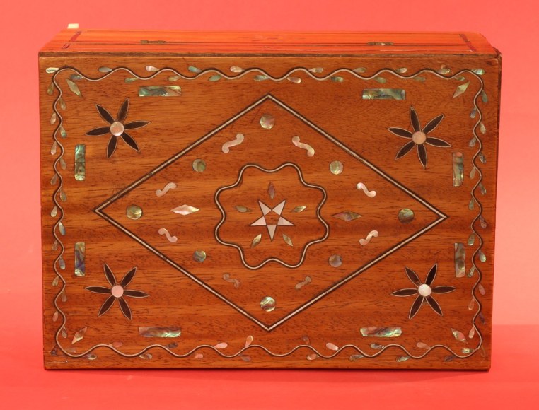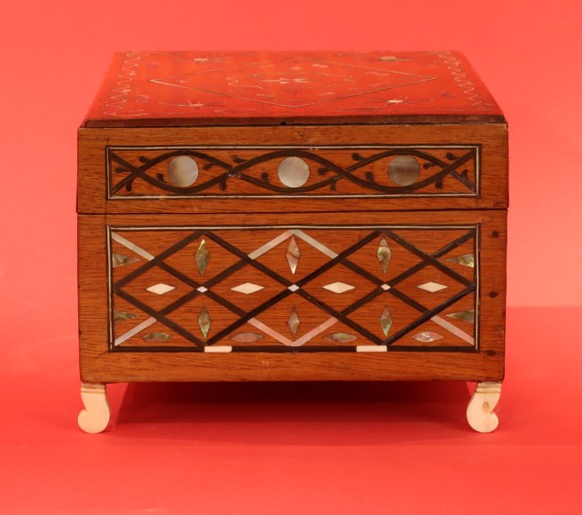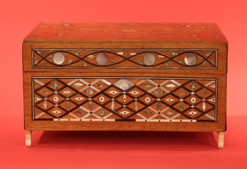 Outstanding inlaid sewing box with fitted removable tray, American, circa 1860. The front and sides have an elaborate matching pattern with three rows of connected diamond shapes made from baleen, mother of pearl and abalone shell. The centers of the diamonds have small inlays of various shapes and of the same materials as the diamonds. The back of the box is also inlaid with baleen borders with an inlaid abalone shell flower design at the center. The front and sides of the lid have rectangular inlaid panels with thin inlaid borders of baleen and ivory. Within the panels is a baleen inlaid "eye" shaped pattern with mother of pearl and abalone disK inlays at the center of each "eye." The top of the box has a wavy border of thin baleen and ivory with a small inlaid abalone leaves creating a border that appears like a vine. The center of the lid has an ivory and baleen inlaid diamond with elaborate inlaid patterns within. At each corner of the lid inside the border are inlaid flower designs made with inlaid baleen, ivory and abalone shell and flaked on each side with small abalone rectangular inlays. The lid hinges back exposing a mahogany lift-out tray with five compartments each having a lid. The lids retain the original ivory pulls and diamond inlay. Each corner of the top of the box and the opposing bottom of the lid have inlaid tortoise shell corners. The box sits on its four original curved shaved whale ivory feet. (SC-1063)