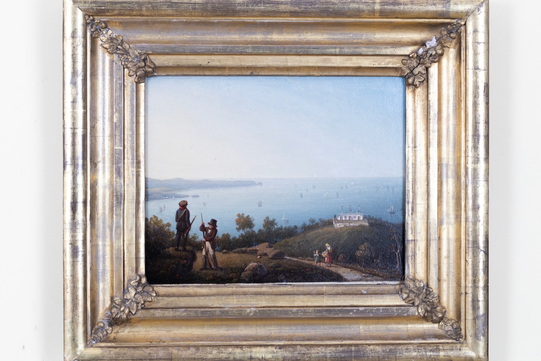 Oil on board, titled in pencil on the back “View of Holyhead” attributed to Robert Salmon, English, circa 1830. The painting depicts a beautiful vista from the top of a tall hill looking down on the coast and the sea beyond. At the top of the hill are 2 well-dressed hunters with their rifles. To the right is a meandering road leading down to the water. To the right is a mother and daughter walking down the harbor in colorful red, white and blue clothing. Further to the right on a lower hill is a building in a raised deck; it may be a signaling station for mariners with its three poles. To the left one views the meandering coast line and ahead one sees out to sea. There are many sailing craft dotting the sea. The painting is a fine example of a Salmon coastal painting. The figures and many of the other elements of the painting are typical of Salmon. Another very similar painting by Salmon is titled "South Stack Lighthouse and Holyhead Signal Station, Anglesey, Wales 1842. (PA1063)