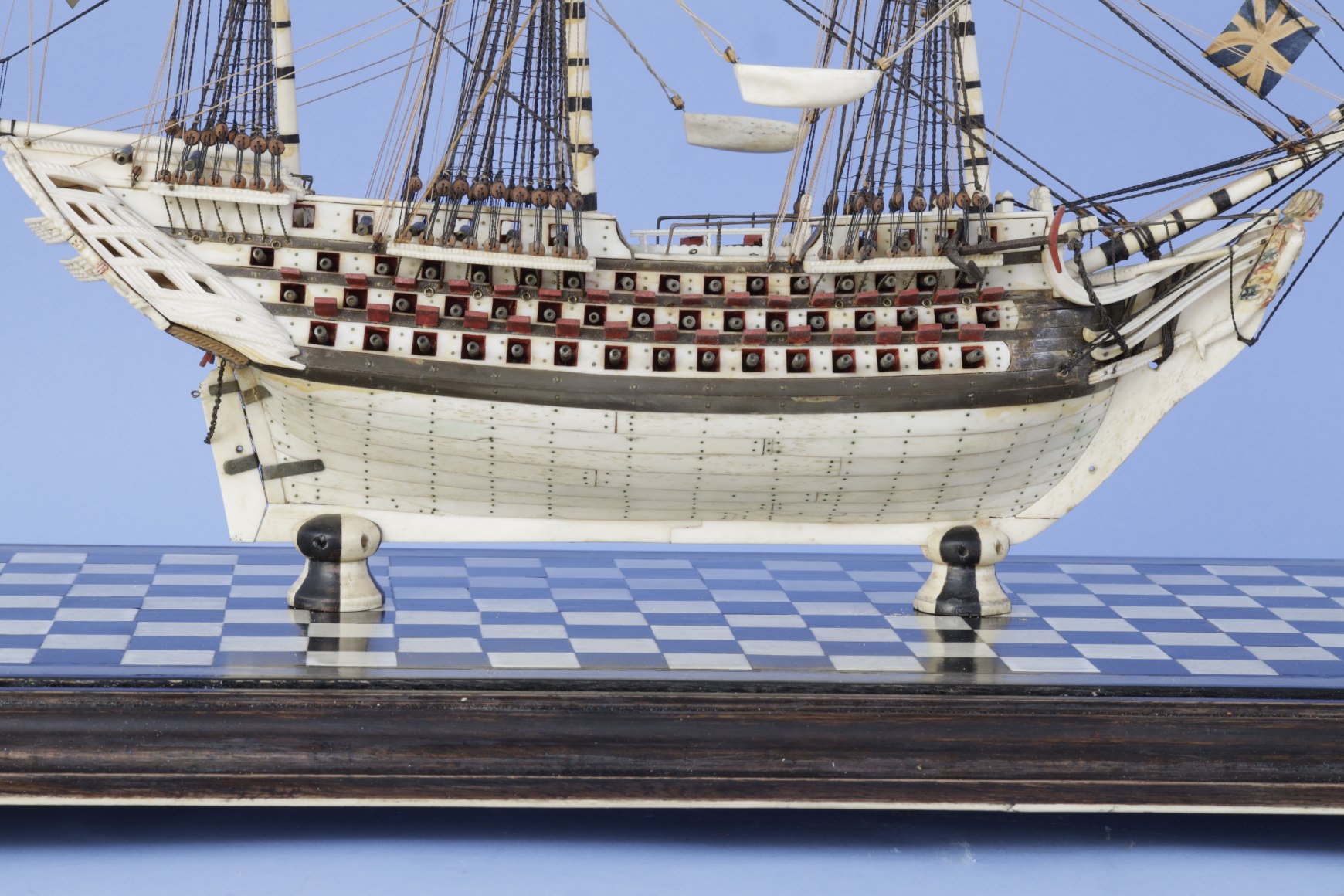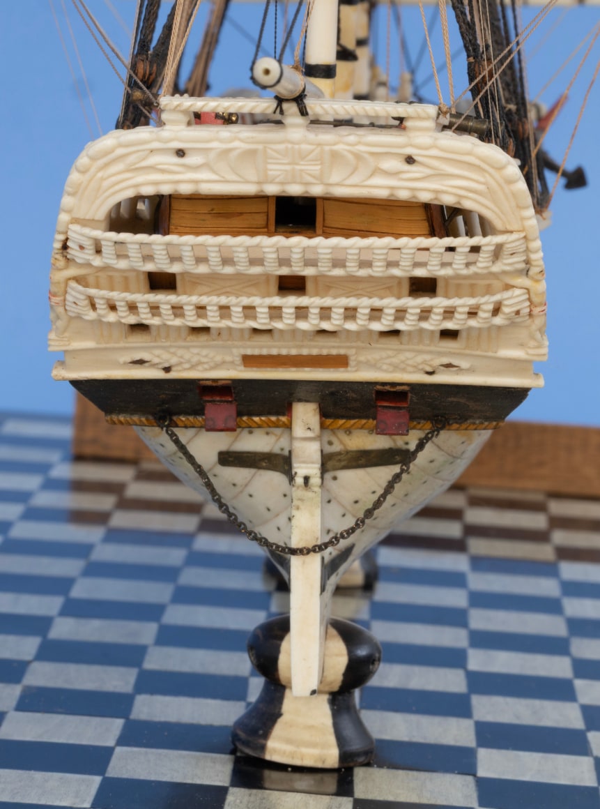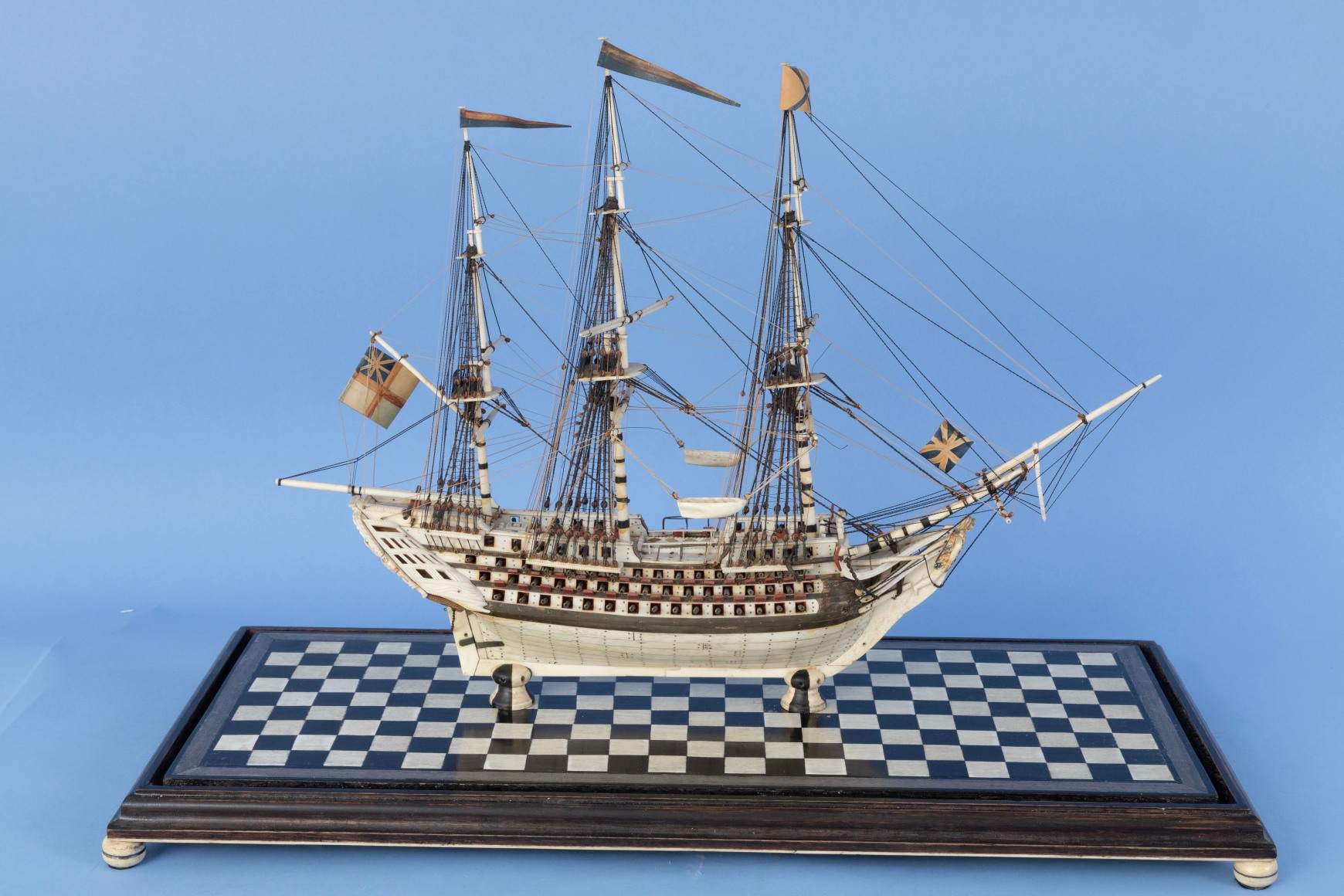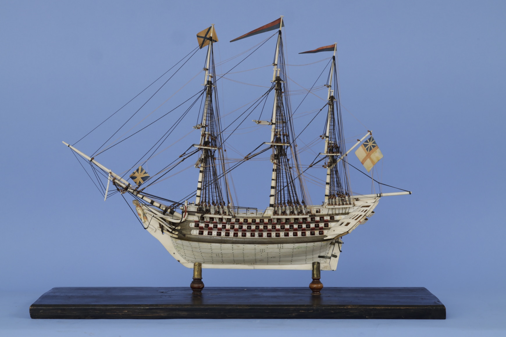 Planked POW Bone model of a British Triple Decker with Baleen Inlay between Cannon rows. The ship is mounted with the same number of canons per row on port and starboard sides. There are 24 deck mounted cannons and there are 106 additional cannons shared between the three rows of cannon that come through the hull. All the cannons in the hull have red painted cannon doors. All the spars are bone, and the model is fully rigged with excellent attention to detail. There is a finely carved and polychrome full figure of a man in military uniformed soldier as the figurehead mounted on the bow. The stern galleries and quarter galleries are carved with fine detail. There are colorful flags flying from the peak of each mast. The model has a finely planked base which is set into an old and possibly original case.