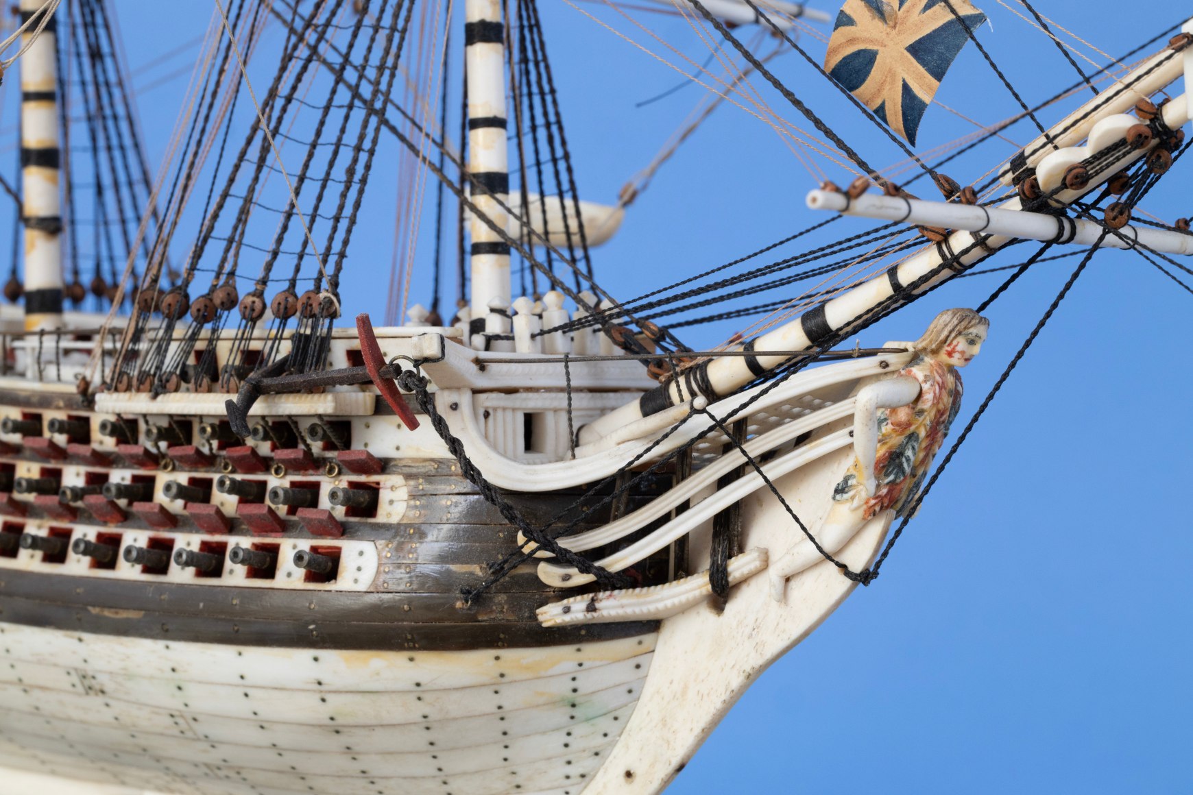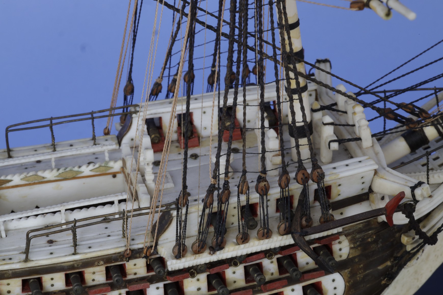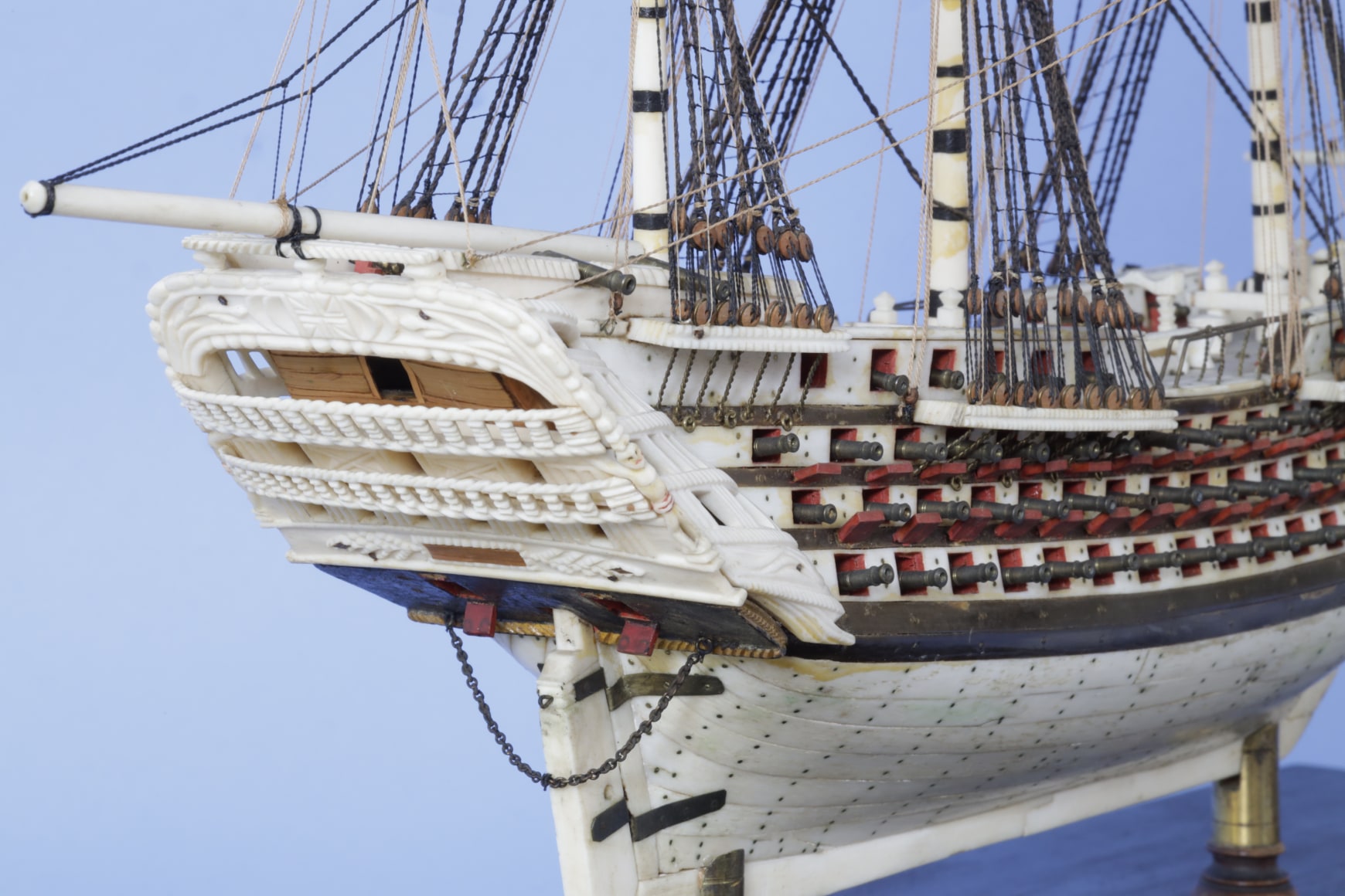Planked POW Bone model of a British Triple Decker with Baleen Inlay between Cannon rows. The ship is mounted with the same number of canons per row on port and starboard sides. There are 24 deck mounted cannons and there are 106 additional cannons shared between the three rows of cannon that come through the hull. All the cannons in the hull have red painted cannon doors. All the spars are bone, and the model is fully rigged with excellent attention to detail. There is a finely carved and polychrome full figure of a man in military uniformed soldier as the figurehead mounted on the bow. The stern galleries and quarter galleries are carved with fine detail. There are colorful flags flying from the peak of each mast. The model has a finely planked base which is set into an old and possibly original case.