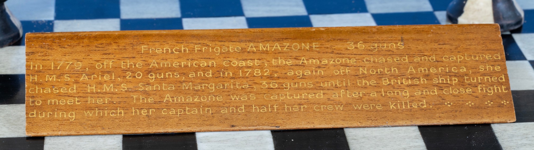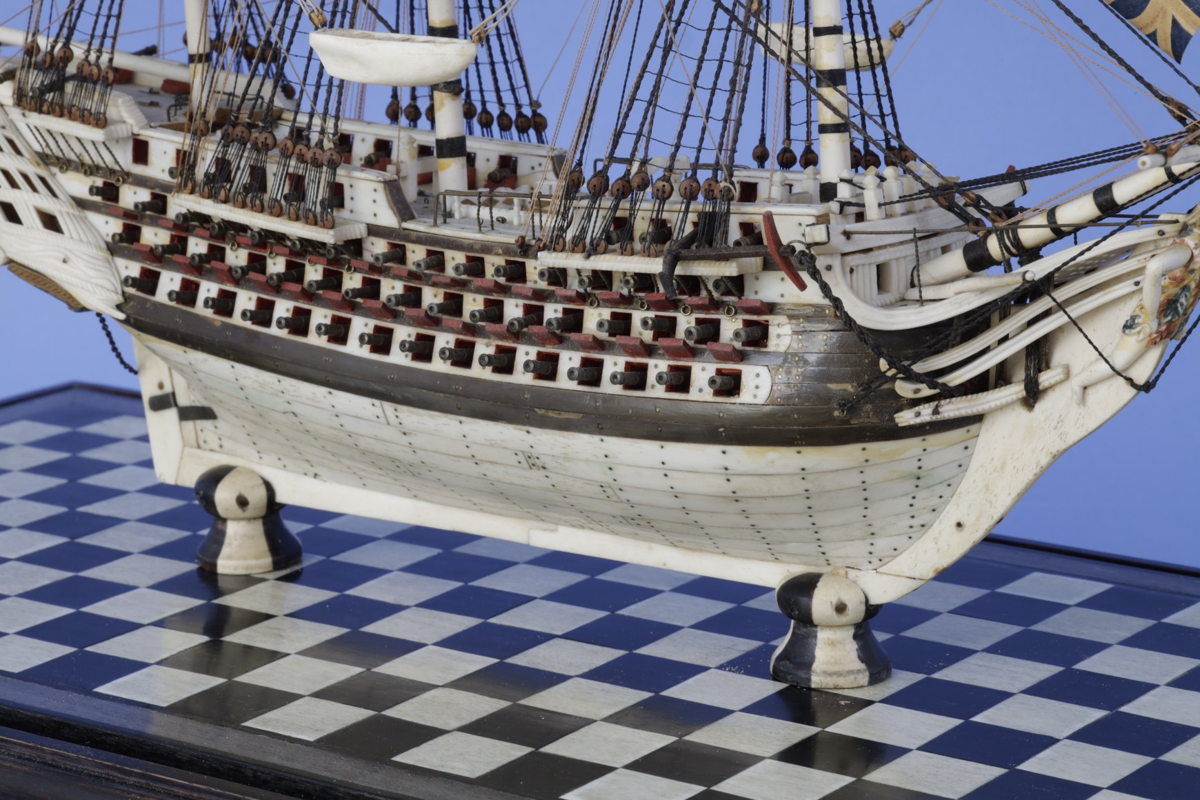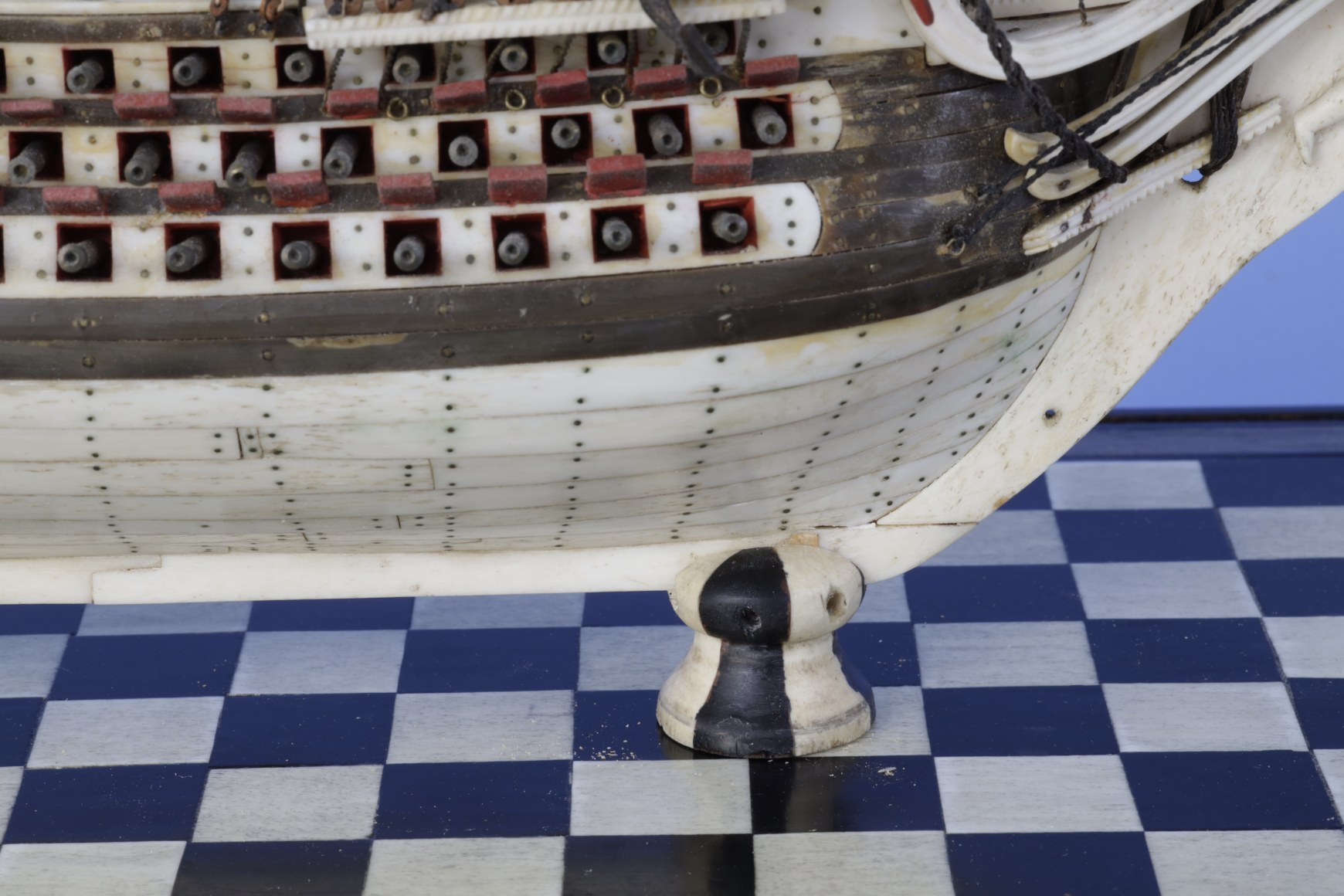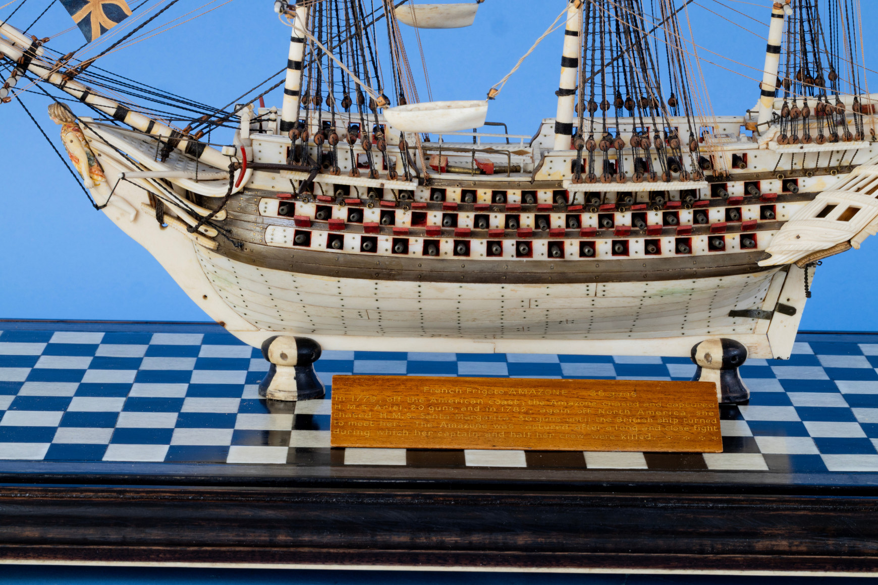 Planked POW Bone model of a British Triple Decker with Baleen Inlay between Cannon rows. The ship is mounted with the same number of canons per row on port and starboard sides. There are 24 deck mounted cannons and there are 106 additional cannons shared between the three rows of cannon that come through the hull. All the cannons in the hull have red painted cannon doors. All the spars are bone, and the model is fully rigged with excellent attention to detail. There is a finely carved and polychrome full figure of a man in military uniformed soldier as the figurehead mounted on the bow. The stern galleries and quarter galleries are carved with fine detail. There are colorful flags flying from the peak of each mast. The model has a finely planked base which is set into an old and possibly original case.