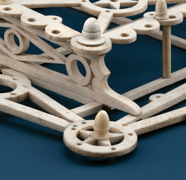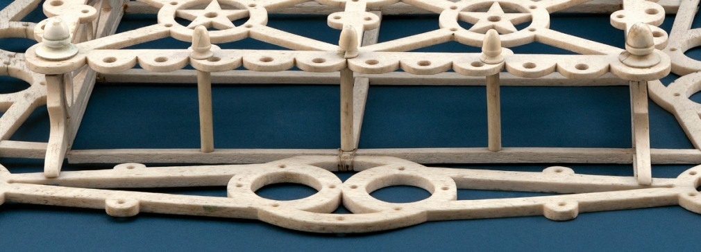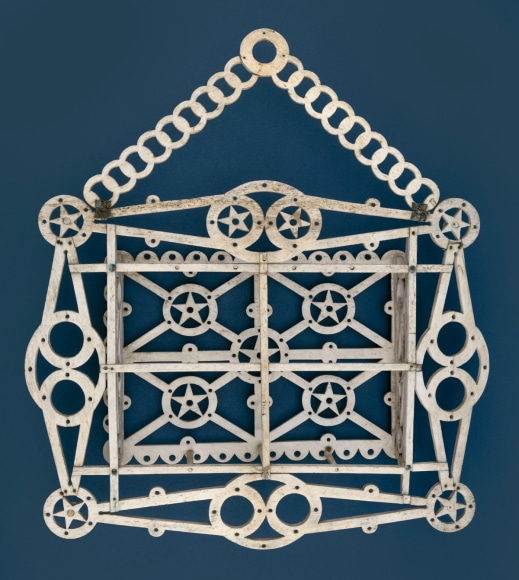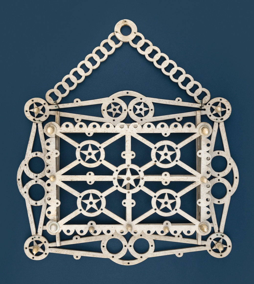 VERY FINE AND RARE WHALEBONE SCRIMSHAW WALL POCKET, NANTUCKET, MASSACHUSETTS, CIRCA 1870 mounted on a later carved wood and parcial-ebonized frame; together with documents from a whale ship. A unique tour de force, it is one of the largest genuine single pieces of scrimshaw in existence. The wall pocket mounted on the wall and used to hold newspapers, letters and magazines. It was constructed by sectioning very large slabs of whalebone from the panbone and working them into extremely complex, open-carved pieces, which were joined with copper rivets and pins. A unique tour de force, it is one of the largest scrimshaw items constructed entirely out of whalebone and whale ivory in a single piece of scrimshaw in existence.