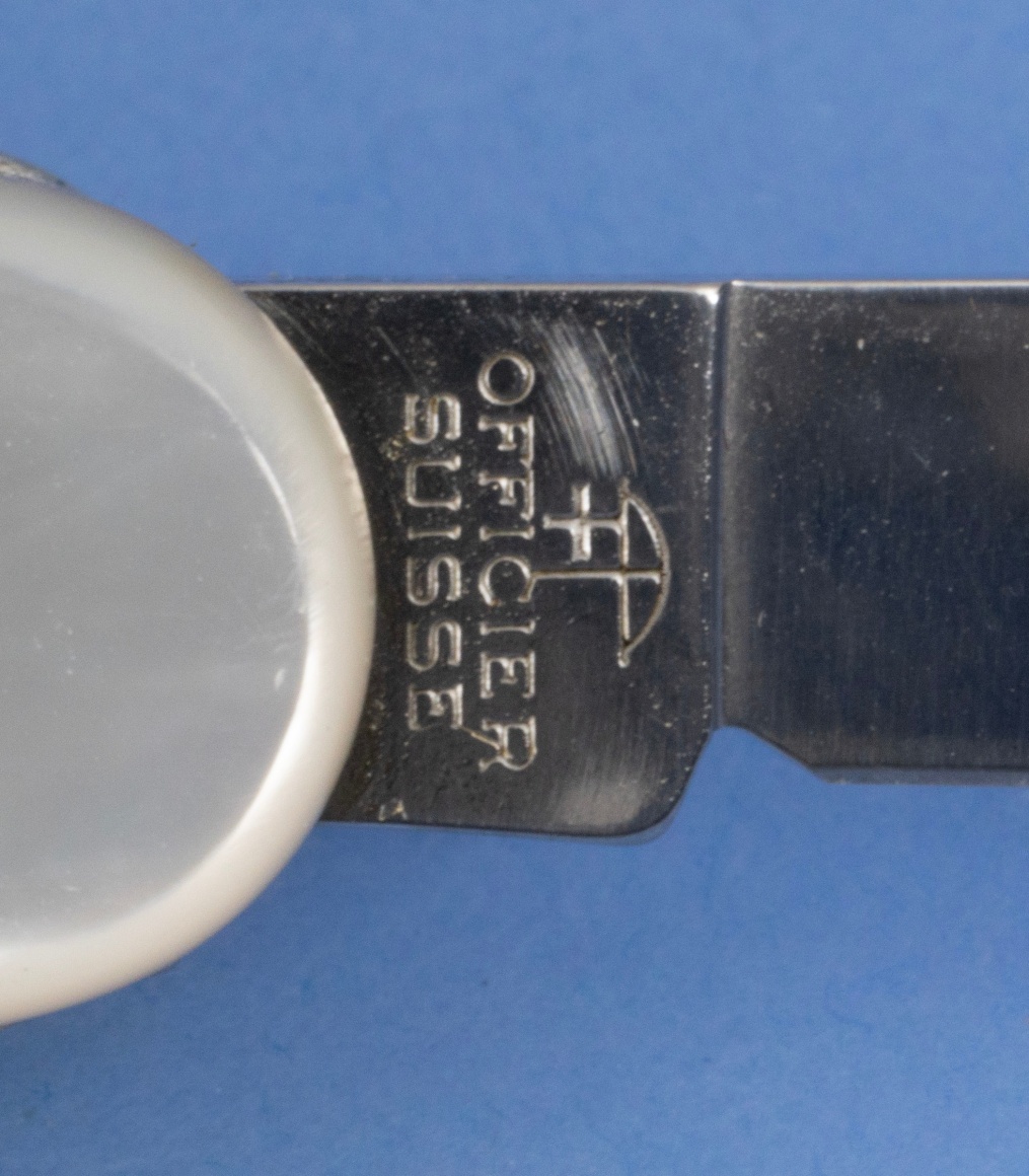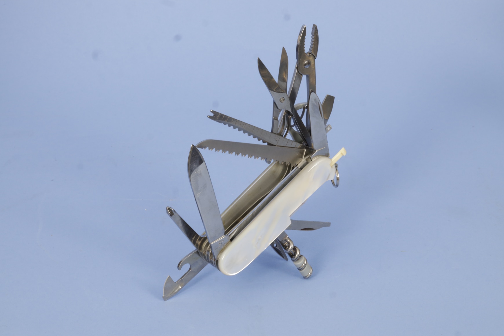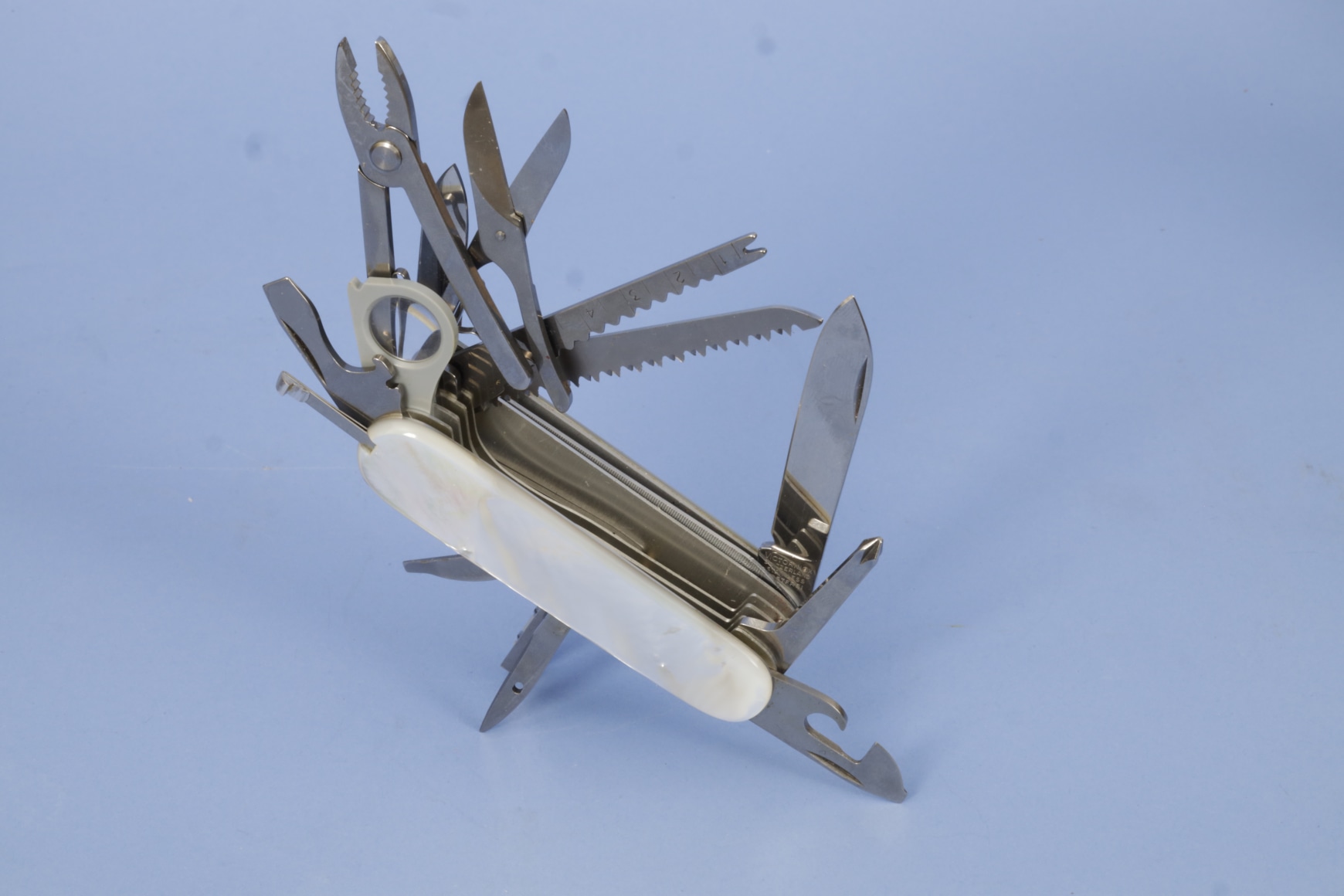 Multi blade Swiss Army Knife signed Victorinox Switzerland, Stainless Rostferei on the main blade model . The knife has attractive and very rare mother-of-pearl scales. The top of the knife has 8 fold-out blades and the opposite side has 4 blades. The top side of the knife has a toothpick and tweezers that pull out from the bottom of the scales. The knife has a black leather case signed Victorinox with a Velcro folding tongue, a belt loop and a pocket for a small flashlight and a pull out clear plexi-glass 3-inch ruler with a thermometer, magnifying glass and compass. (KN0060)
