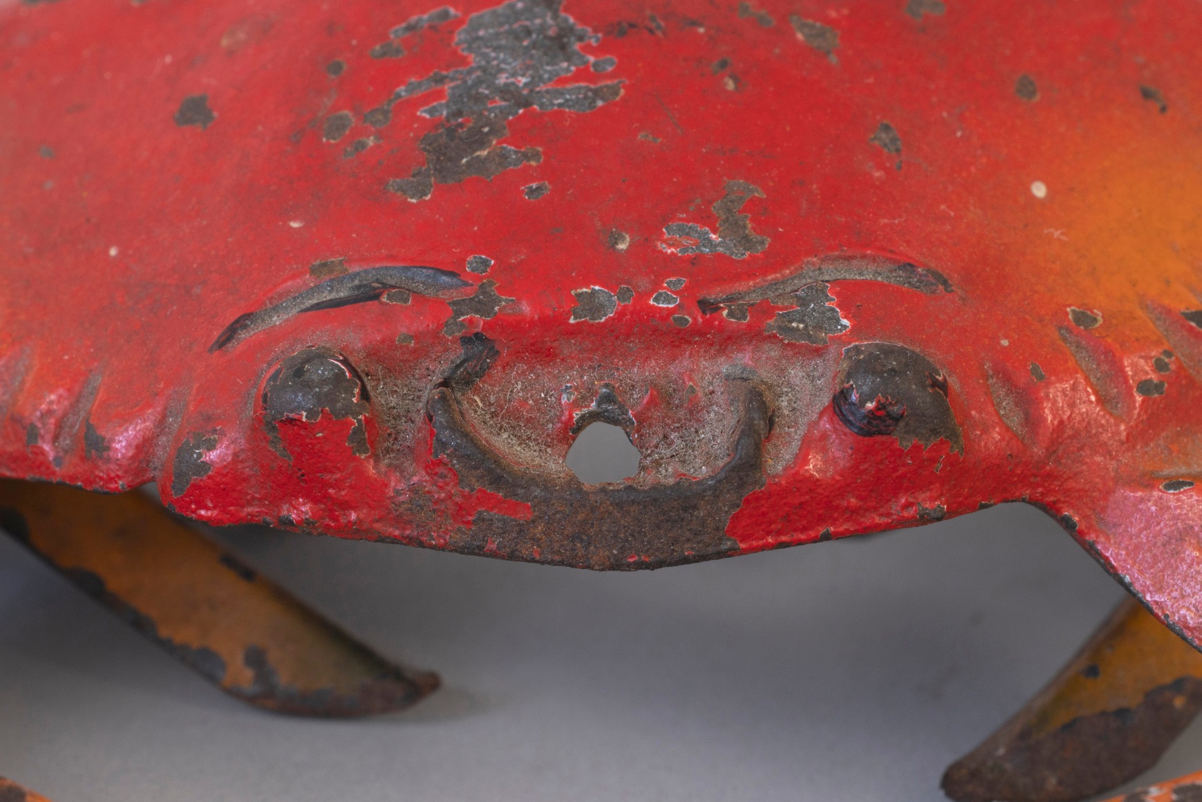 Red Painted Metal crab decoy. The decoy is life size and looks very real. It has a shaped body with a pair of eyes in the front There are 2 pairs of claws that are stationary. Between the eyes is a hole to place a string to drag the decoy.  There are two raised star like set of feet that the crab travels on as it is pulled along. (FA1129)
